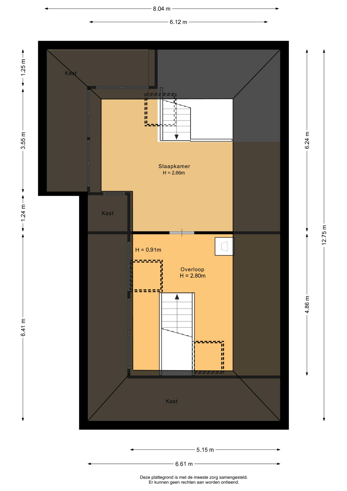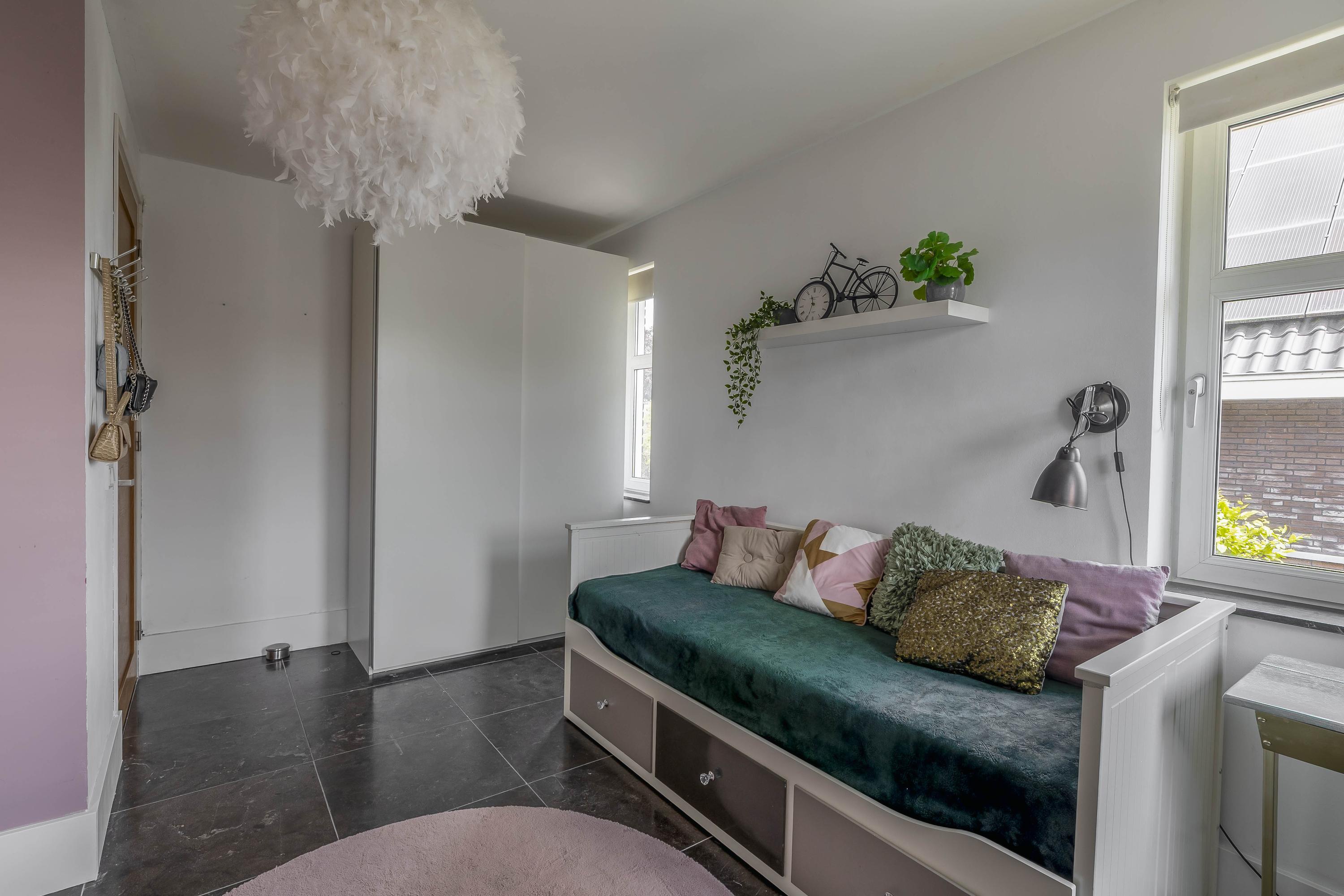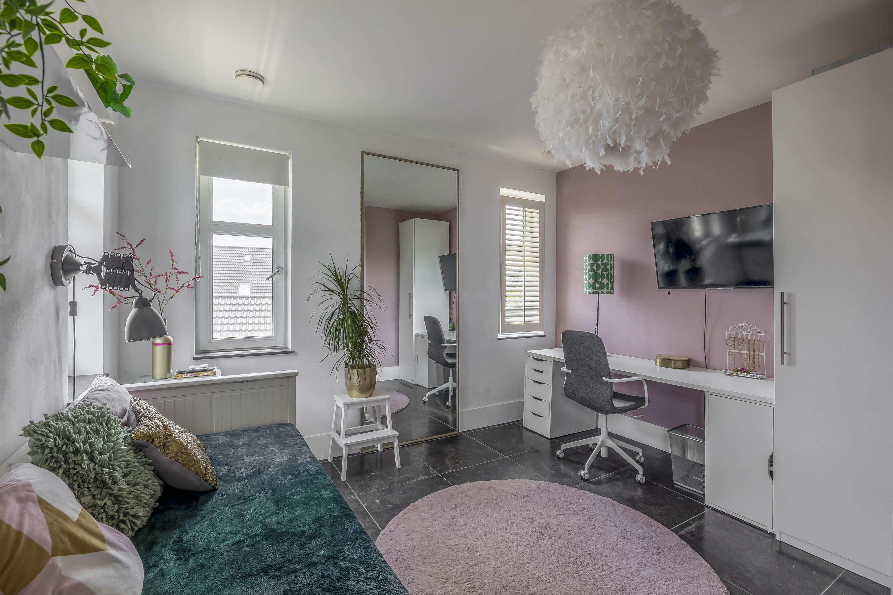Verder is deze kamer voorzien van een praktische inbouwkast met wateraansluiting en afvoer, een royale kastenwand en een steektrap die toegang biedt tot een verrassend ruime vliering.