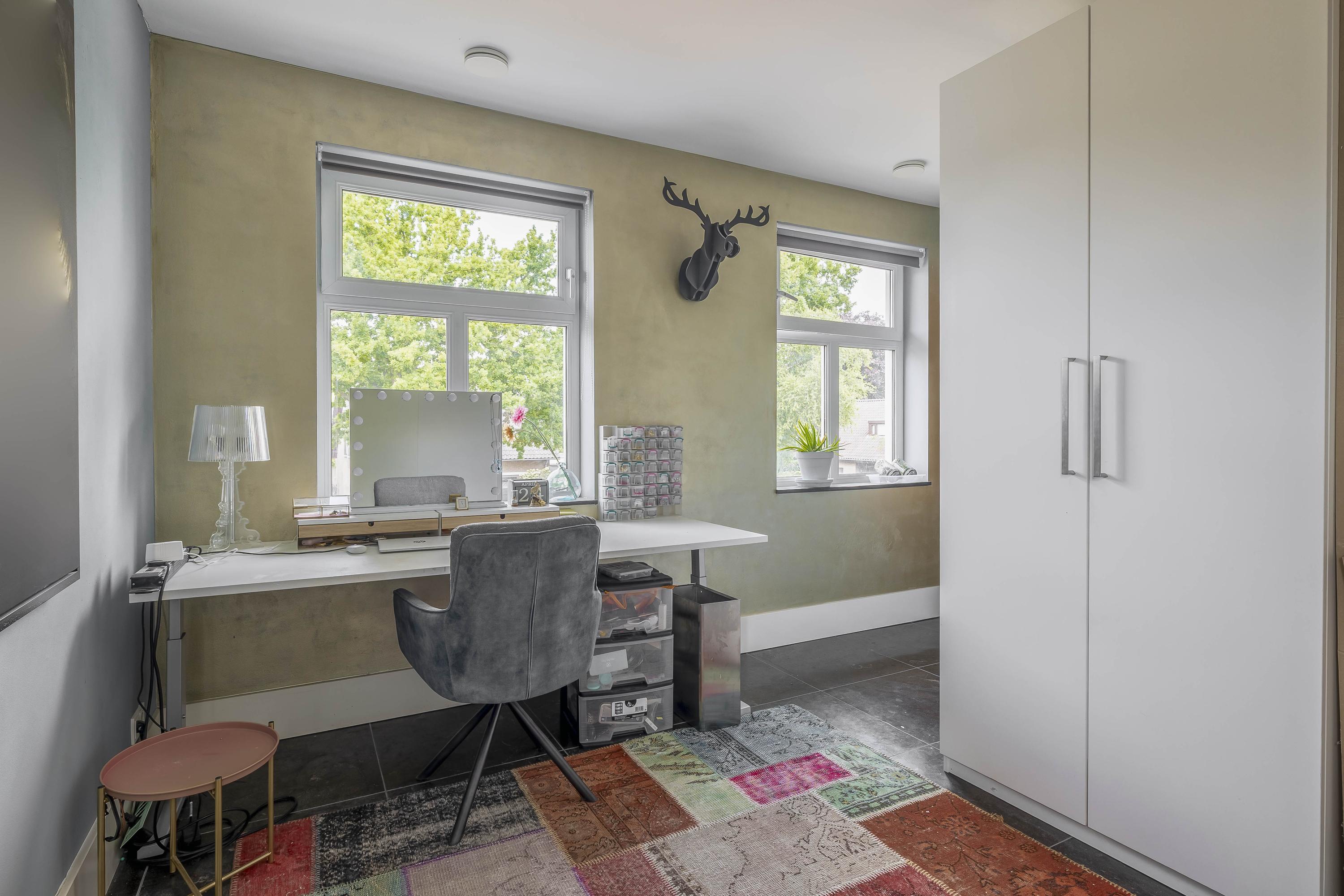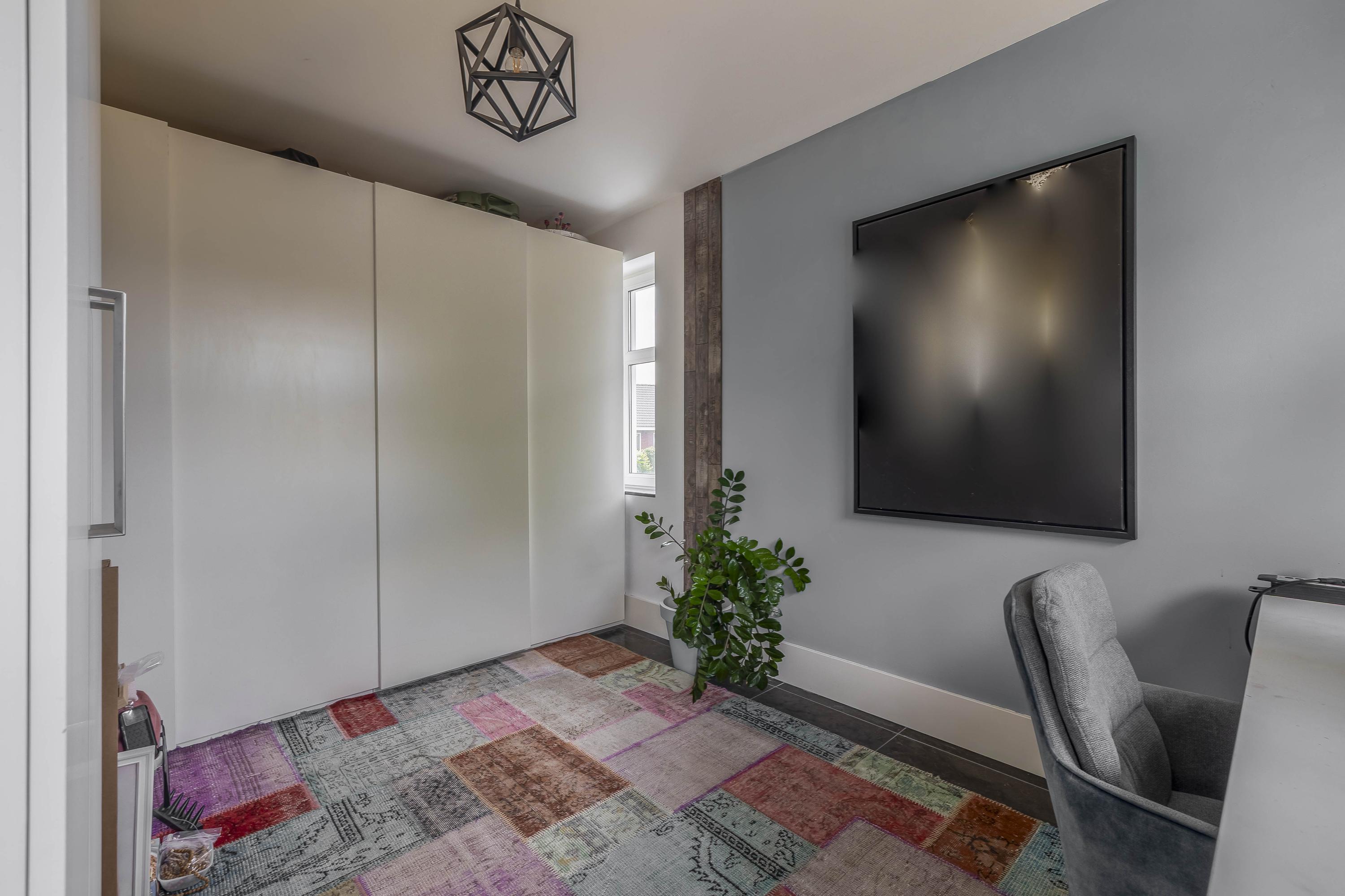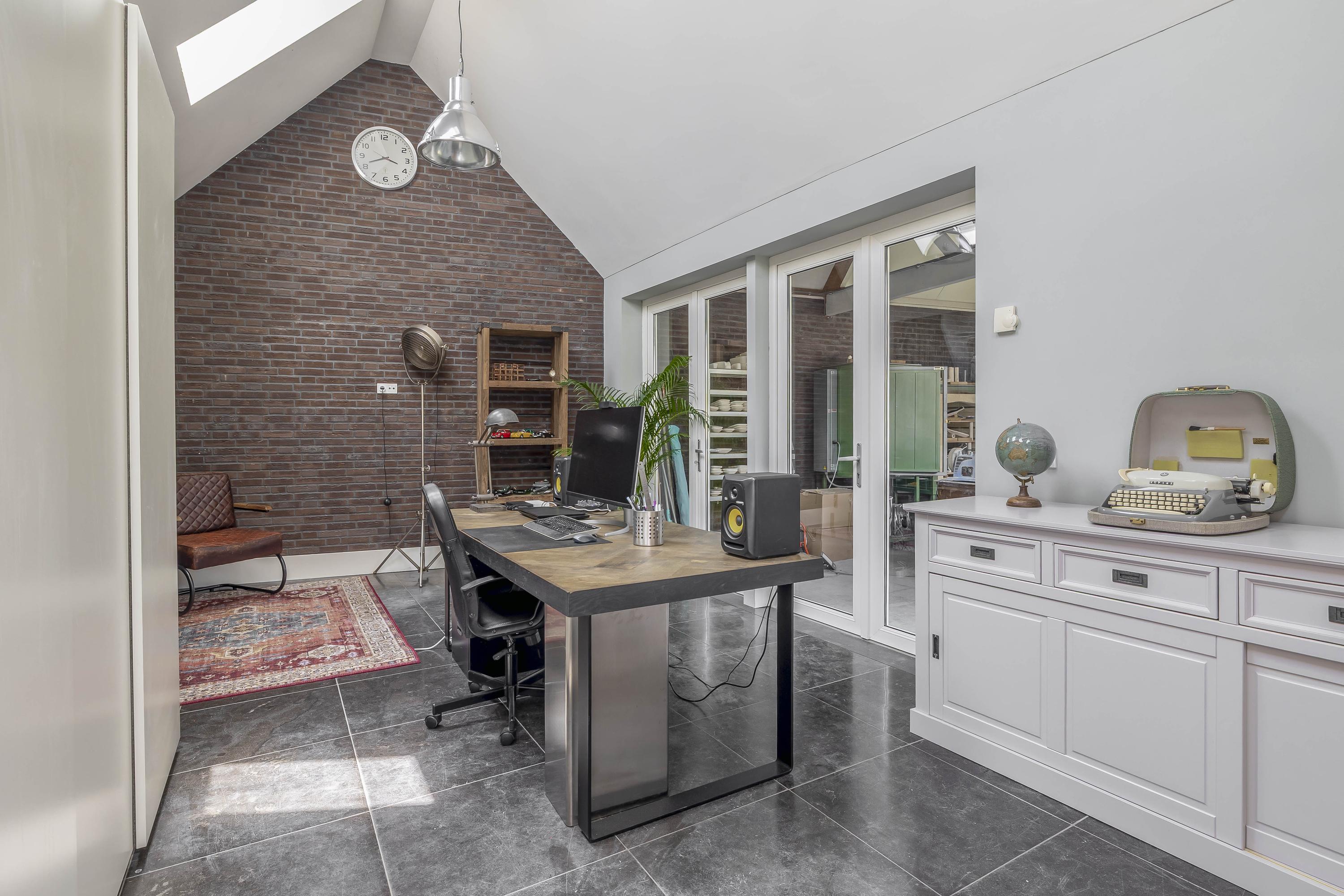 In het achterste gedeelte van het bijgebouw bevindt zich een sfeervolle kantoor- of tuinkamer. Dankzij de zichtbare nokconstructie en de vier Velux dakvensters heerst hier een heerlijk ruimtelijk en licht karakter. Dubbele openslaande deuren geven direct toegang tot de naastgelegen terrasoverkapping, wat deze ruimte ideaal maakt voor werk, ontspanning of hobby.
