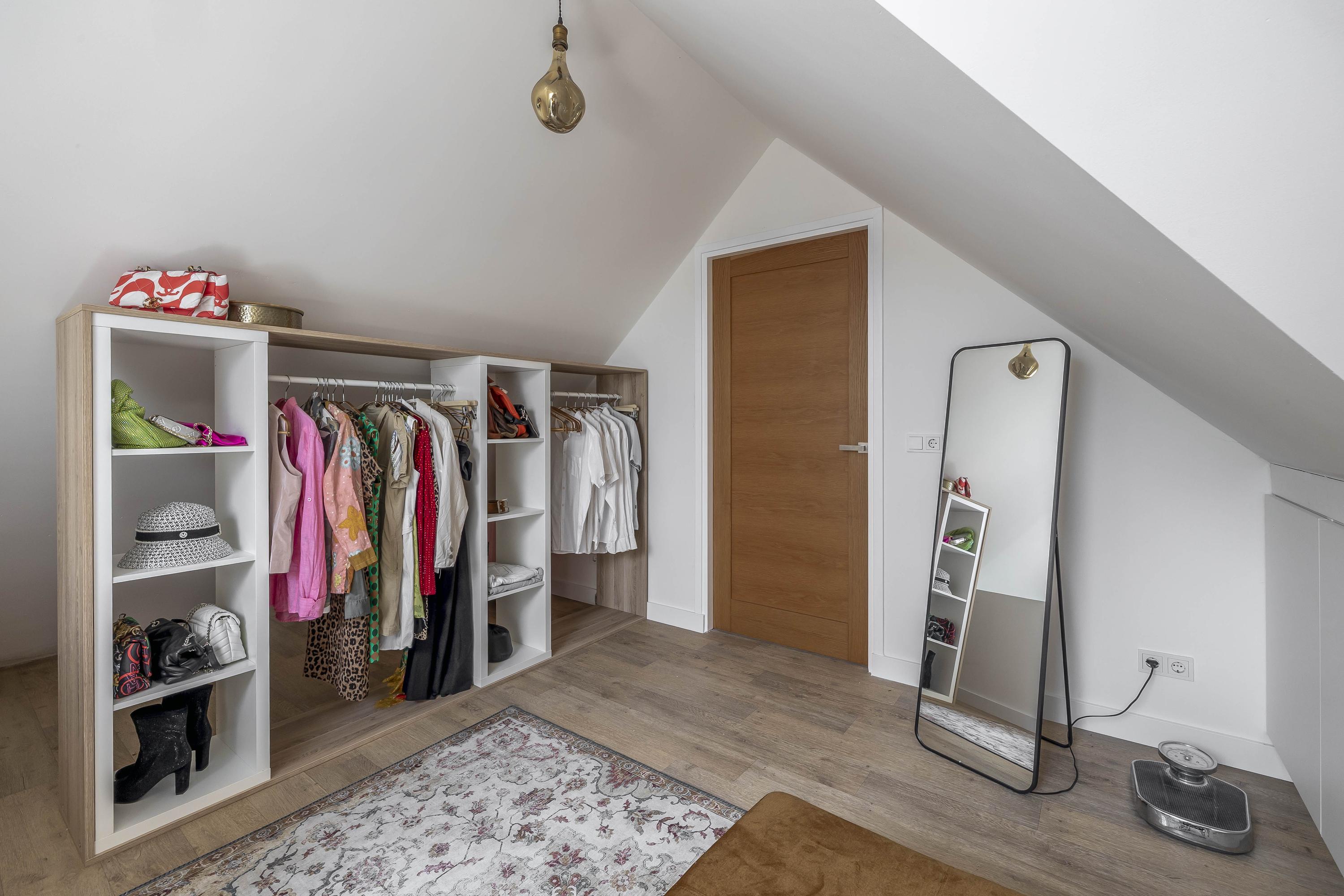 De zolderverdieping is zowel bereikbaar vanaf de overloop als vanuit de masterbedroom. De verdieping is voorzien van een vinylvloer, drie Velux dakvensters en bestaat uit twee ruime, multifunctionele gedeeltes met volop bergruimte onder de schuinte van het dak. Ideaal als kleedkamer, werk- of hobbyruimte.