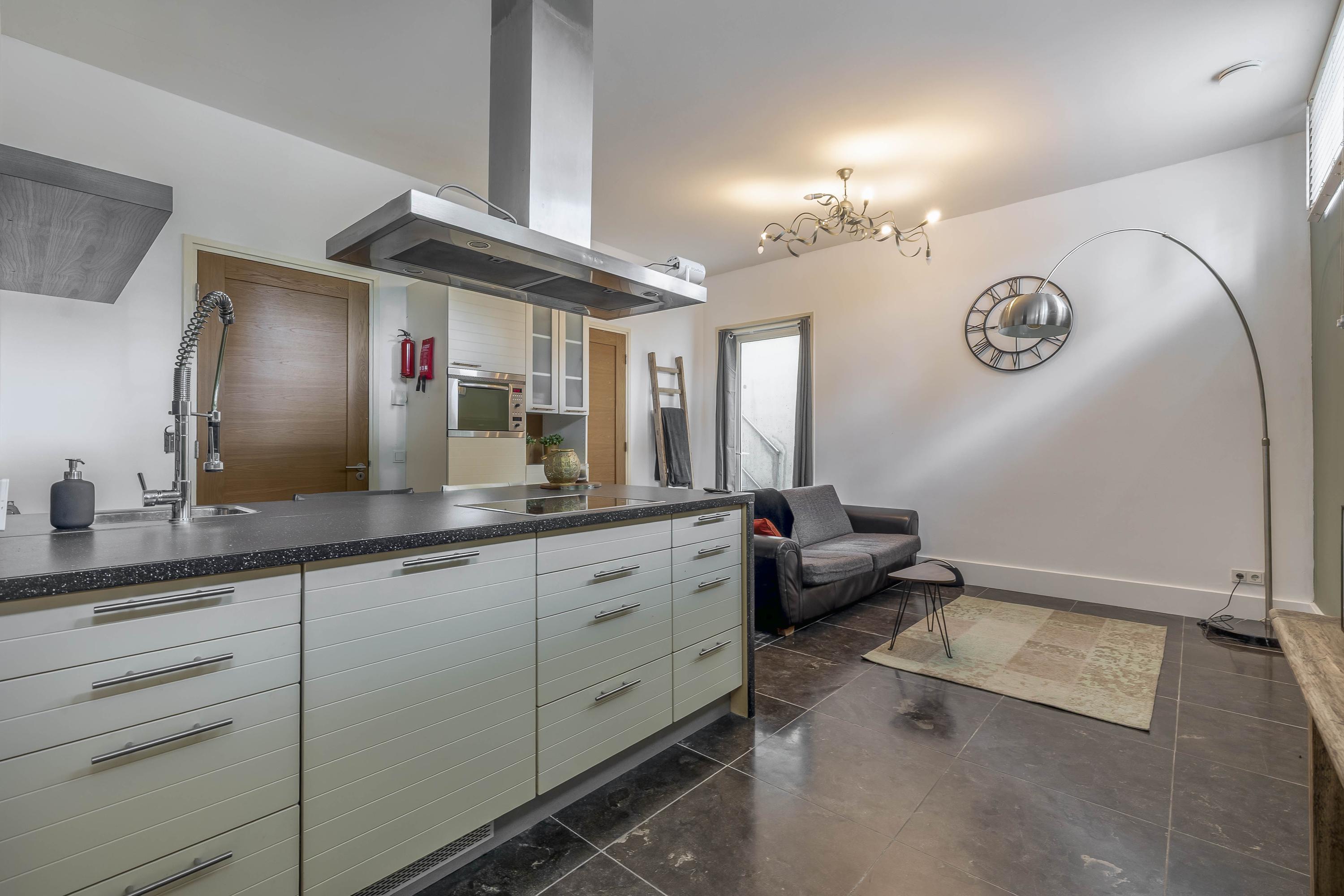 Vanaf de oprit aan de linkerzijde van de woning heb je toegang tot de studio, gesitueerd in het praktische bijgebouw. Deze zelfstandige ruimte beschikt over een woonkamer met open keuken, voorzien van een inductiekookplaat, afzuigkap, koelkast en een aansluiting voor de wasmachine. De gedeeltelijk betegelde badkamer is voorzien van een douchecabine, wandcloset en een hardstenen fonteintje.