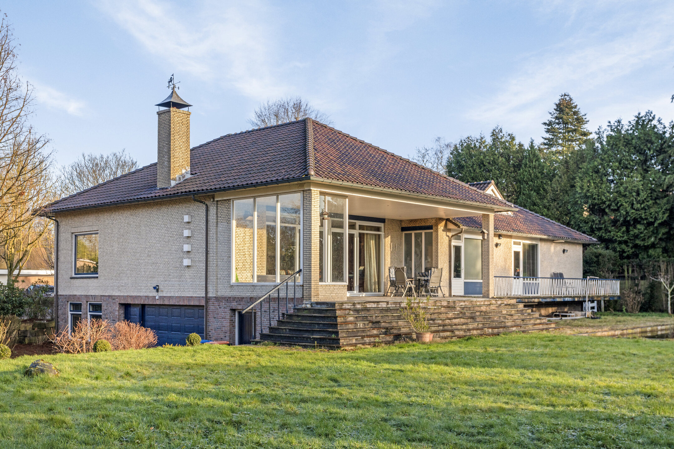 Deze villa, gebouwd in de jaren ’70 en in 2001 stijlvol uitgebreid, kenmerkt zich door strakke lijnen, grote raampartijen en een uniek glas-in-loodpaneel van Hans Morselt. Het resultaat is een woning met ziel, sfeer en hedendaags comfort.