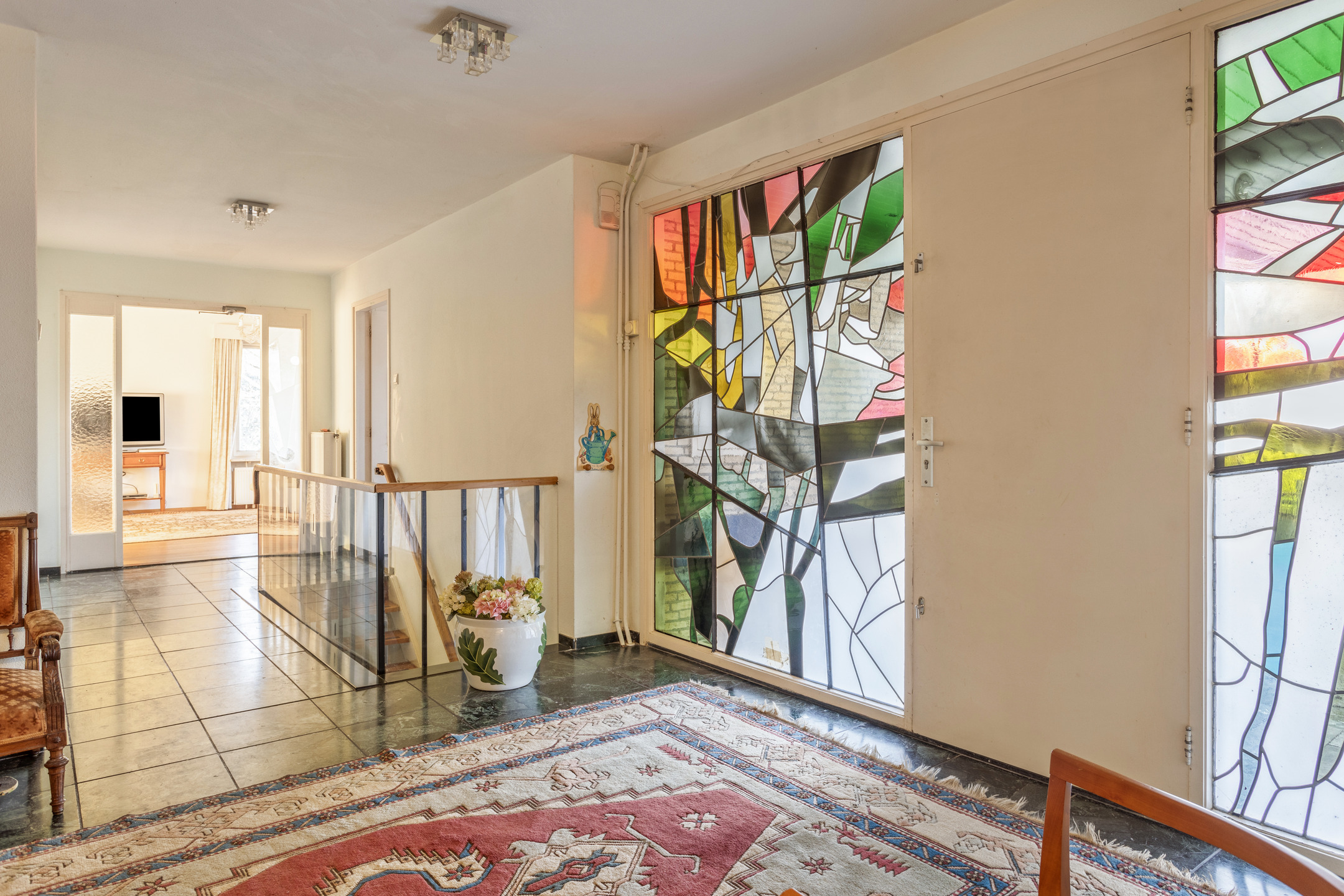 Via het verhoogde bordes en een met glas-in-lood omlijste voordeur kom je in de ruime hal, het centrale knooppunt van de begane grond. Deze biedt toegang tot: