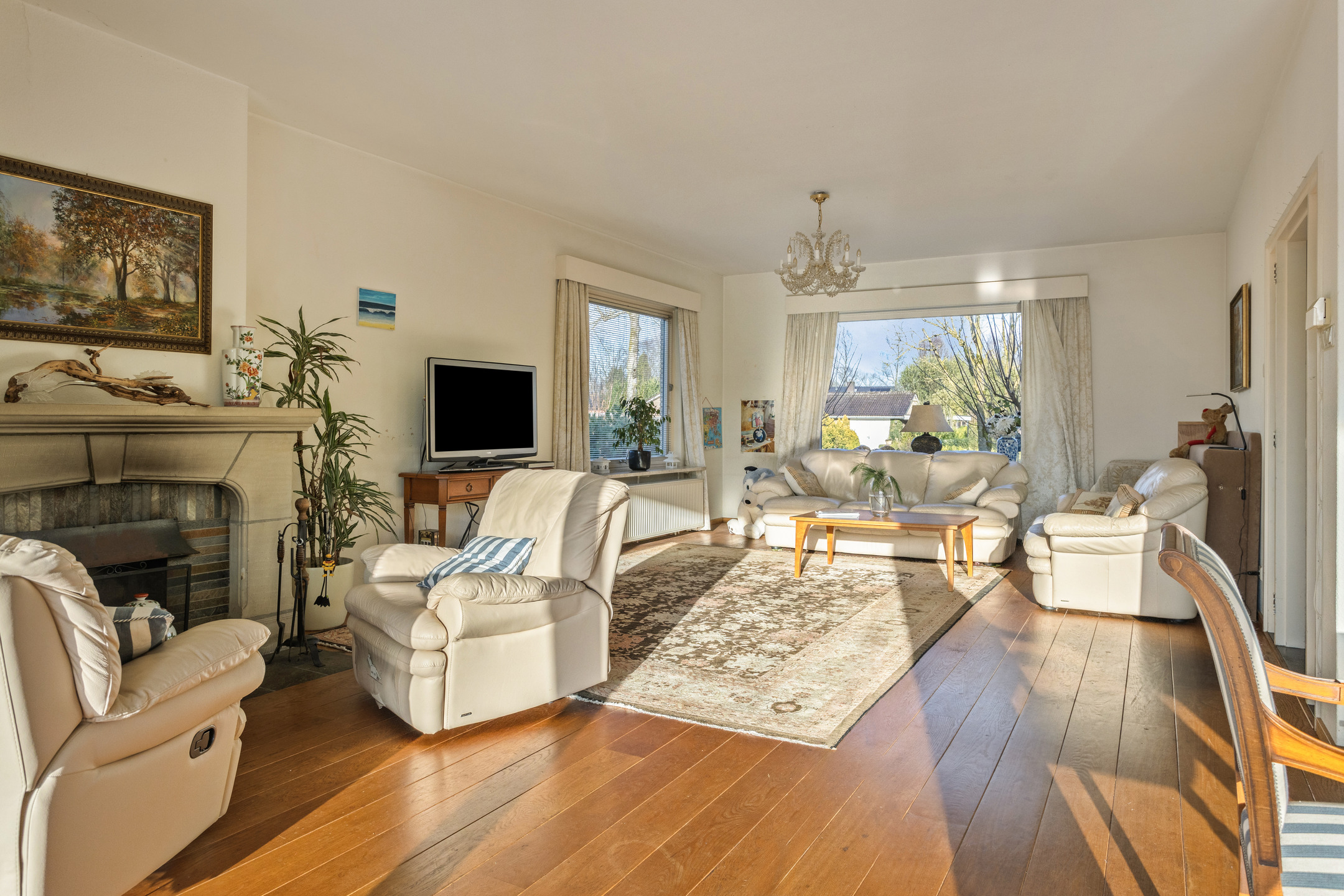 - Een lichte, royale woonkamer met panoramisch uitzicht op de tuin, open haard van Bentheimer zandsteen en directe toegang tot het overdekte terras.