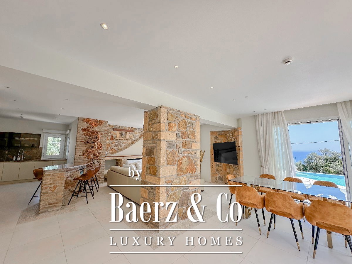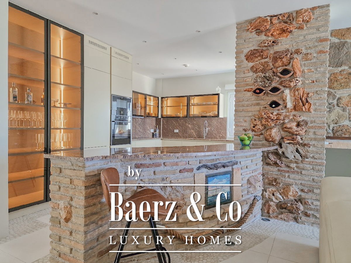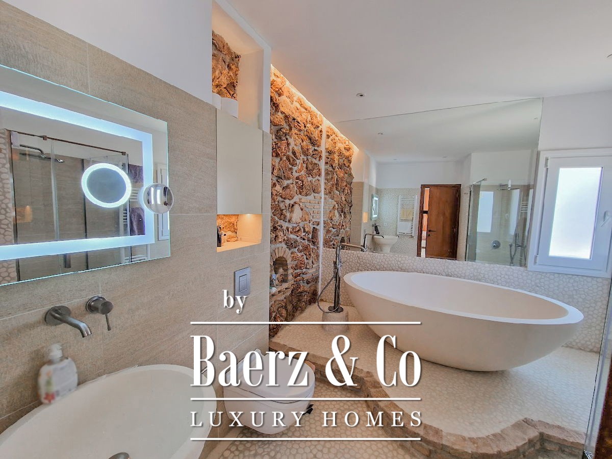 De bovenste verdieping is volledig ingericht als een imponerende master suite, waarin een jacuzzi en 50 m² aan terrassen onbelemmerd uitzicht op zee en bergen bieden, waardoor de leefruimte wordt ondergedompeld in natuurlijk licht. Buiten zorgt een hoge natuurstenen omheining voor optimale privacy; de fraai aangelegde tuin en het zwembad gaan naadloos over in het panoramische uitzicht richting de horizon.