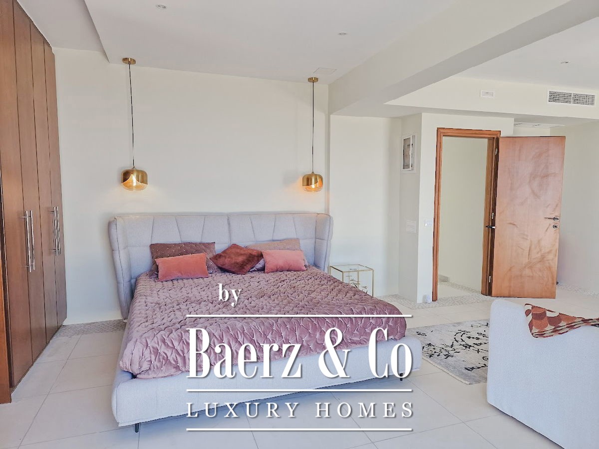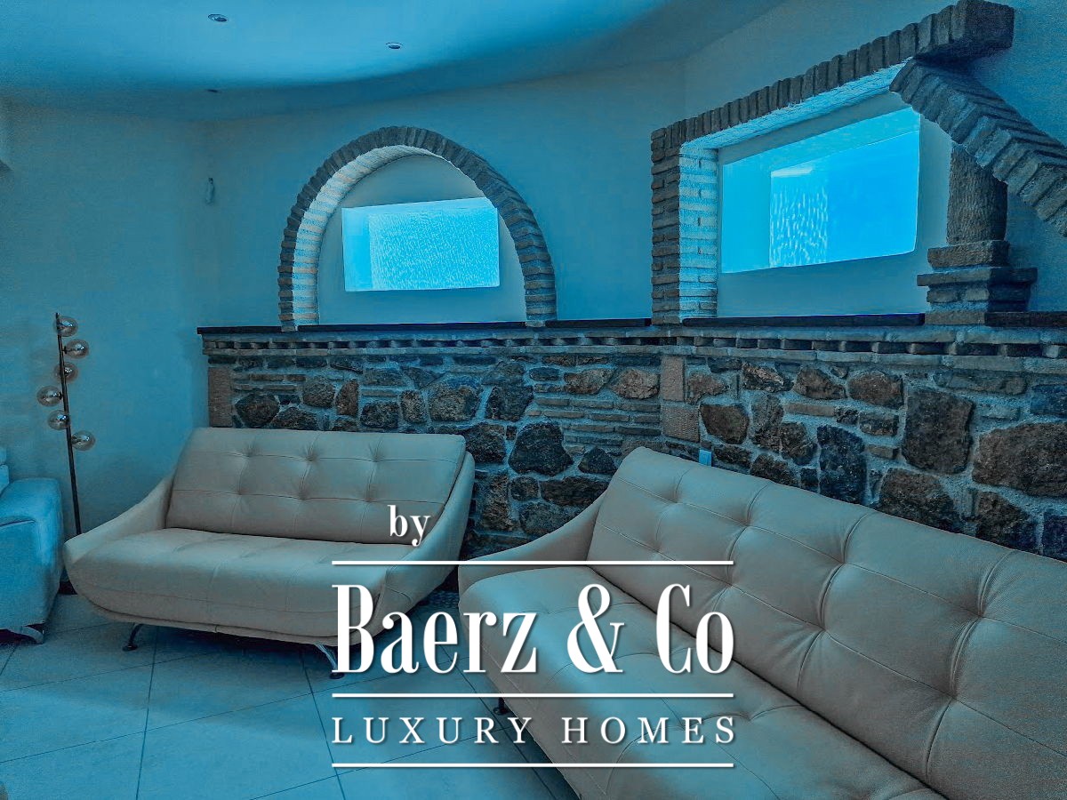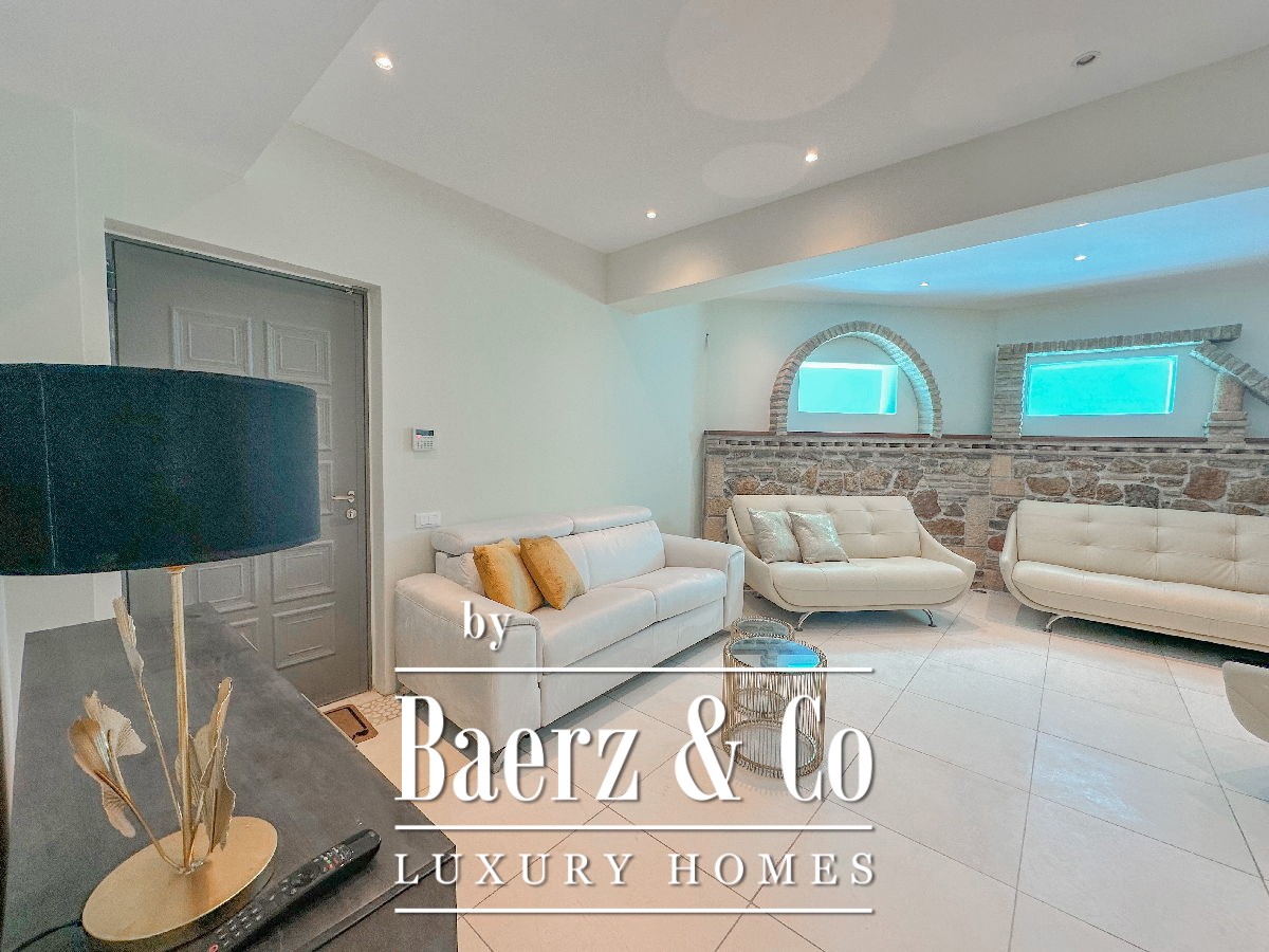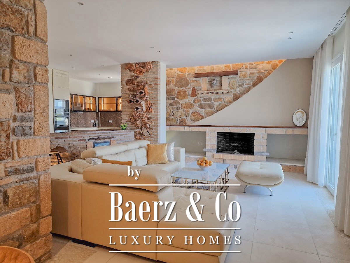 De bovenste verdieping is volledig ingericht als een imponerende master suite, waarin een jacuzzi en 50 m² aan terrassen onbelemmerd uitzicht op zee en bergen bieden, waardoor de leefruimte wordt ondergedompeld in natuurlijk licht. Buiten zorgt een hoge natuurstenen omheining voor optimale privacy; de fraai aangelegde tuin en het zwembad gaan naadloos over in het panoramische uitzicht richting de horizon.