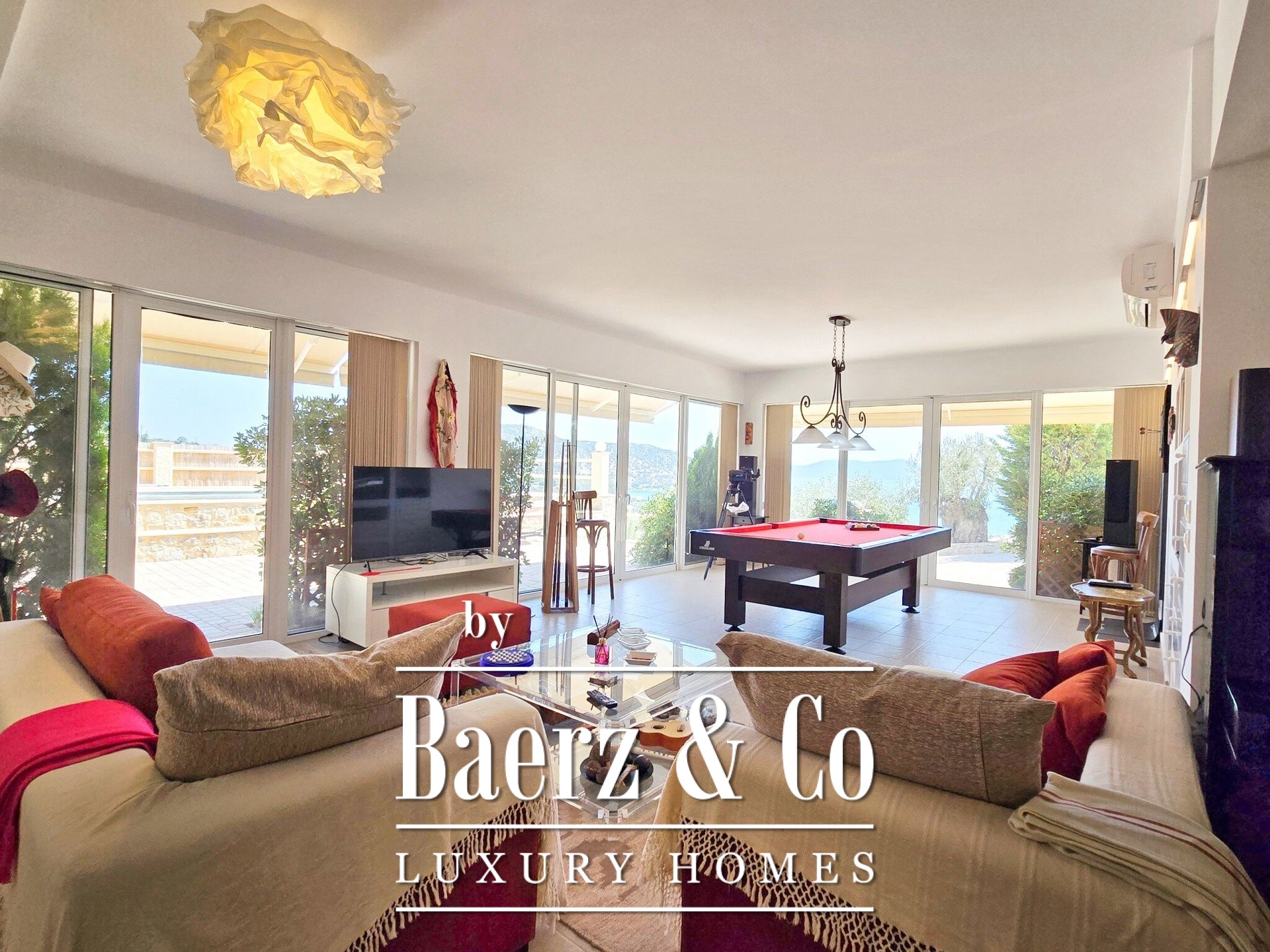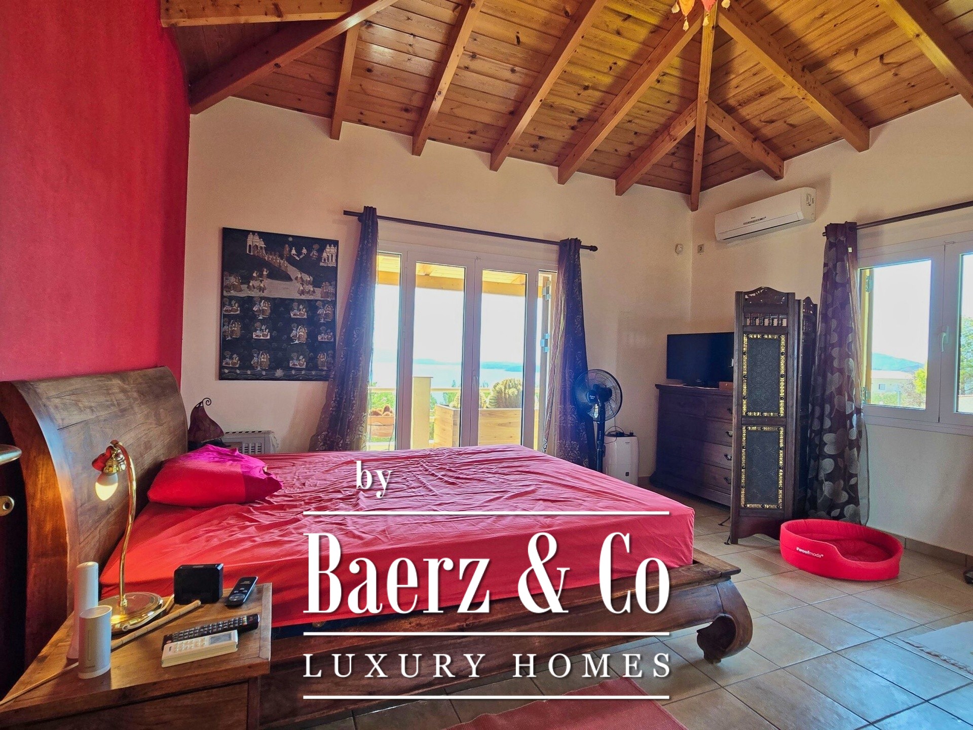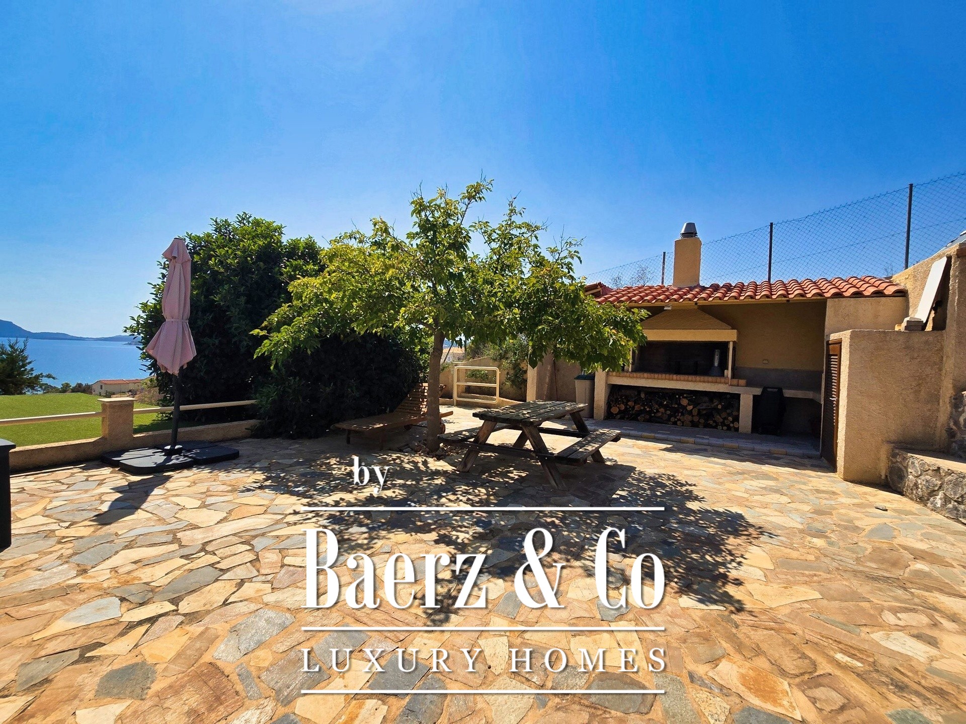 Op de eerste verdieping brengt het zichtbare houten dak architectonische warmte, met een open leef- en eetruimte, keuken, twee slaapkamers en een badkamer. Een terras van 90 m² biedt een indrukwekkend uitzicht op zee, terwijl doordachte landscaping voorziet in een buitenbioscoop en BBQ-plek.