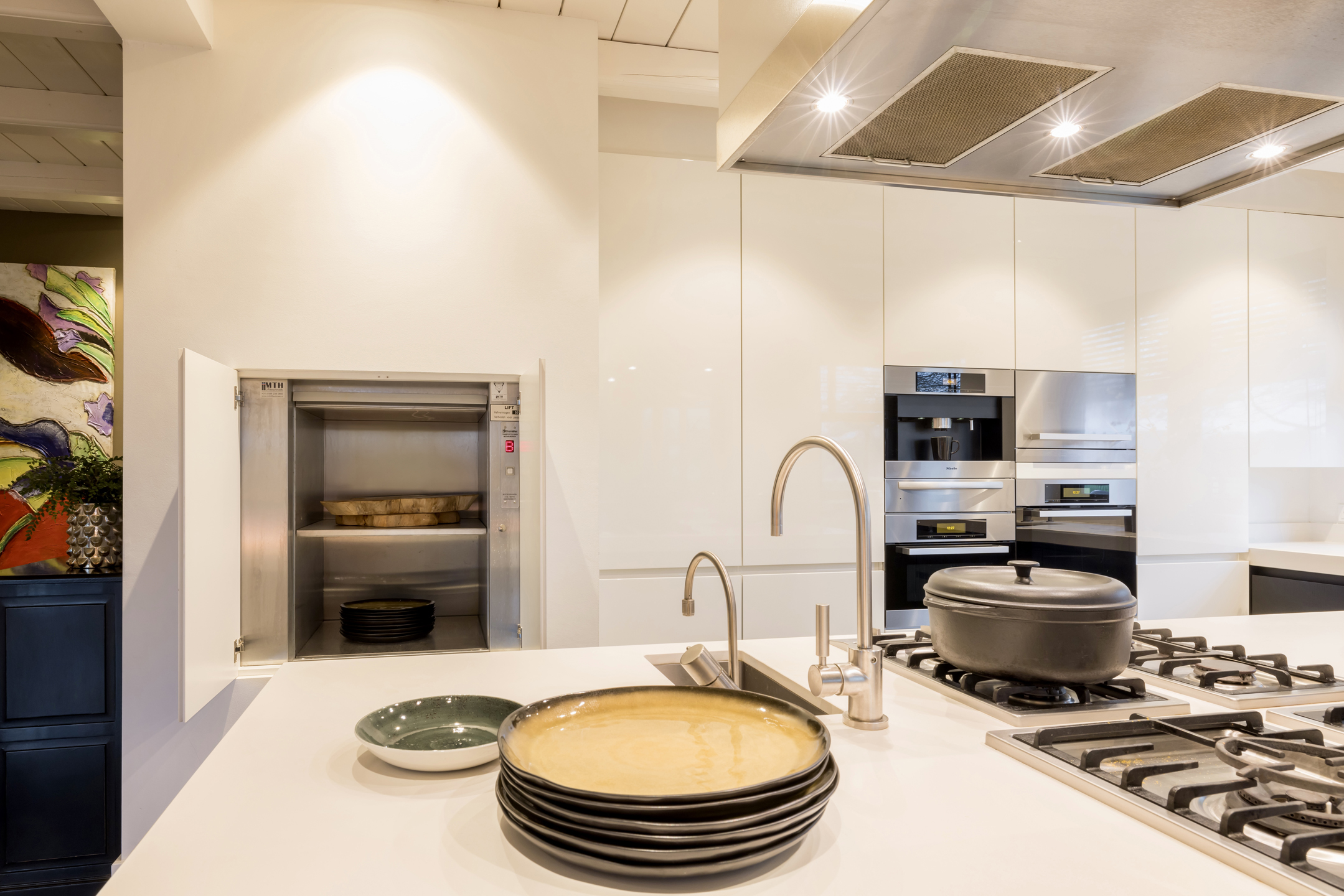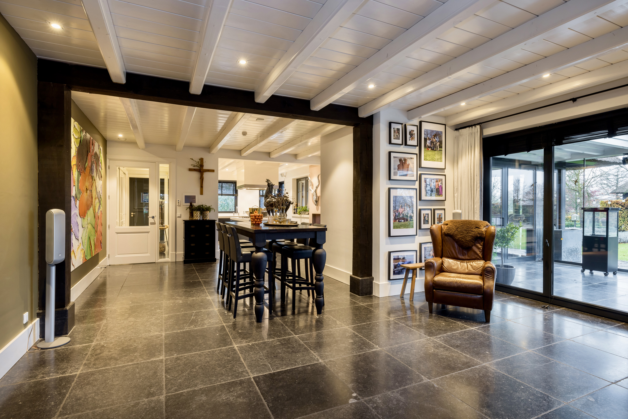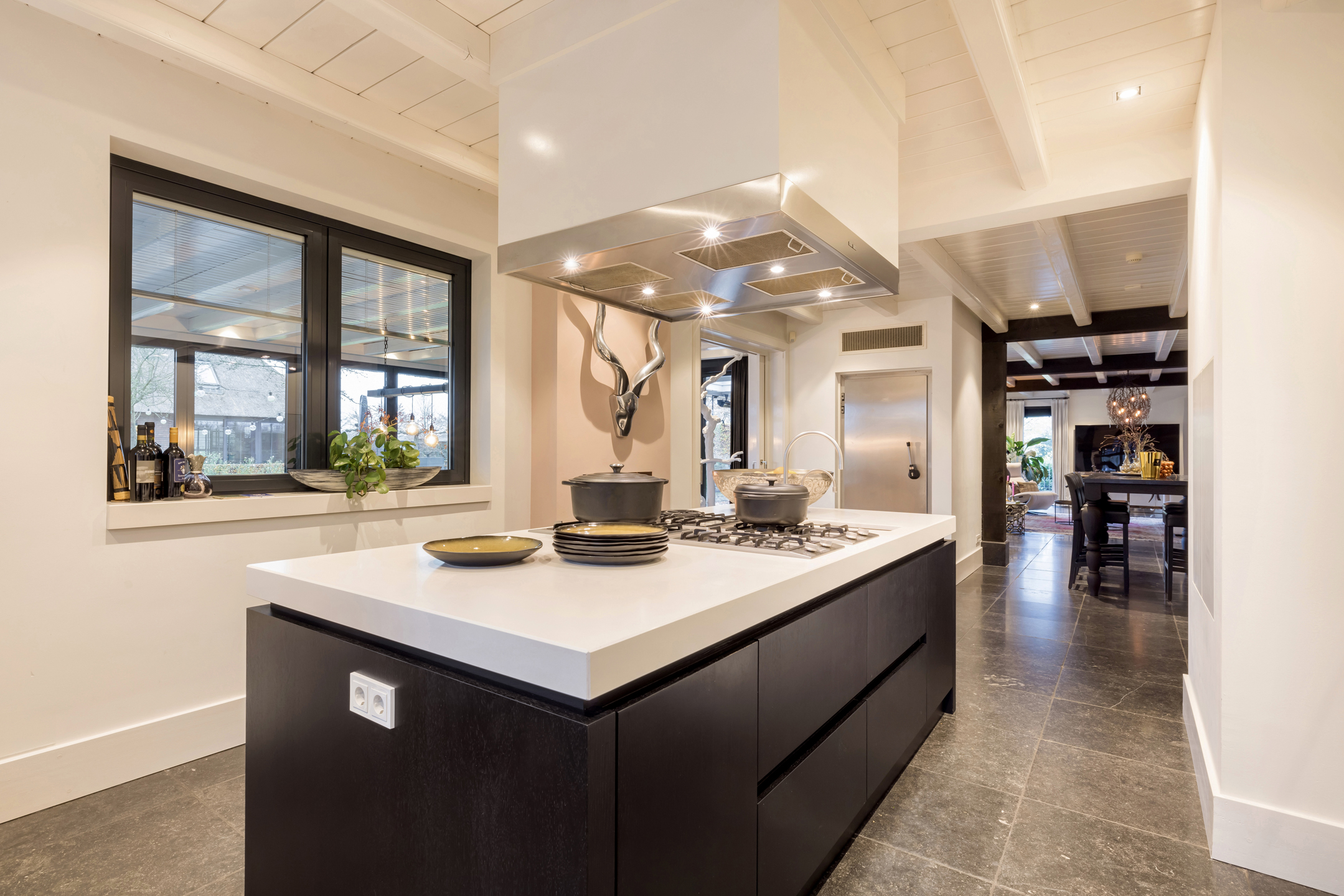Via de dubbele voordeur bereik je de ruime hal met vaste trap naar boven, toilet, garderobe en deuren naar de kelder, de personenlift en de living. De living is sfeervol, chique en rustgevend met doorkijk naar de prachtige tuin en de schitterende haardpartij. Met rechts het kantoor middels en-suite deuren bereikbaar. Ga je naar links dan bereik je de open keuken met hier veel werkblad, opbergruimte, een kookeiland en alle denkbare keukenapparatuur die de echte liefhebber van de kookkunst zich maar kan wensen. De volgende apparatuur is hier aanwezig: stoomoven, oven, combi-oven, warmhoudlade, 6-pits gasfornuis, 2 x vaatwasser en een quooker. Wat het nog meer bijzonder maakt dat in de keuken een kleine goederen lift aanwezig is om zowel de kelder als 1ste verdieping van eten en dranken te voorzien. Een koelcel i.p.v. een koelkast ook vrij uniek om je eigen koelkast in te lopen. Aan de achtertuin zijde is direct achter de keuken een fantastische tuinkamer gesitueerd die als eetkamer dienst doet. Uiteraard met overal glas en uitzicht op tuin en landerijen. Pal naast de tuinkamer is een serre aanwezig met een heerlijke buiten houthaard. Deze ruimte kun je volledig openzetten via schuifdeuren zodat je de prachtige tuin naar binnen kunt halen. Last but not least, is dit tophuis ook nog eens levensloop bestendig. Aan de linker voorzijde van de woning is de Masterbedroom gesitueerd, met ruime badkamer en walking-closet. De volledige begane grond heeft een Belgisch natuurstenen vloer met vloerverwarming en koeling maar kan ook verwarmd en gekoeld worden met een airco.