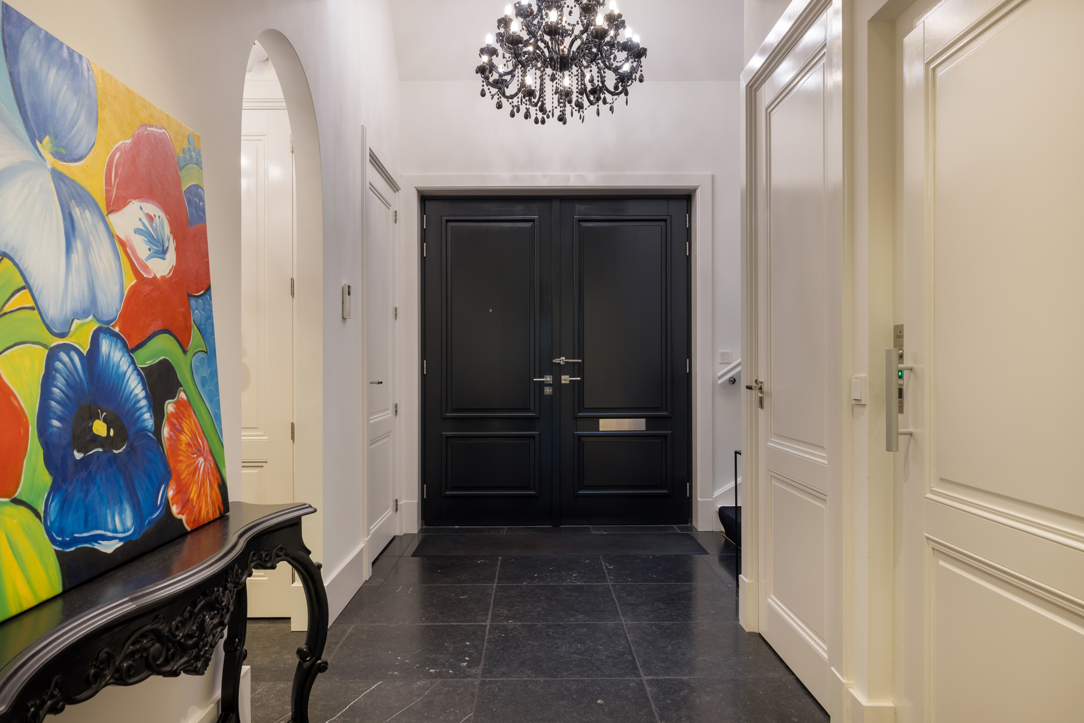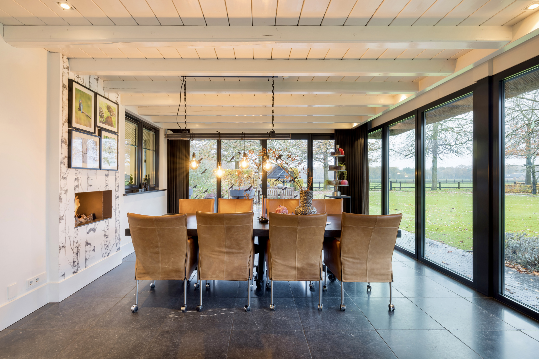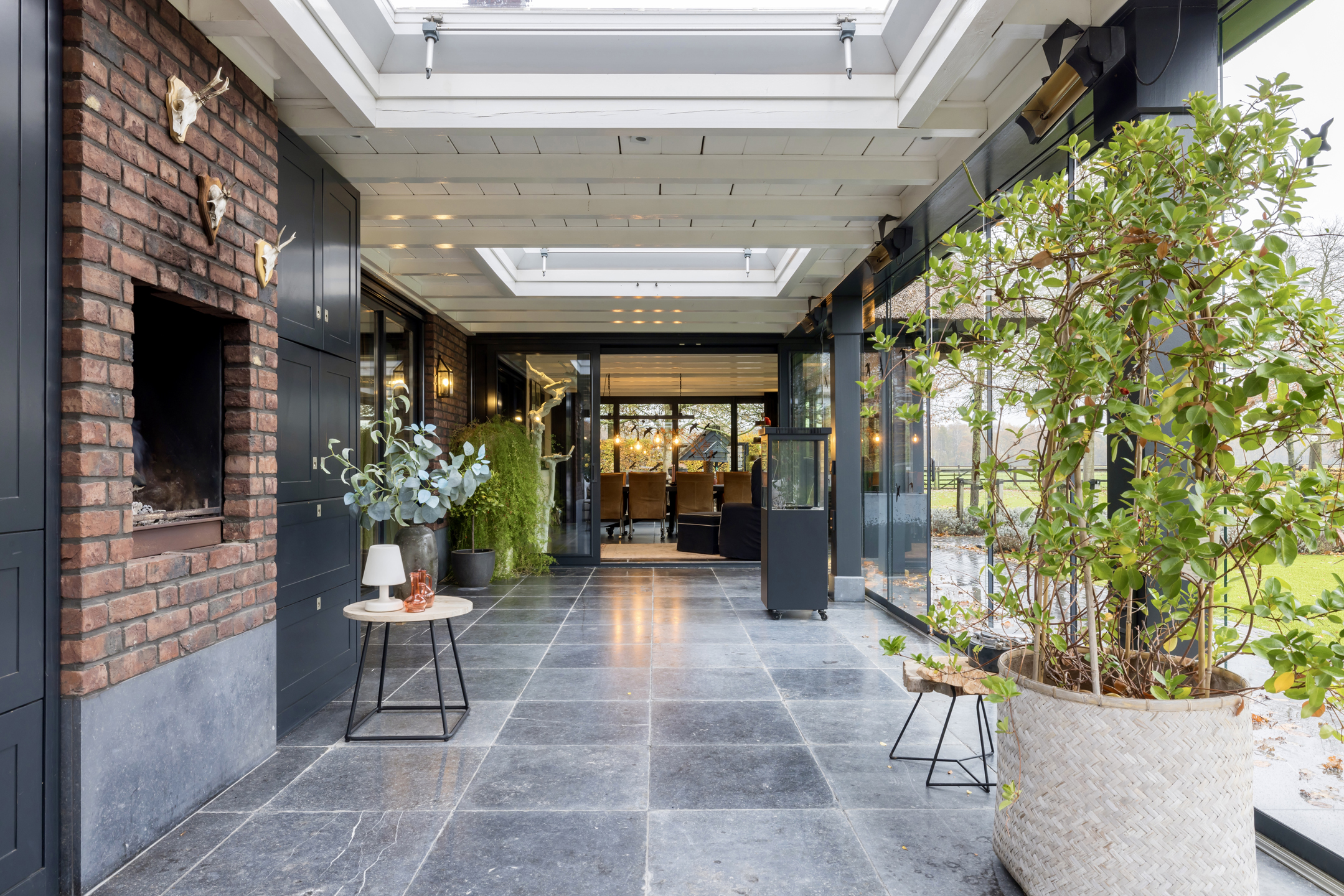 Via de dubbele voordeur bereik je de ruime hal met vaste trap naar boven, toilet, garderobe en deuren naar de kelder, de personenlift en de living. De living is sfeervol, chique en rustgevend met doorkijk naar de prachtige tuin en de schitterende haardpartij. Met rechts het kantoor middels en-suite deuren bereikbaar. Ga je naar links dan bereik je de open keuken met hier veel werkblad, opbergruimte, een kookeiland en alle denkbare keukenapparatuur die de echte liefhebber van de kookkunst zich maar kan wensen. De volgende apparatuur is hier aanwezig: stoomoven, oven, combi-oven, warmhoudlade, 6-pits gasfornuis, 2 x vaatwasser en een quooker. Wat het nog meer bijzonder maakt dat in de keuken een kleine goederen lift aanwezig is om zowel de kelder als 1ste verdieping van eten en dranken te voorzien. Een koelcel i.p.v. een koelkast ook vrij uniek om je eigen koelkast in te lopen. Aan de achtertuin zijde is direct achter de keuken een fantastische tuinkamer gesitueerd die als eetkamer dienst doet. Uiteraard met overal glas en uitzicht op tuin en landerijen. Pal naast de tuinkamer is een serre aanwezig met een heerlijke buiten houthaard. Deze ruimte kun je volledig openzetten via schuifdeuren zodat je de prachtige tuin naar binnen kunt halen. Last but not least, is dit tophuis ook nog eens levensloop bestendig. Aan de linker voorzijde van de woning is de Masterbedroom gesitueerd, met ruime badkamer en walking-closet. De volledige begane grond heeft een Belgisch natuurstenen vloer met vloerverwarming en koeling maar kan ook verwarmd en gekoeld worden met een airco.