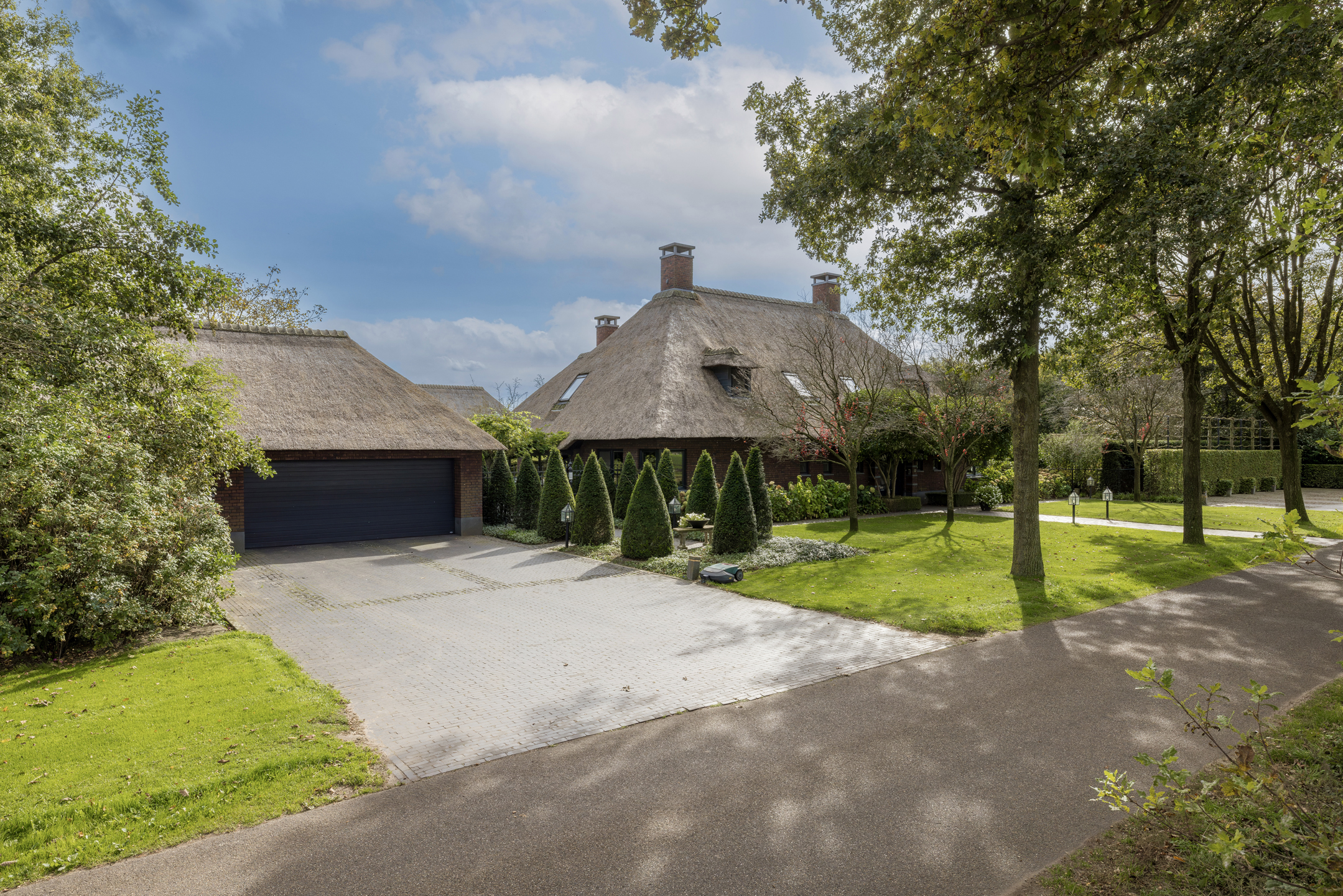 Een vrijstaande garage aan de linkerzijde van de woning, volledig in stijl met het hoofdgebouw, eveneens met een rietenkap. De dubbele ruime garage heeft plek voor 2 auto’s, is voorzien van een elektrische garagedeur, bergkast en biedt extra ruimte voor het stallen van onder andere fietsen en een motor. Via de achtertuin is er een toegang tot een ander deel van de garage. Via een portaal zijn de hondenverblijven bereikbaar, inclusief een buitenren. Via een vaste trap bereik je de verdiepingsvloer met hierboven nog tal van mogelijkheden. De garage heeft zowel een CV, elektra als water. Achter de garage staat nog een kippenhok, uiteraard ook rietgedekt met een bijbehorende uitloop: helemaal vossen en roofvogel proef.