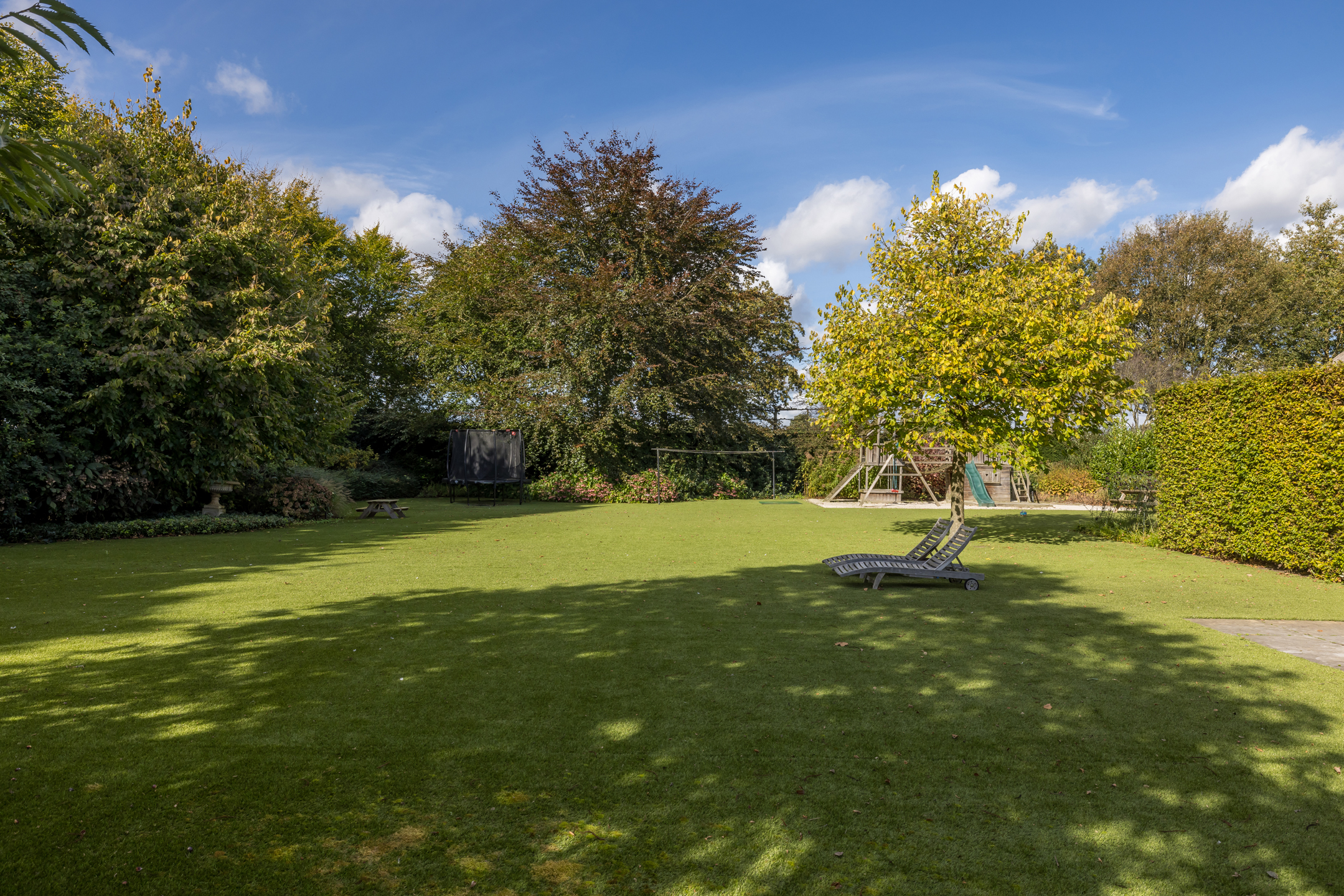 Een prachtig aangelegde voortuin met aan 2 zijdes ruime parkeermogelijkheden. De achtertuin is riant en onderhoudsvriendelijk. Met een uitzicht op zowel in de verte het bos, weiland, het guesthouse, het buiten zwembad en de prachtig aangelegde tuin. Het zwembad is volledig afsluitbaar, maar kan uiteraard ook volledig worden geopend door middel van een schuifkoepel systeem. De verwarming van het zwembad gaat via een hybride warmtepomp. Het gazon is enkele jaren geleden vervangen door kunstgras, wat er eerlijk gezegd wel heel erg goed uitziet en het wel heel onderhoudsvriendelijk maakt. Het rechterdeel van de achtertuin is ingericht als speelruimte voor de kinderen. Achter het guesthouse en links van de woning is het perceel nu ingericht als grasland.