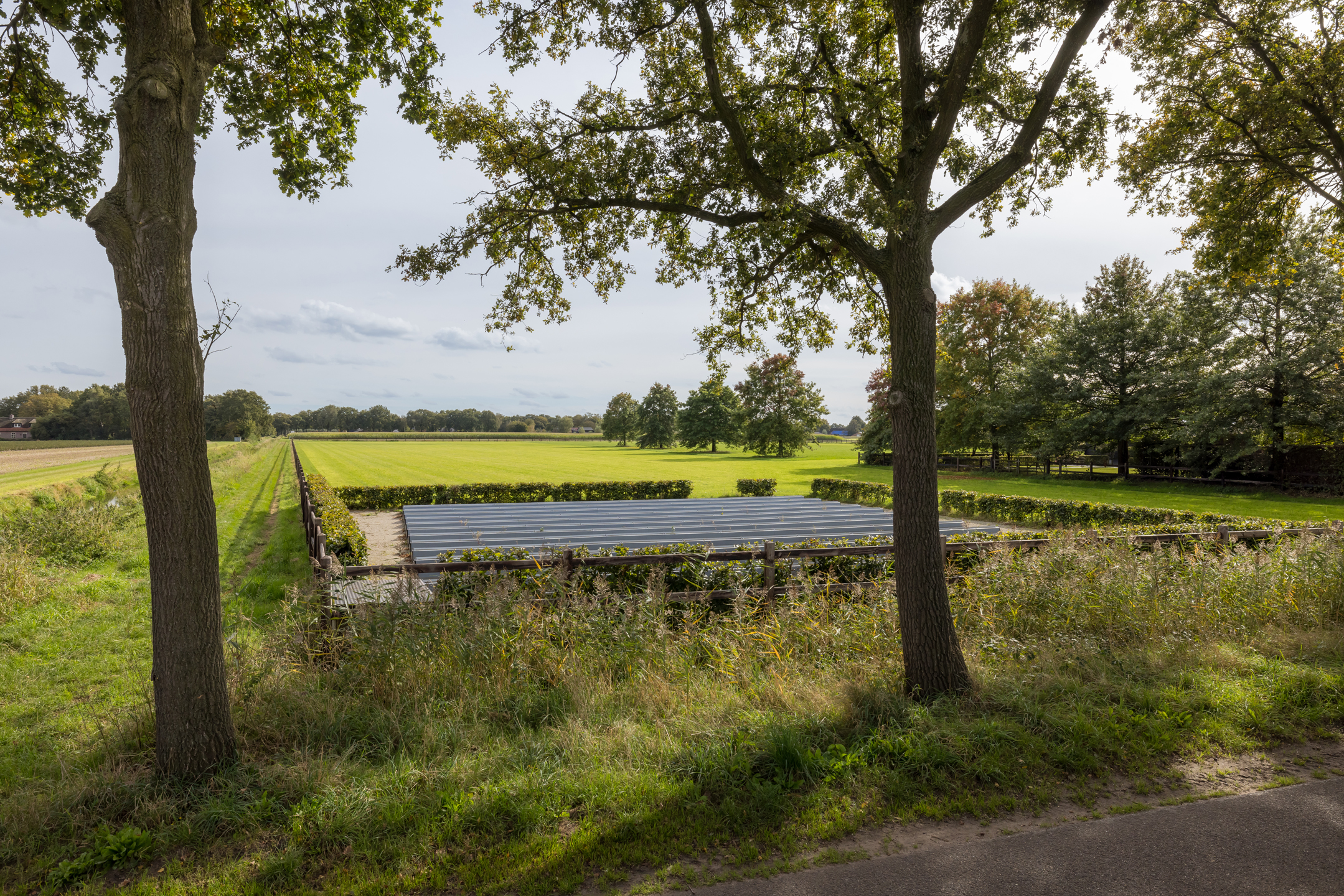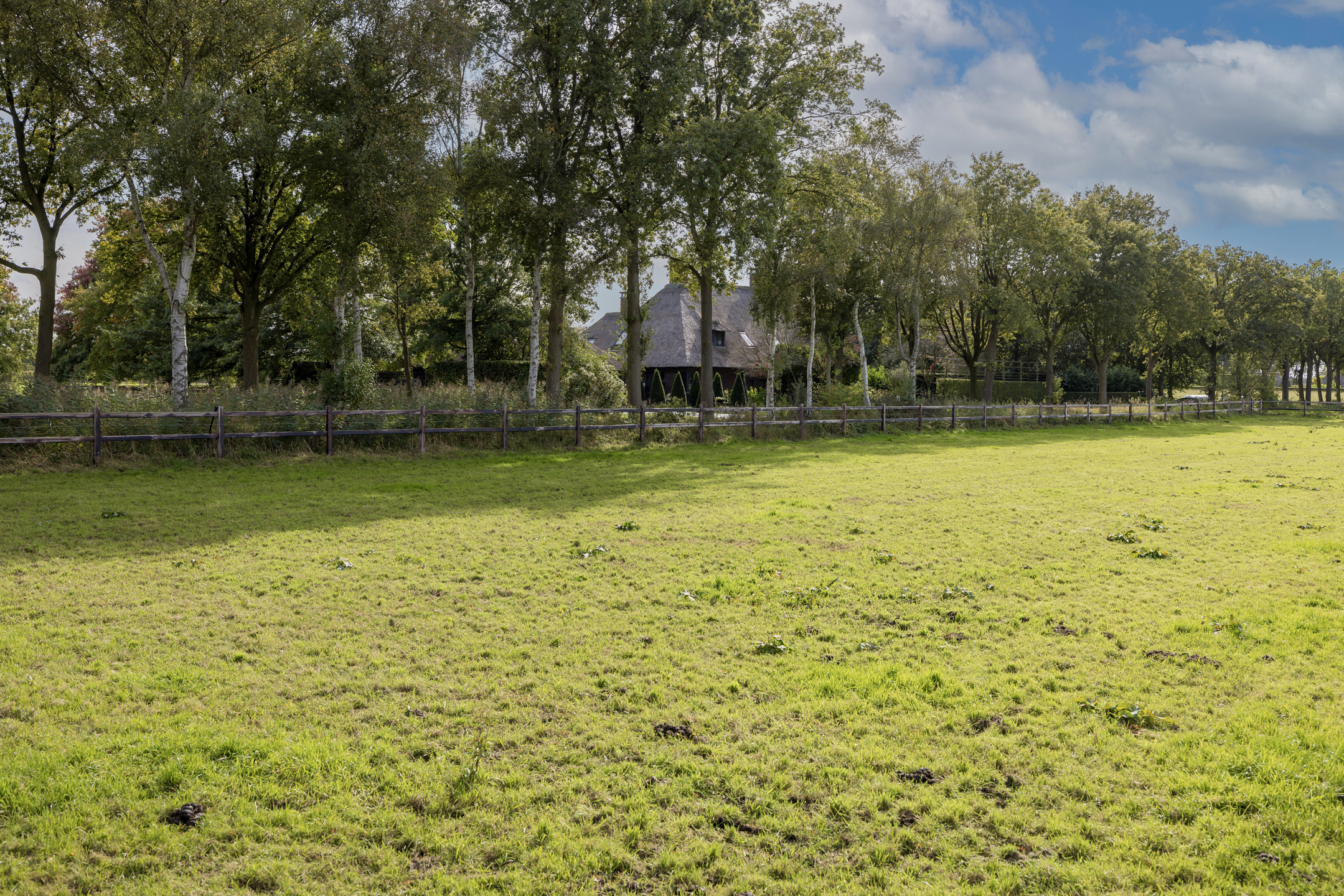 Rechts van de woning is een poort met een pad om bij het grasland te komen. Links van het kavel is een serieuze sloot (loop) waar altijd water aanwezig is, dit is gelegen aan het beekdal van het riviertje de "Leijgraaf". Aan de voorzijde van de woning, aan de overkant van de weg, ligt nog een perceel van 3.085 m² wat er ook bij hoort. Het totale terrein is 44.549 m²/ 4.45 hectare en het mag ook met alle grond verkocht worden. Wij bieden het echter nu aan met 14.550 m².