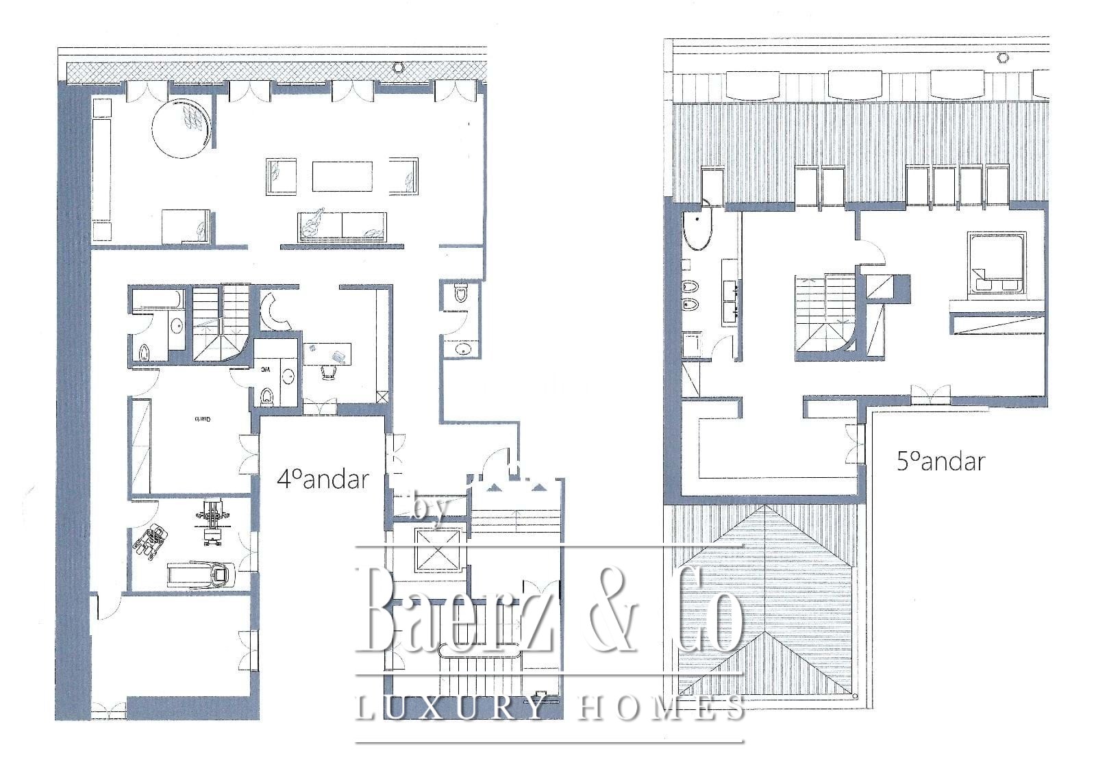 Het privédeel beschikt over vier slaapkamers en vier badkamers. Twee daarvan zijn elegante suites, waaronder een master suite met inloopkast, een badkamer met glazen wanden en een sculpturale badkuip onder een daklicht. Eén slaapkamer is ingericht als fitnessruimte, terwijl de hoofdkeuken naar eigen wensen kan worden afgewerkt door de toekomstige eigenaar. Overal zorgen dubbele beglazing voor rust en biedt het dakterras een zeldzaam uitzicht op de creatieve wijk van Lissabon.