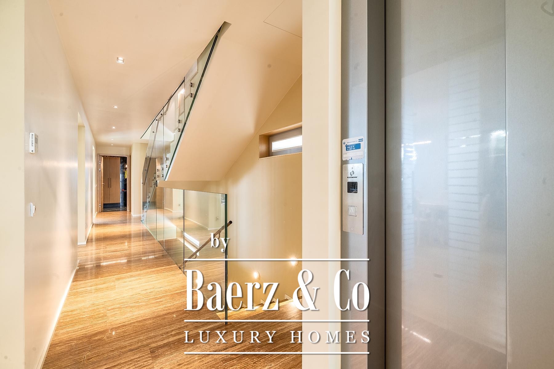 Het souterrain beschikt over een beveiligde garage voor drie auto's, een aparte was- en opslagruimte, een fitnessruimte met jacuzzi en sauna, alles toegespitst op een discreet en doelgericht dagelijks ritme. Op de begane grond vloeien de entreehal met werkruimte, de keuken met centraal kookeiland en de woon- en eetkamer met open haard naadloos in elkaar over. Schuifdeuren bieden toegang tot het terras; een plek voor frisse lucht en serene privacy. De bovenverdieping bestaat uit een master suite met inloopkast en royaal sanitair, twee kindersuites en een flexibele gastenkamer met eigen entree.