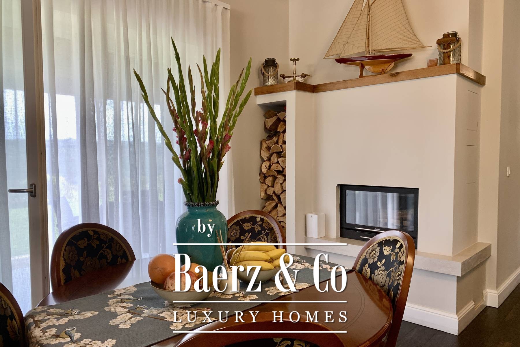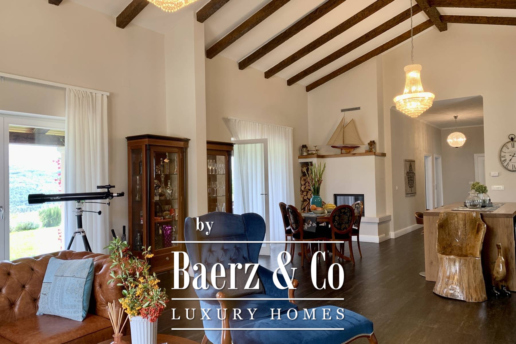Bij binnenkomst valt het daglicht door glazen wanden, omlijst de heuvelachtige omgeving en leidt de blik naar een royaal terras dat uitnodigt tot rustige ochtenden of sfeervolle avonden. De keuken, voorzien van een massief eiken eiland met natuurlijke wasafwerking, vloeit samen met de eet- en zitruimte. Alles wordt verbonden door een met zorg vervaardigde houtgestookte haard. Op de begane grond delen twee slaapkamers een luxe badkamer; praktische ruimtes als wasruimte en berging zijn naadloos geïntegreerd.