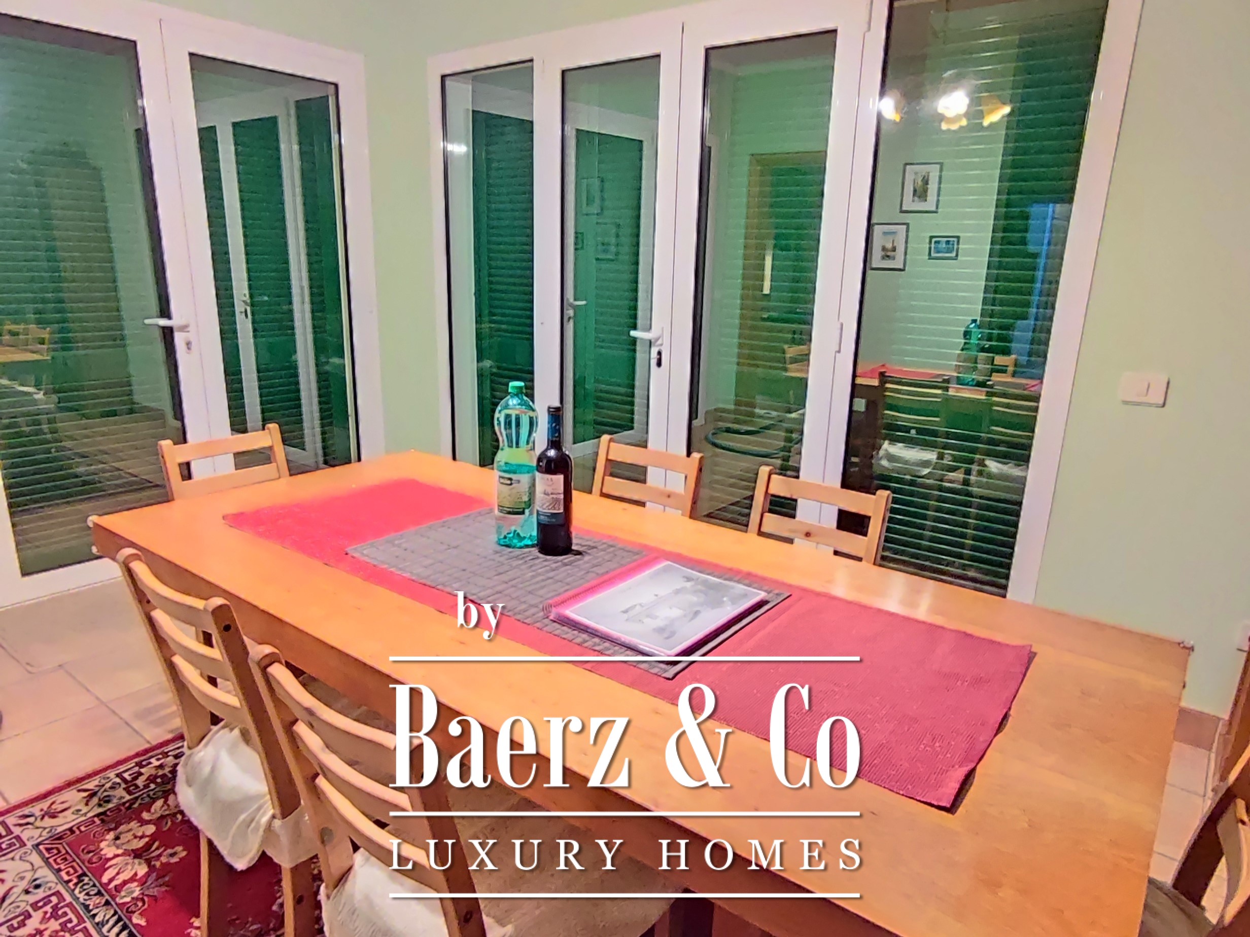 Het huis heeft ook een betegelde dubbele garage van 60 m² met werkplaats en grote Hörmann roldeuren. Het zwembadgedeelte bestaat uit een zwembad van 20 m x 7,5 m, een groene zone en verschillende plekken om te zonnebaden.
