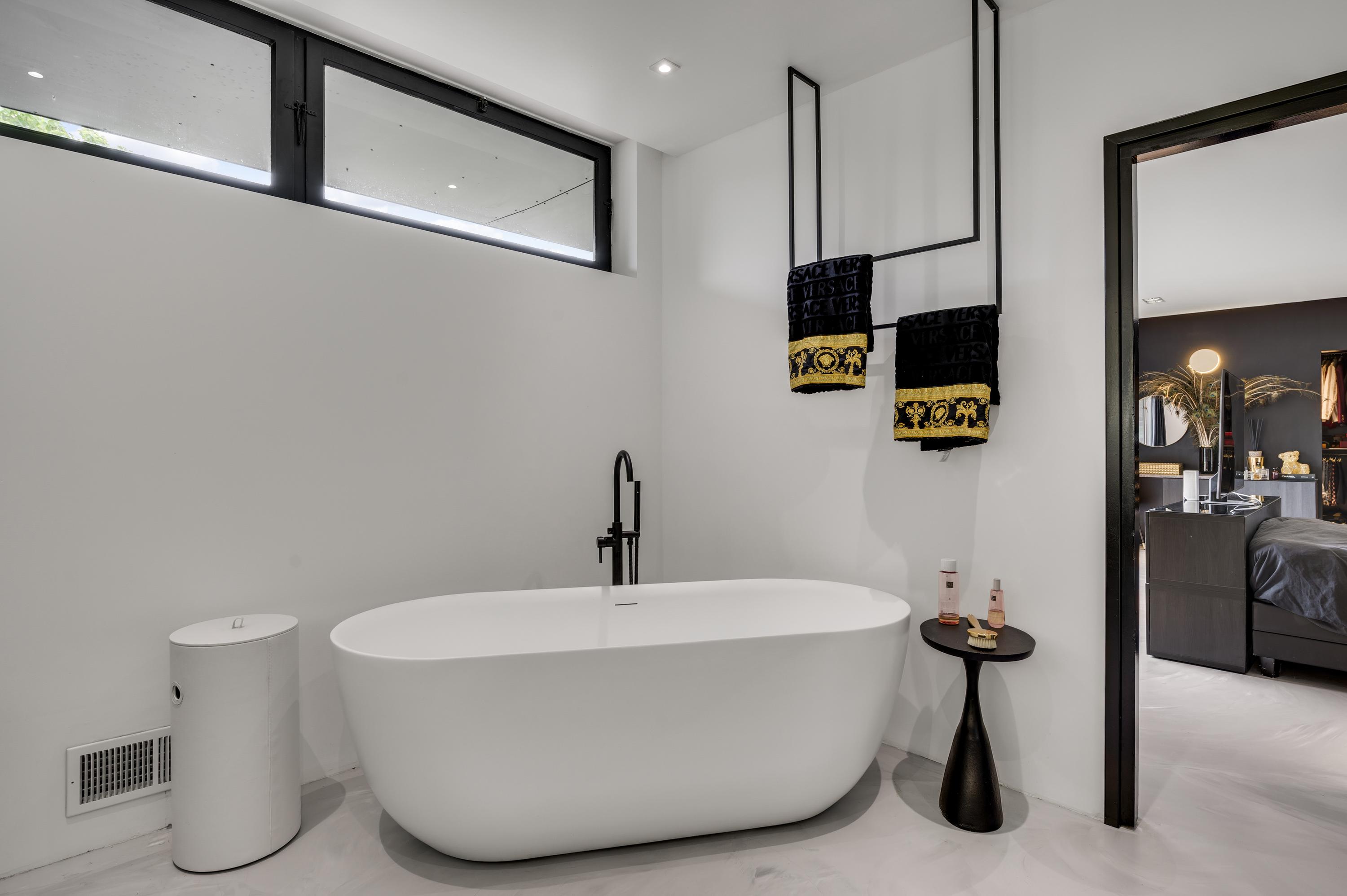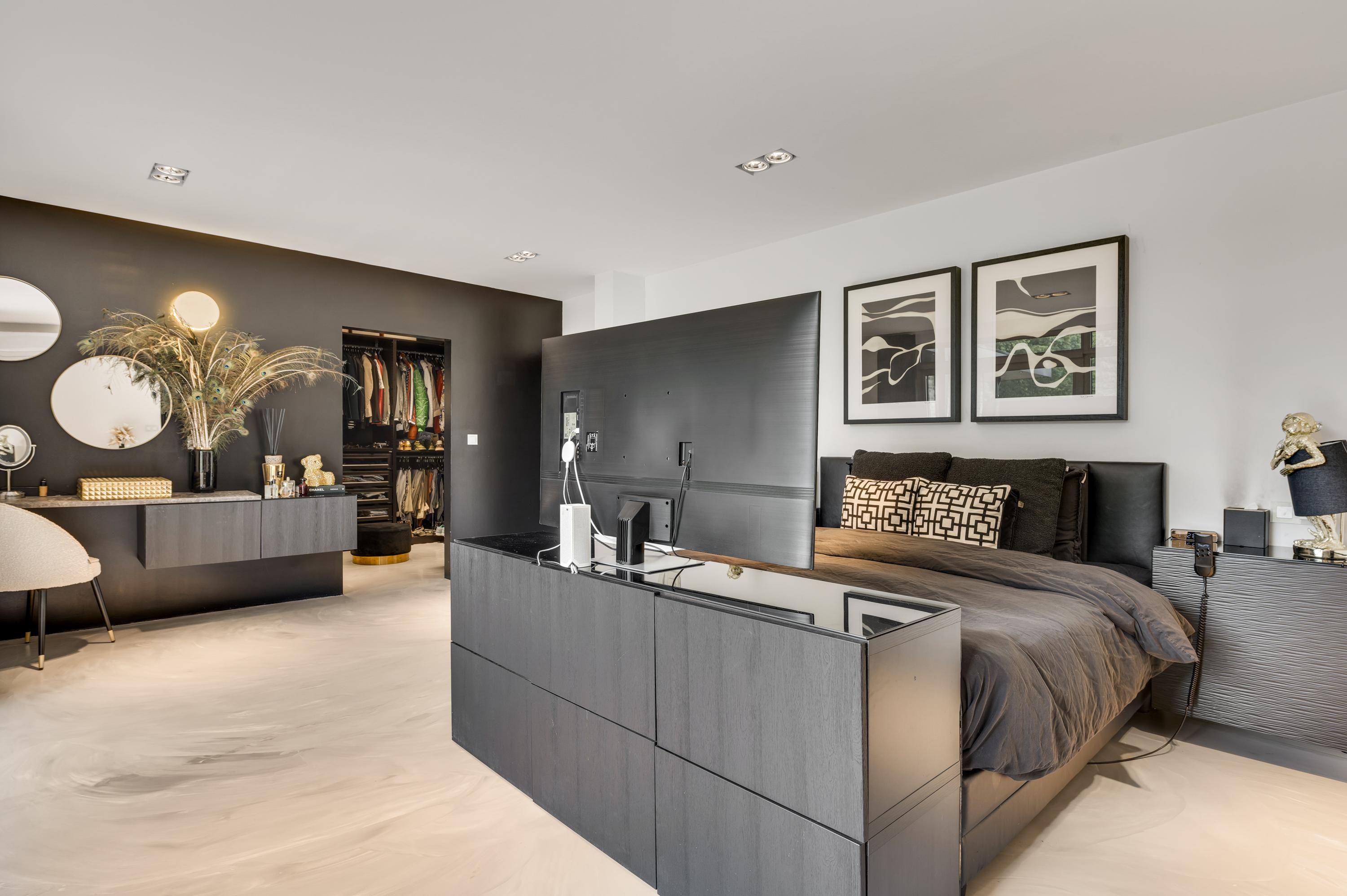 De oostvleugel is volledig ingericht als slaapverblijf. Hier bevinden zich vijf slaapkamers, waaronder een riante master bedroom met eigen kleedkamer, luxe badkamer en directe toegang tot een overdekt terras met zicht op de tuin. De overige vier slaapkamers delen twee stijlvolle badkamers, elk voorzien van een ligbad, inloopdouche, dubbele wastafel en wandcloset.
