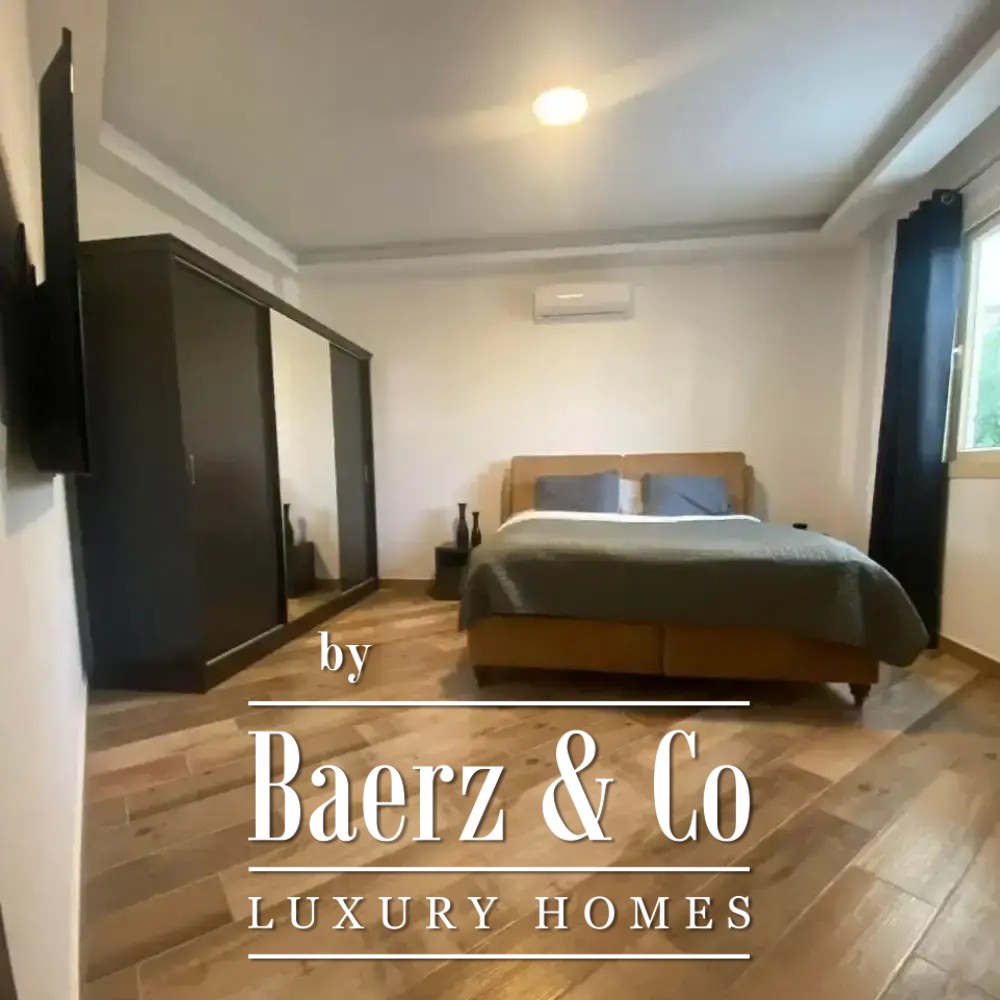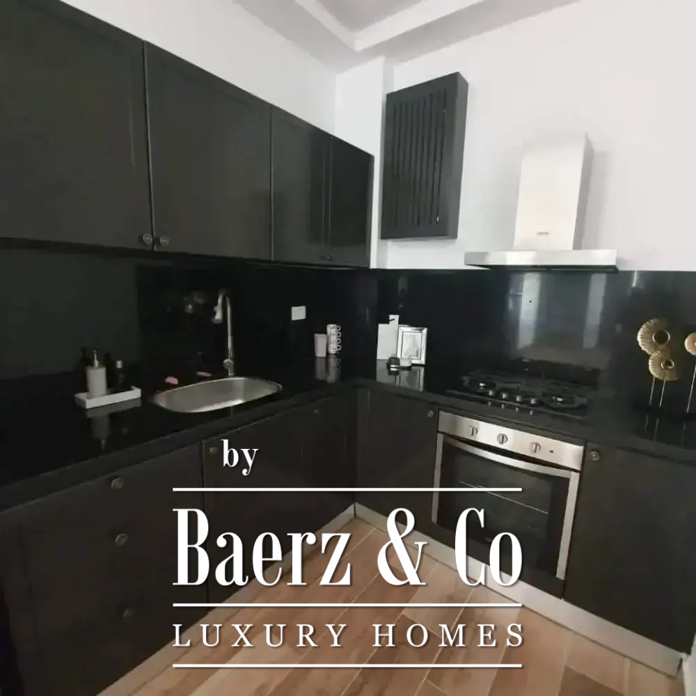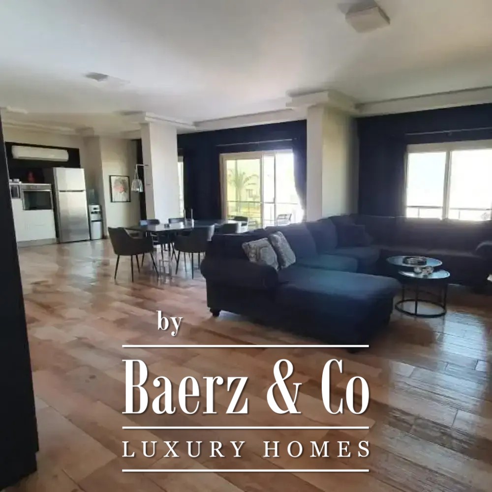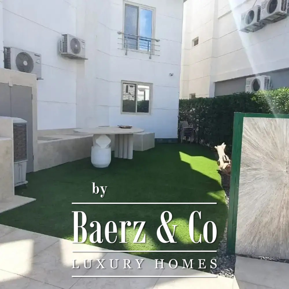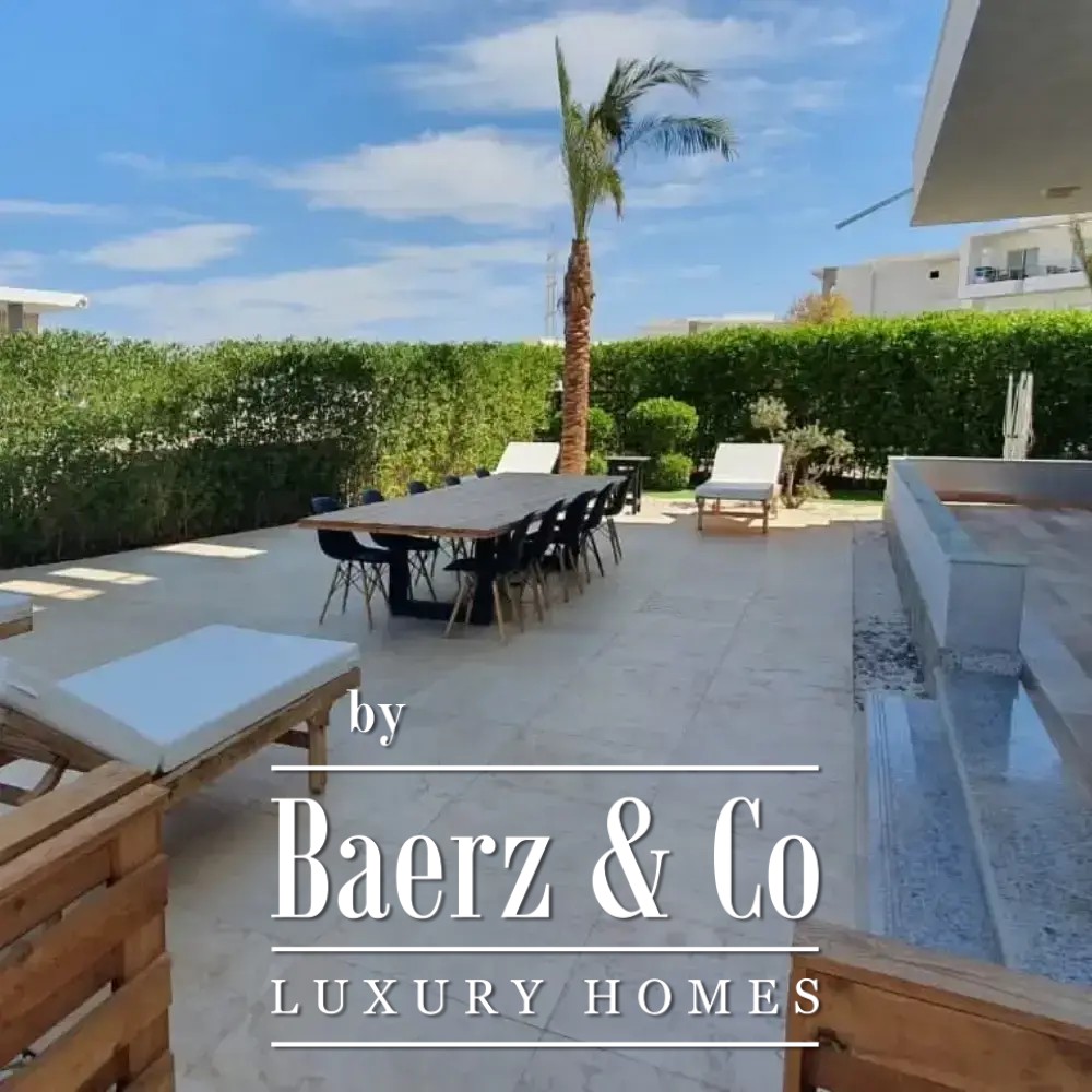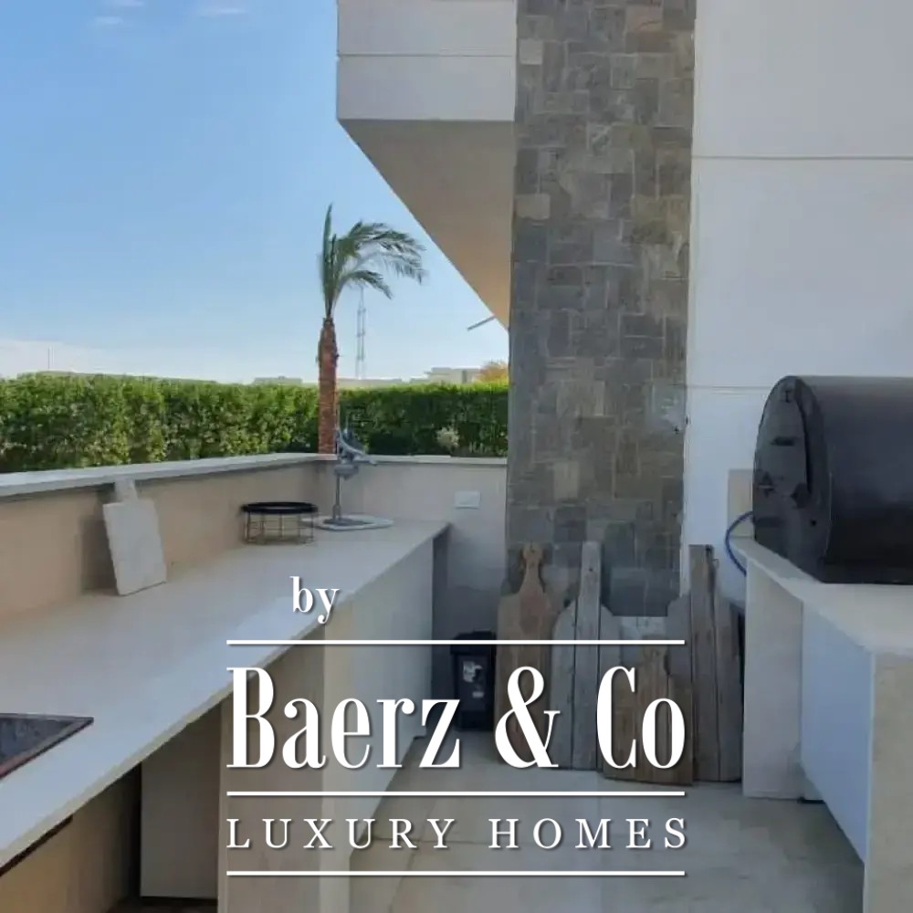 Buiten ligt een fraai aangelegde tuin van 520 m² met kunstgras en volwassen palmen, waardoor een serene privé-oase ontstaat. Meerdere terrassen met marmeren afwerking omlijsten de buitenruimte en bieden uitnodigende plekken voor dineren in de open lucht, ontspanning of een rustig ochtendritueel; een buitenkeuken met pizzaoven en barbecue verhoogt het comfort bij onderlinge samenkomsten. Op elk niveau creëren balkons een sierlijk uitzicht over het complex en de besloten tuin en vangen ze het gefilterde licht van de Rode Zee. De villa wordt volledig gemeubileerd verkocht met Europees meubilair en is overal voorzien van airconditioning, waardoor de woning direct te betrekken is.