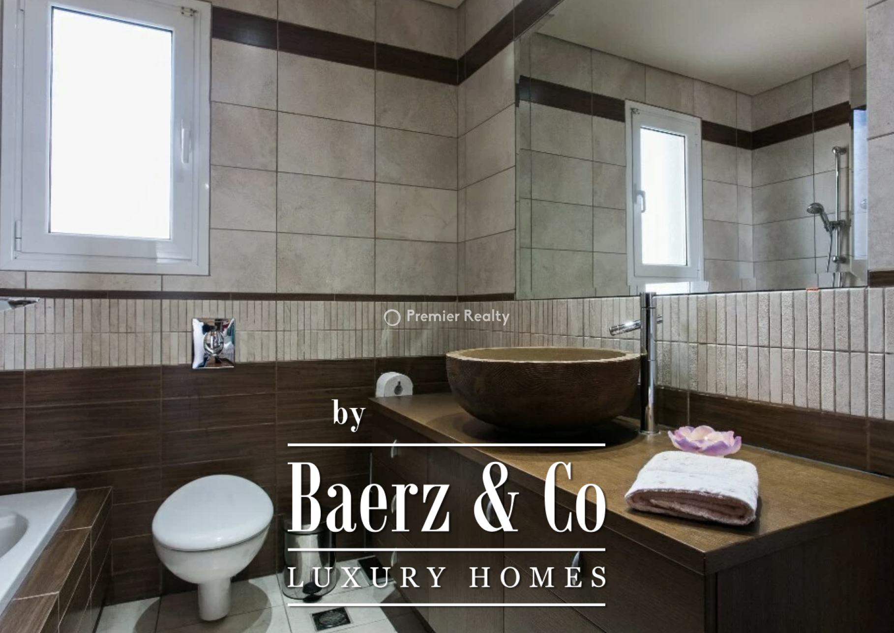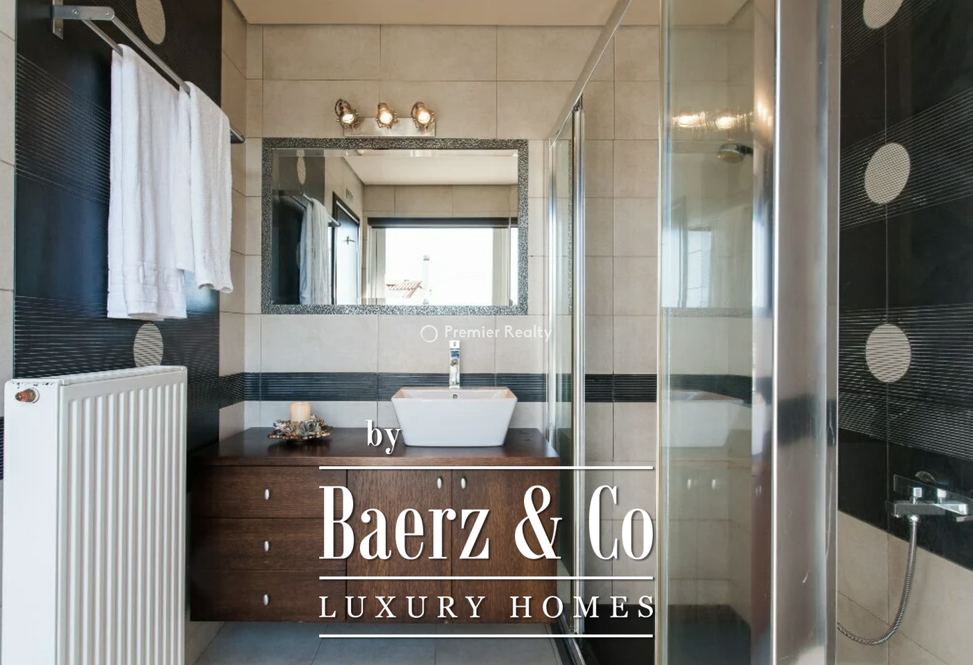 Vrijstaande villa in Kalivia Thorikou met 290 m² verfijnde leefruimte, gelegen op een perceel van 428 m². Deze woning ademt ingetogen elegantie met drie slaapkamers, waaronder een master suite met eigen badkamer en aparte kleedruimte. De lichte begane grond biedt een open woonkamer, eetkamer en volledig uitgeruste keuken met als middelpunt een royale open haard. Brede balkondeuren laten veel daglicht binnen en geven toegang tot het serene terras met een verwarmd zoutwater infinity zwembad van 52 m² en een tuin met boorput-irrigatiesysteem.