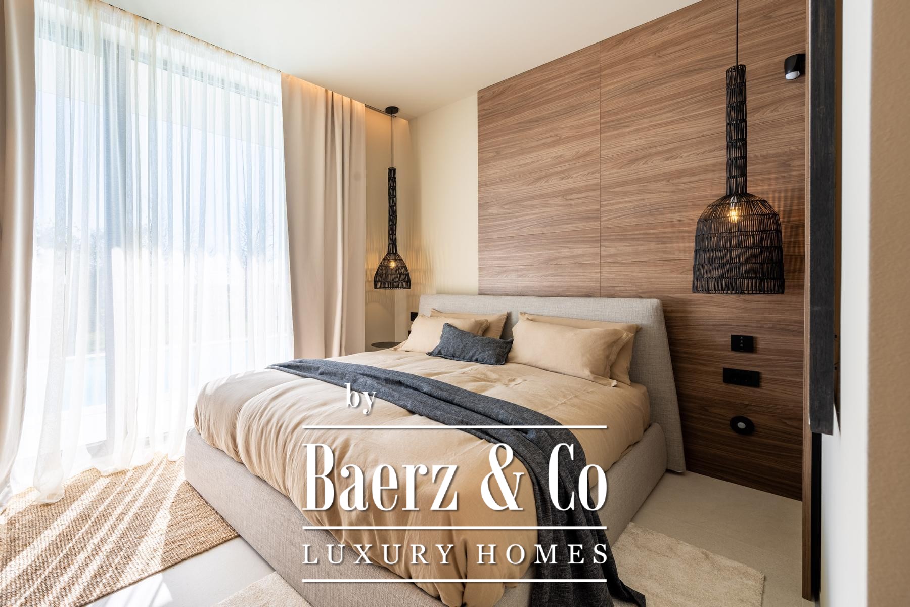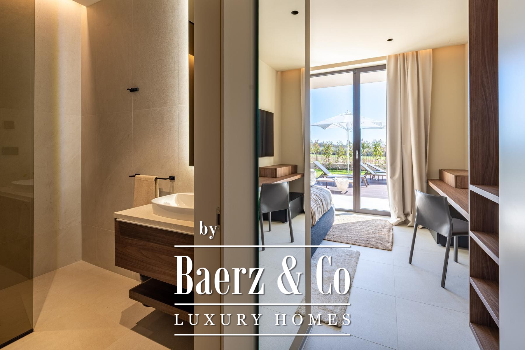 De architectuur loopt over in een elegante entreehal en vloeit door naar een royale, open keuken, eet- en woonkamer, die harmonieus aansluit op een ruim terras. Vier slaapkamers, elk voorzien van een eigen en-suite badkamer, zijn zodanig gepositioneerd dat optimale rust en comfort worden gegarandeerd. Een gastentoilet en subtiele details door het gehele huis verrijken het dagelijks wonen.