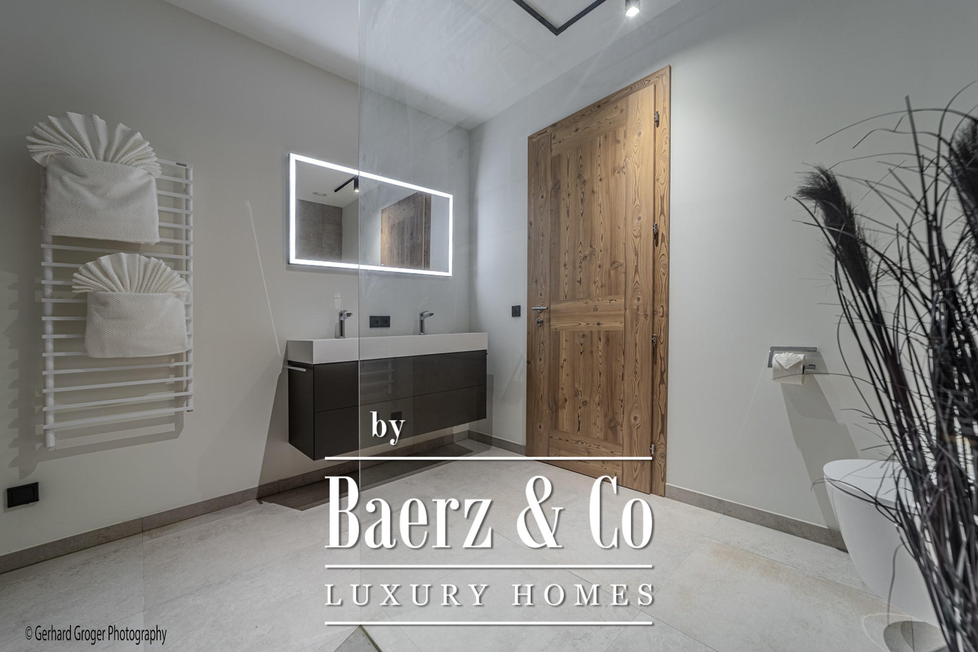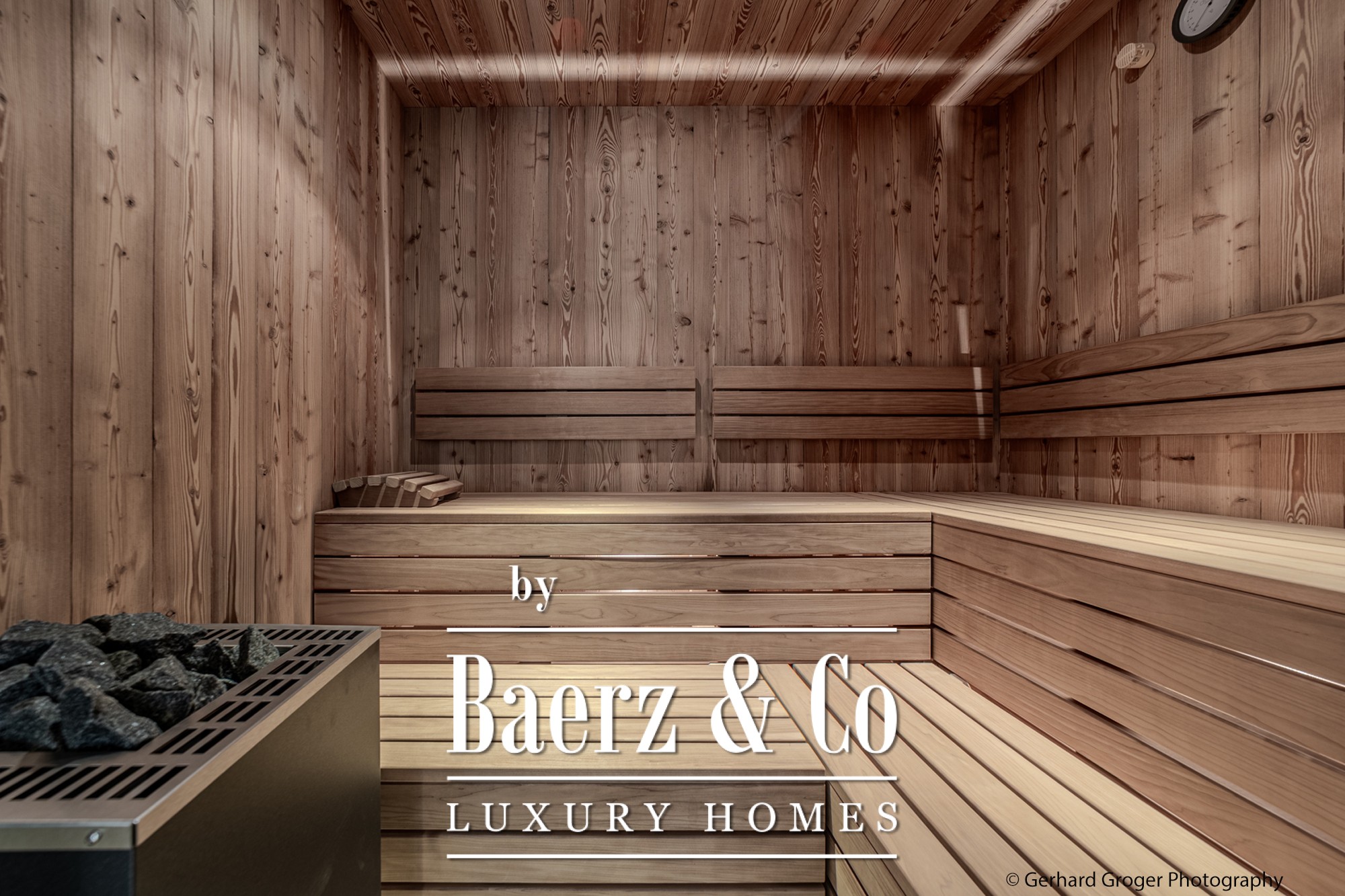 Op de kelderverdieping bevindt zich een privé slaapkamer met en-suite badkamer en een elegante wellnessruimte met sauna. Twee extra slaapkamers met eigen badkamers zijn gesitueerd op de begane grond, waardoor gezinsleden en gasten optimaal comfort genieten. De bovenverdieping biedt een lichte woon- en eetkamer, voorzien van een open haard en zichtbare dakspanten, grenzend aan ruime terrassen met panoramisch uitzicht op de Alpen.