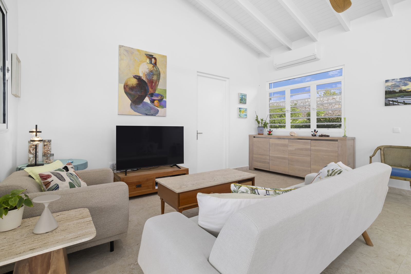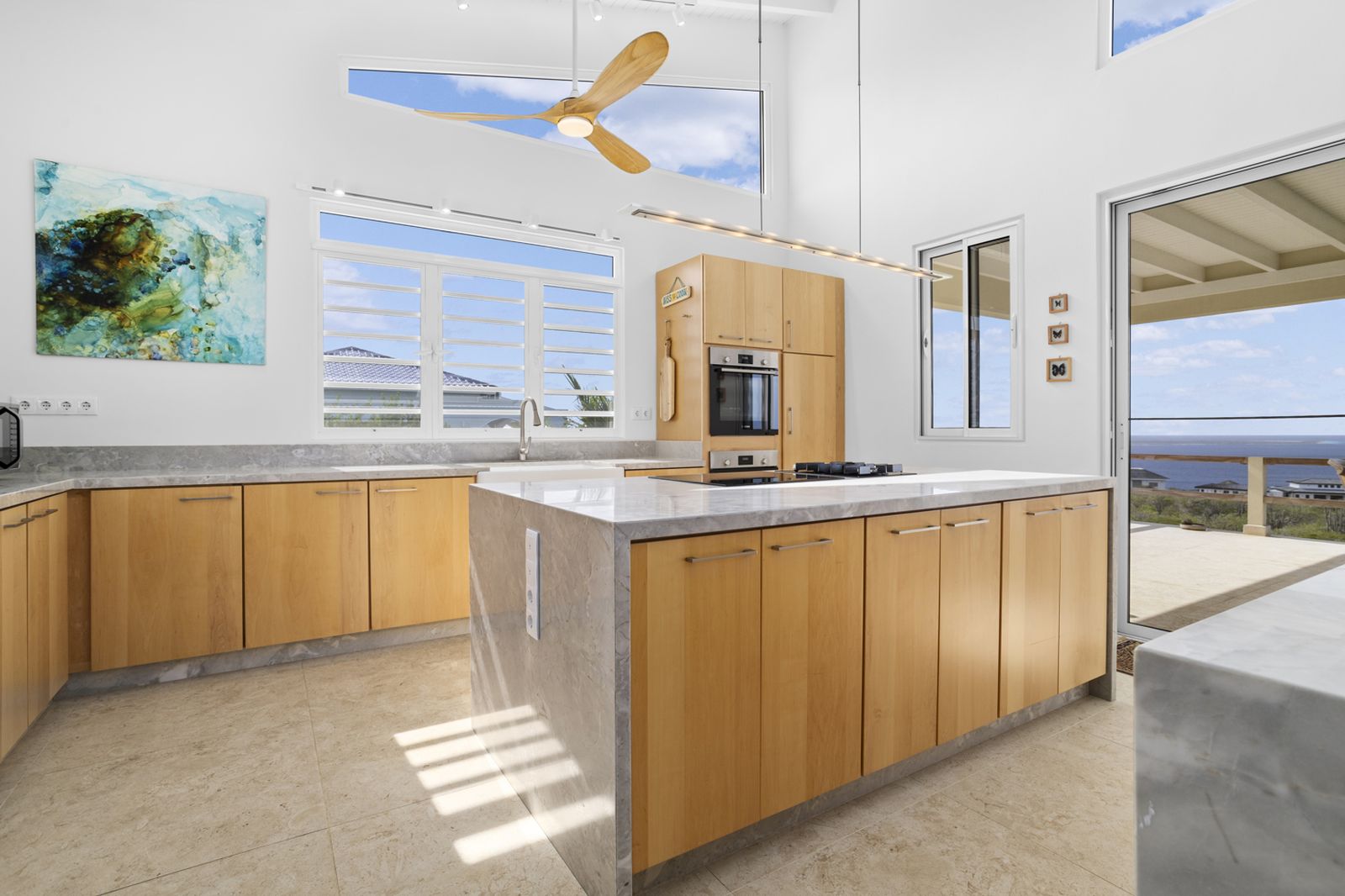 De strakke architectuur en grote schuifdeuren zorgen voor een natuurlijke verbinding tussen binnen en buiten. Het ruime terras aan zeezijde vormt een verlengstuk van de leefruimte en vangt de verkoelende passaatwinden, met vrij uitzicht van zonsopgang tot zonsondergang.