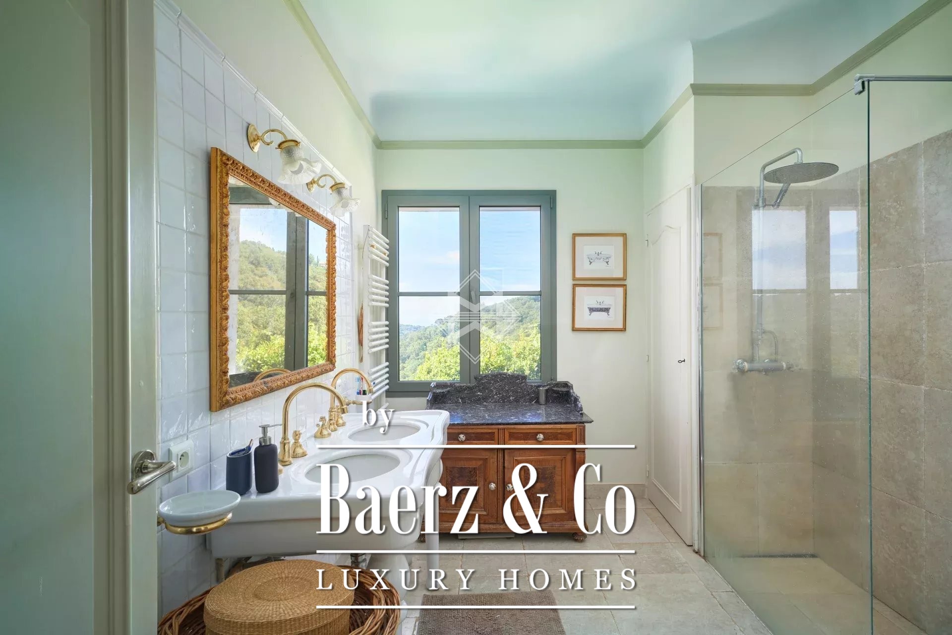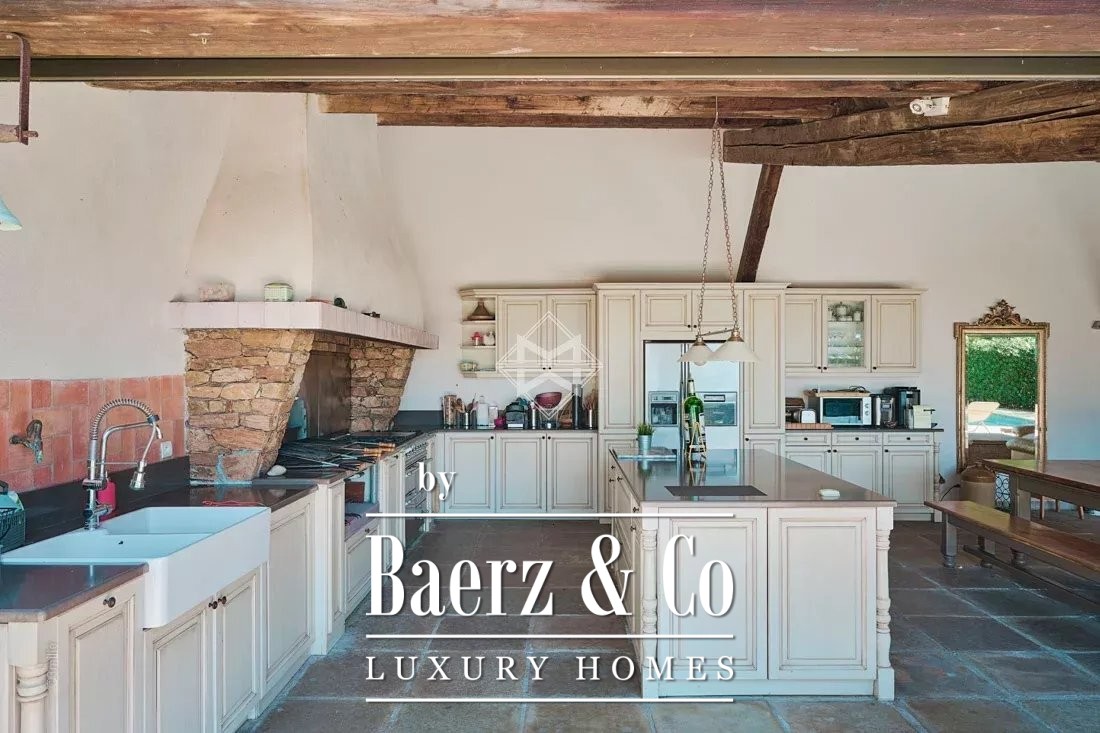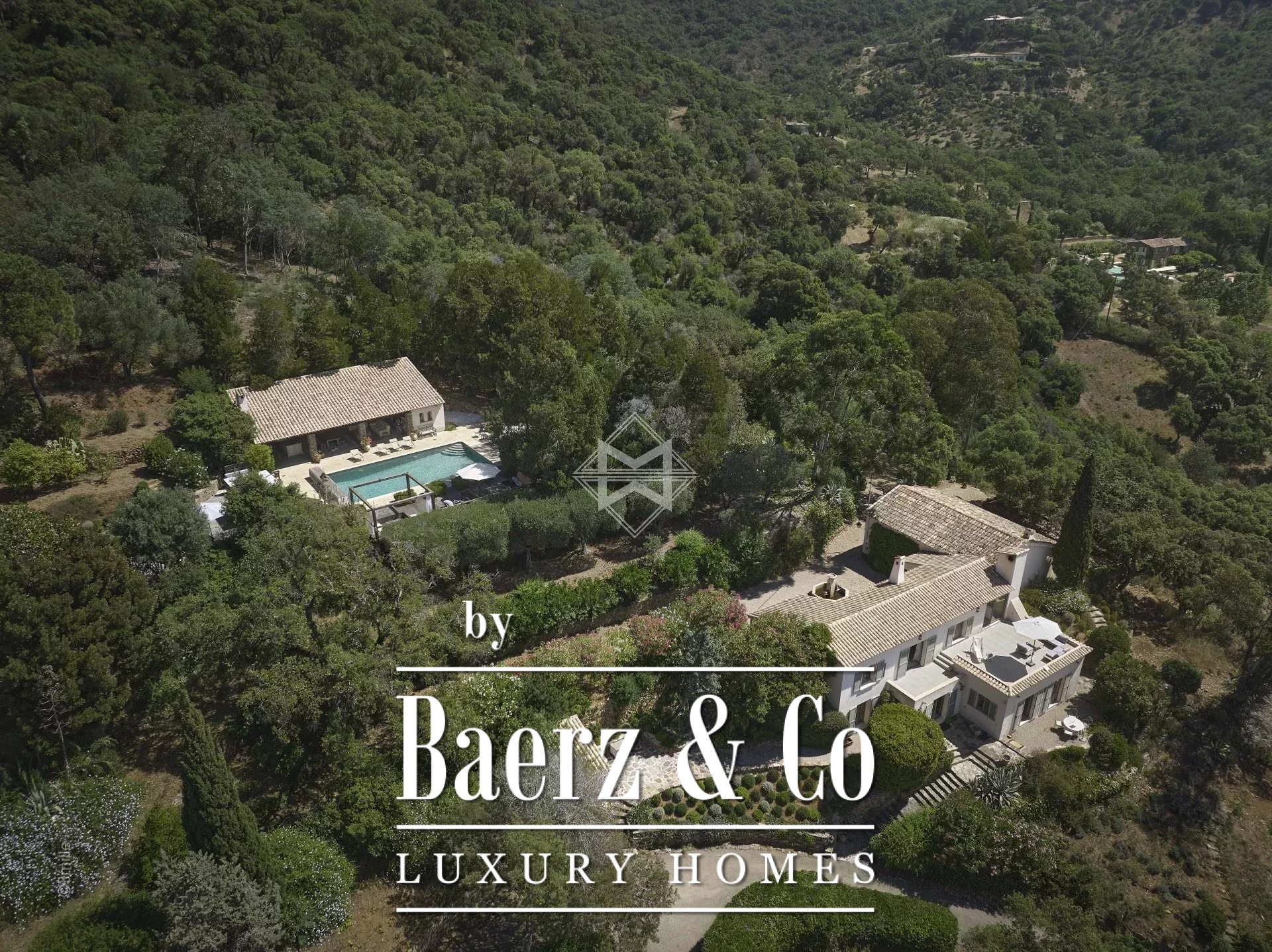 Dit landgoed in La Croix-Valmer geniet een uitzonderlijke ligging in de heuvels, omringd door een privépark van vijf hectare en honderden volwassen olijfbomen, eucalyptus, Libanonceders, magnolia's en Provençaalse beplanting. De eigendom omvat een hoofdresidentie van 230 m², een volledig zelfstandig gastenverblijf van 100 m² en een recent gerenoveerd poolhouse van 70 m², gelegen naast een opvallend blauwe Bali-zwembad van twaalf bij zes meter.