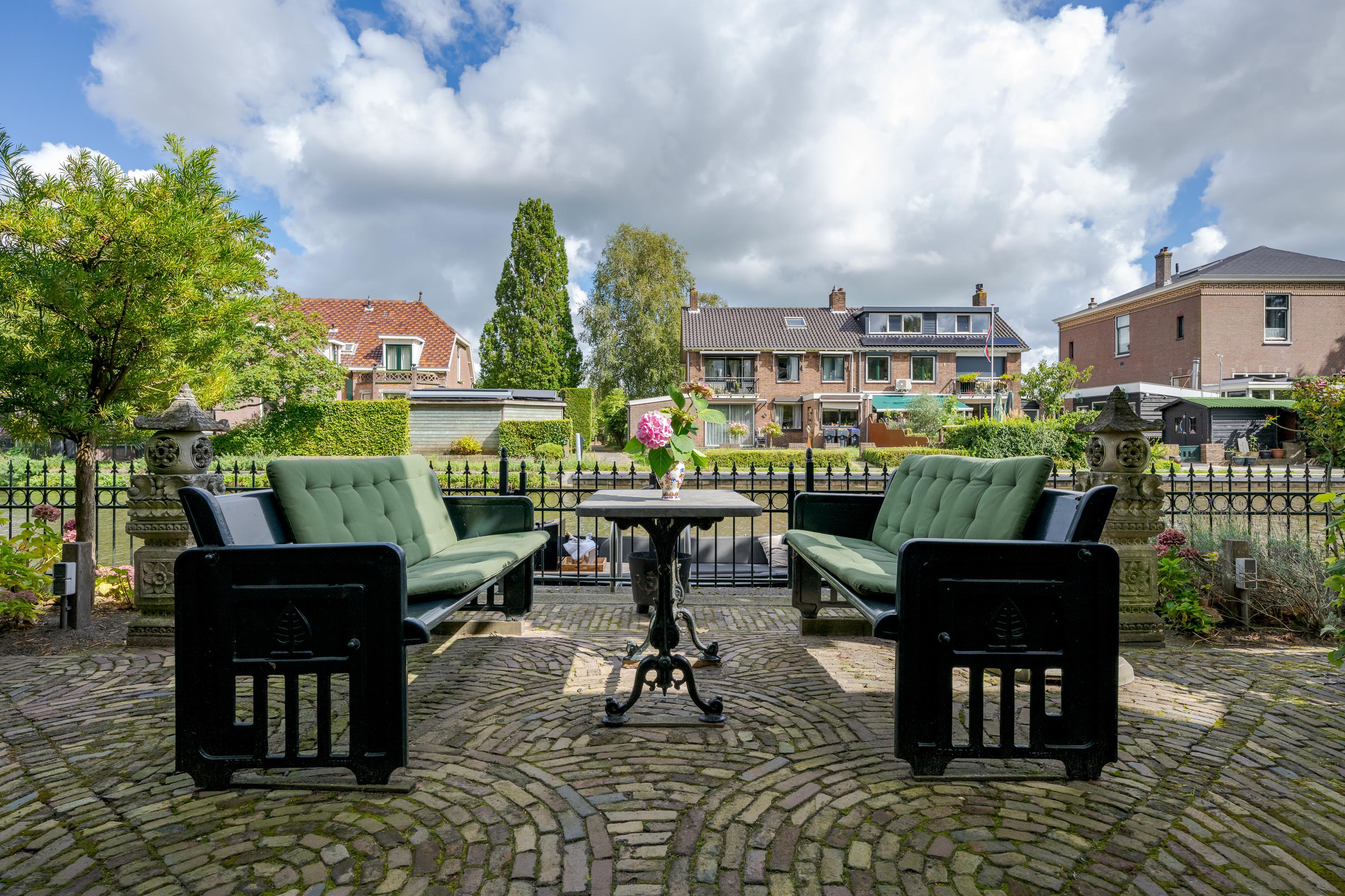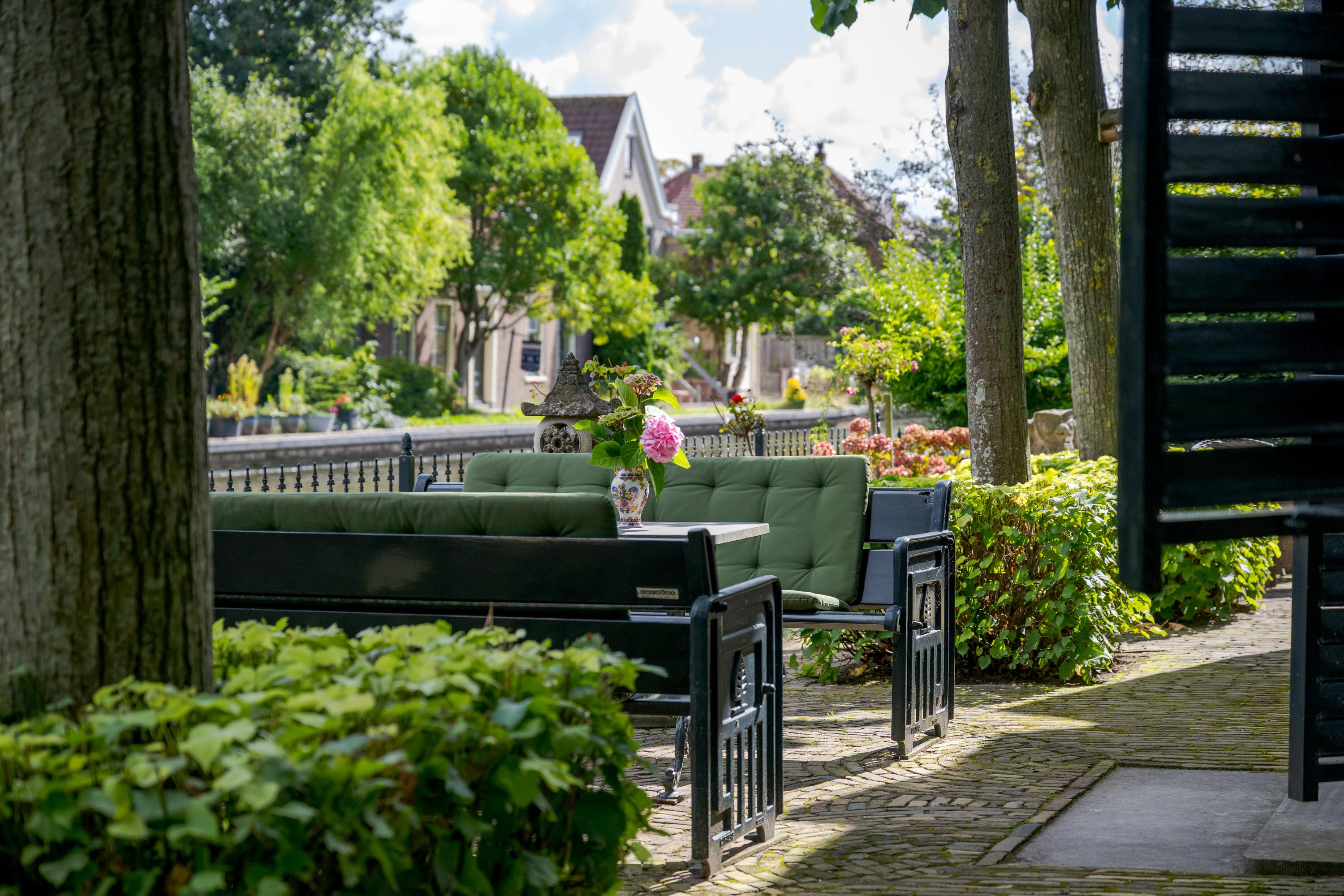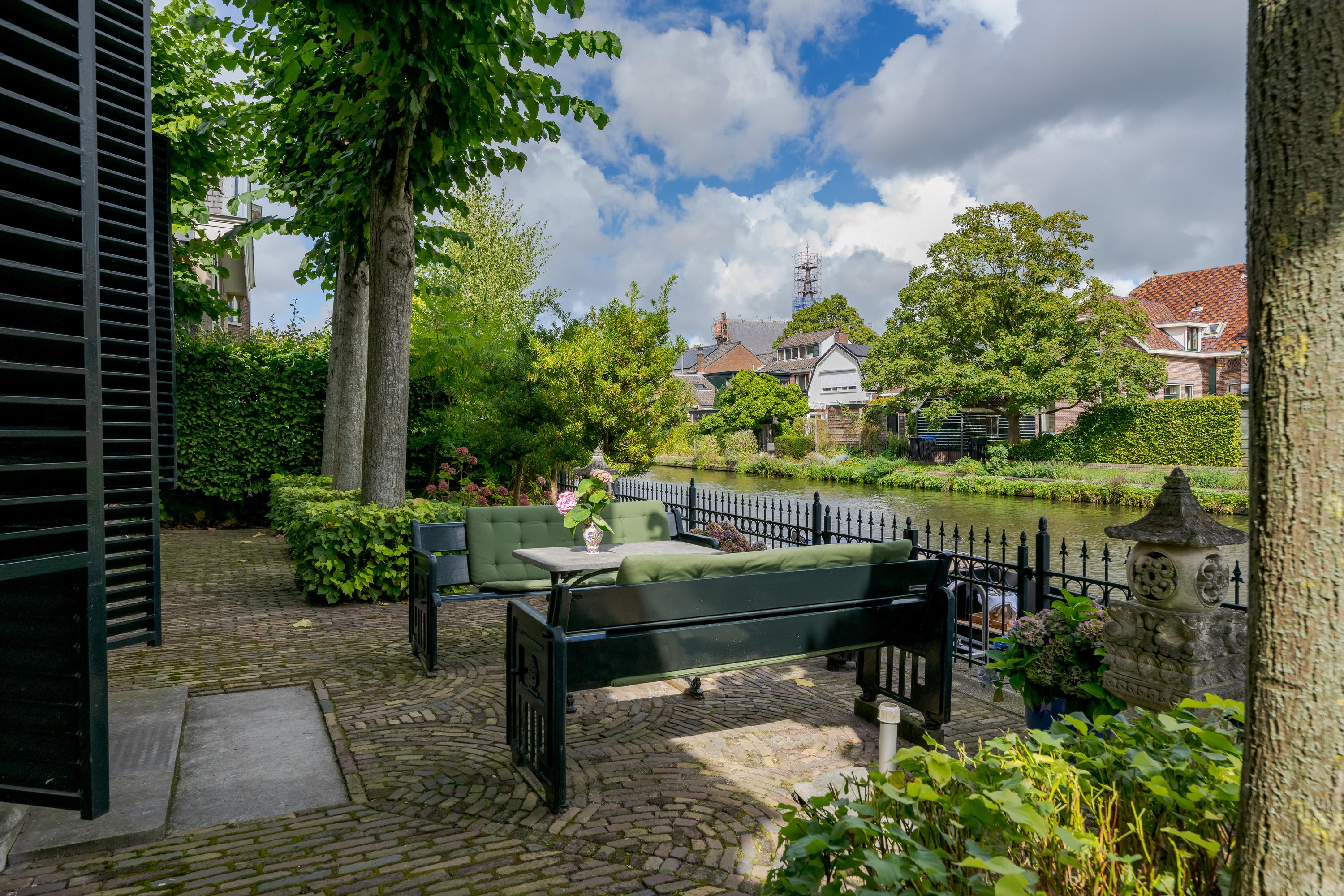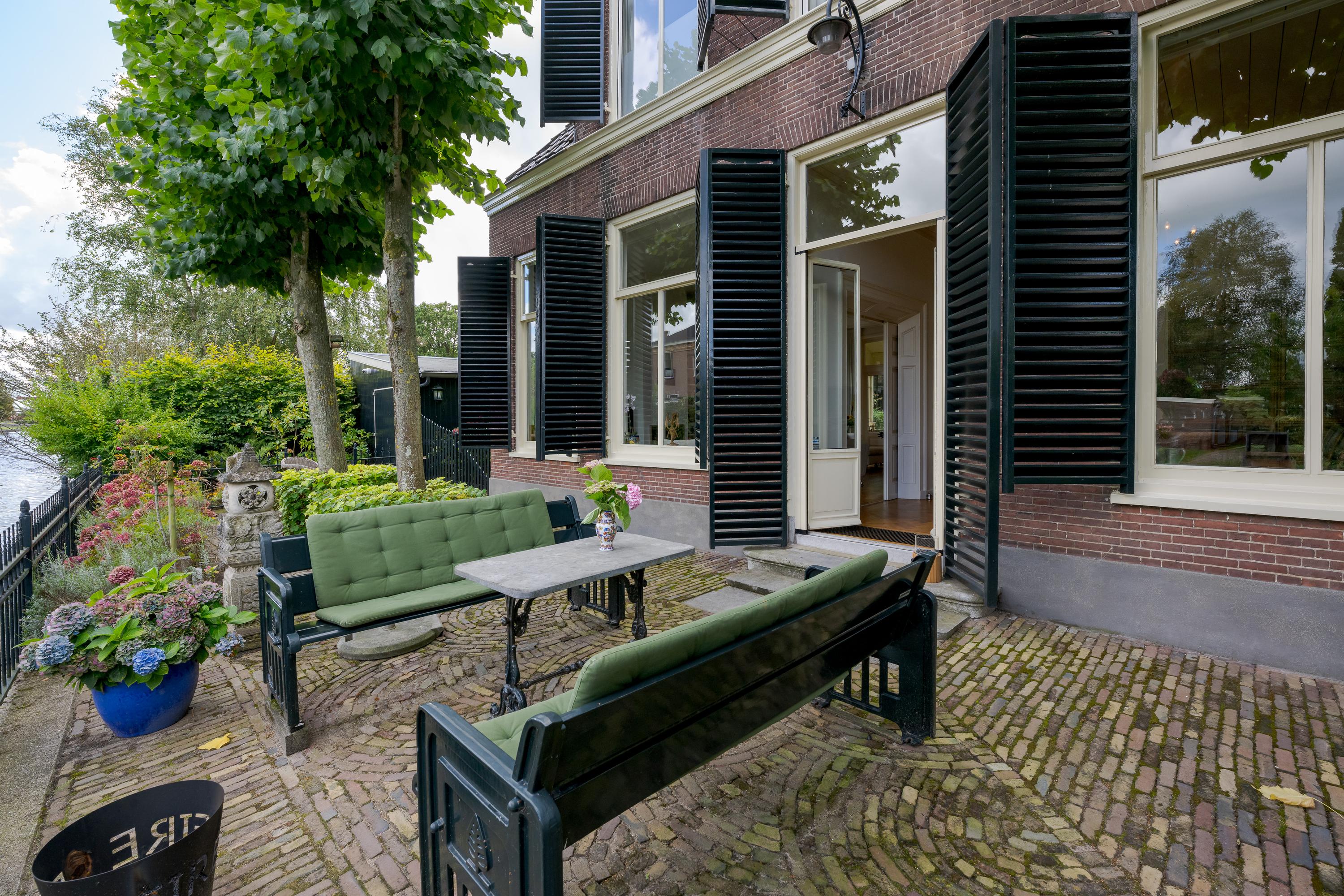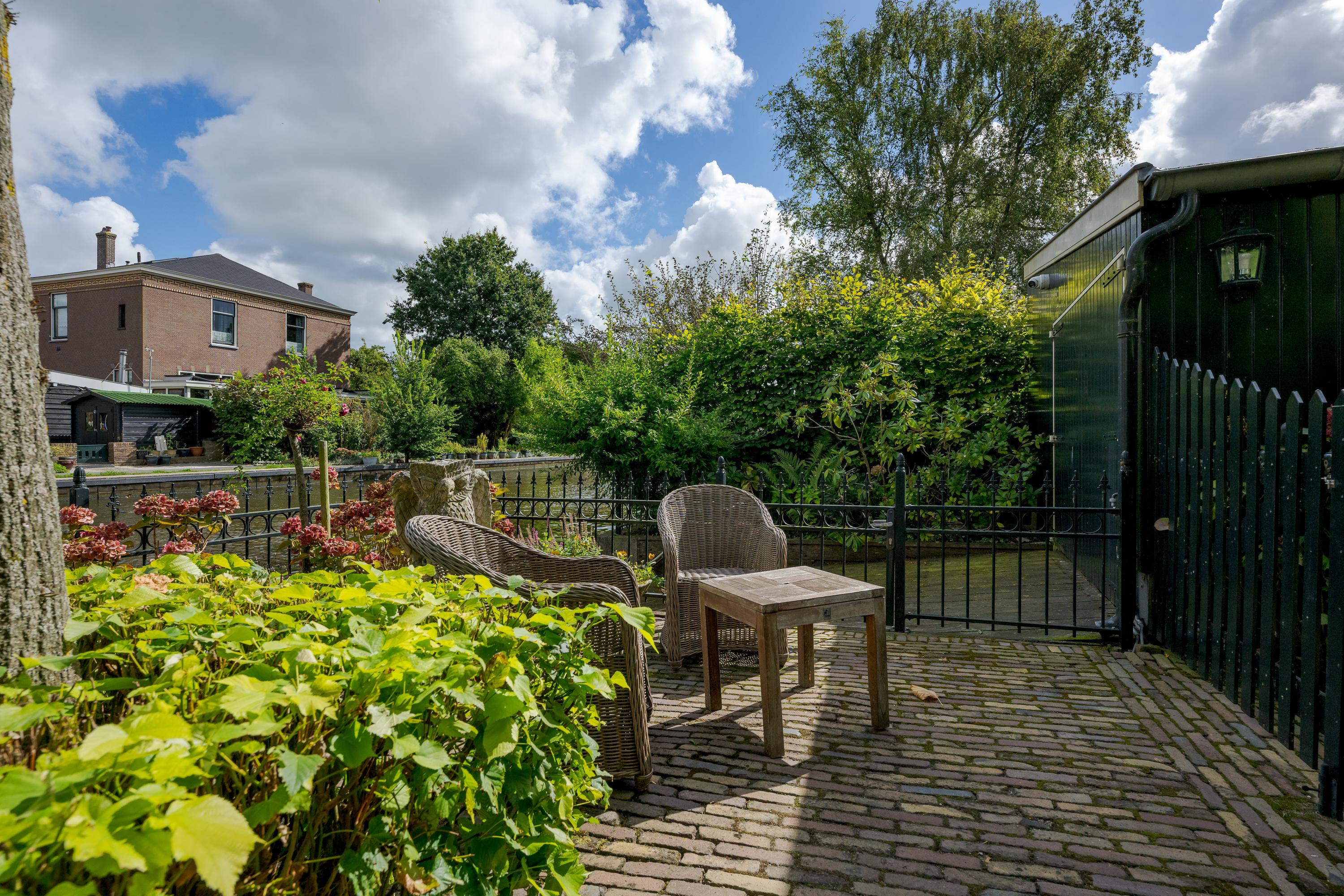 In de tuin met terras langs het water kunnen ontbijt, lunch, borrel en diner tegen een achtergrond van voorbijvarende bootjes genuttigd worden. Mocht er een bekende voorbij varen, dan kan er even aangelegd worden om in te stappen. Uiteraard zou je ook de eigen boot kunnen pakken. De woning beschikt immers over een eigen botenhuis met helling, waar je zou ook nog een insteekhaven zou kunnen maken en met een klein stukje varen ben je op De Kaag of naar het midden in het Groene Hart, het centrum van Leiden met haar vele romantische grachten en terrassen.