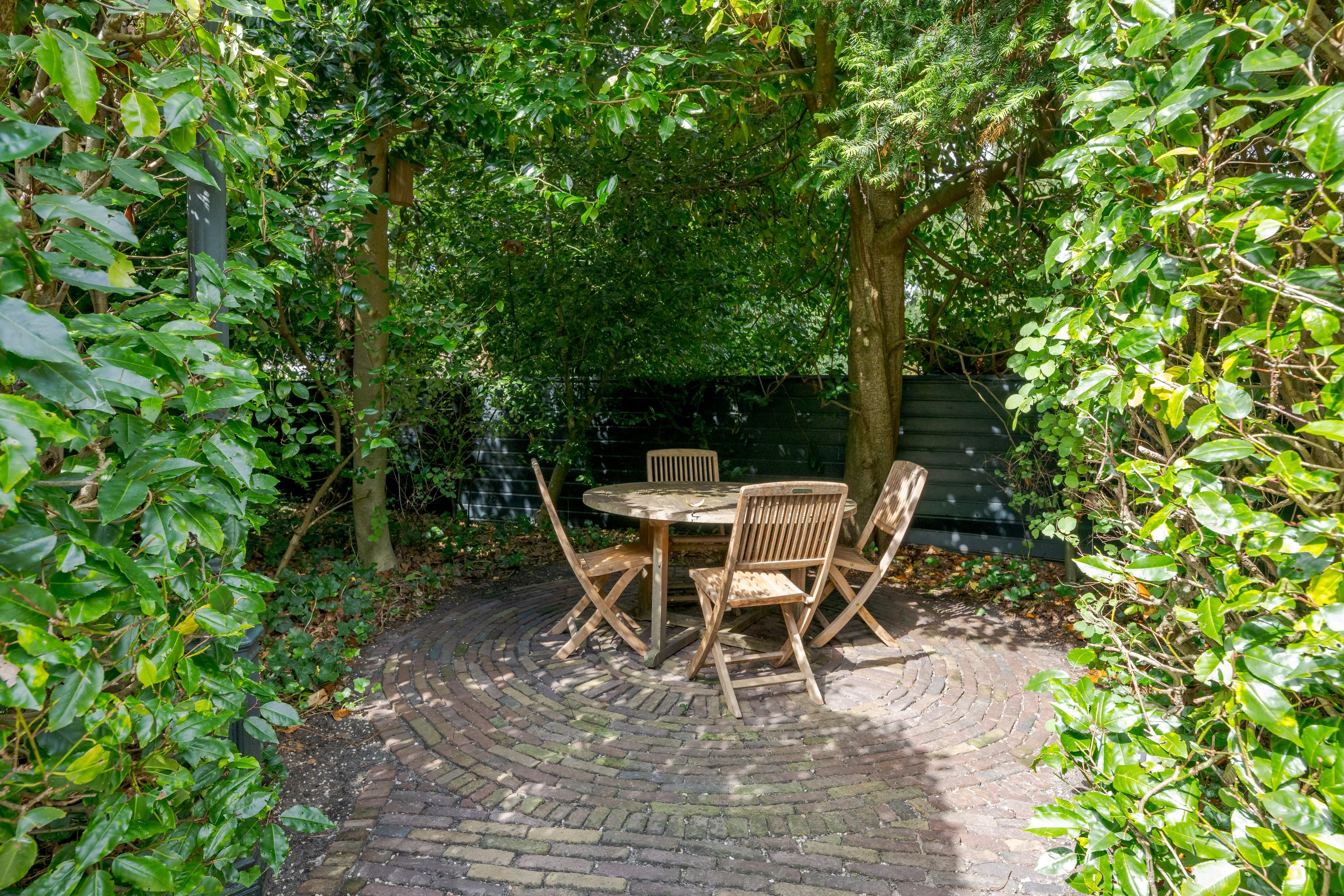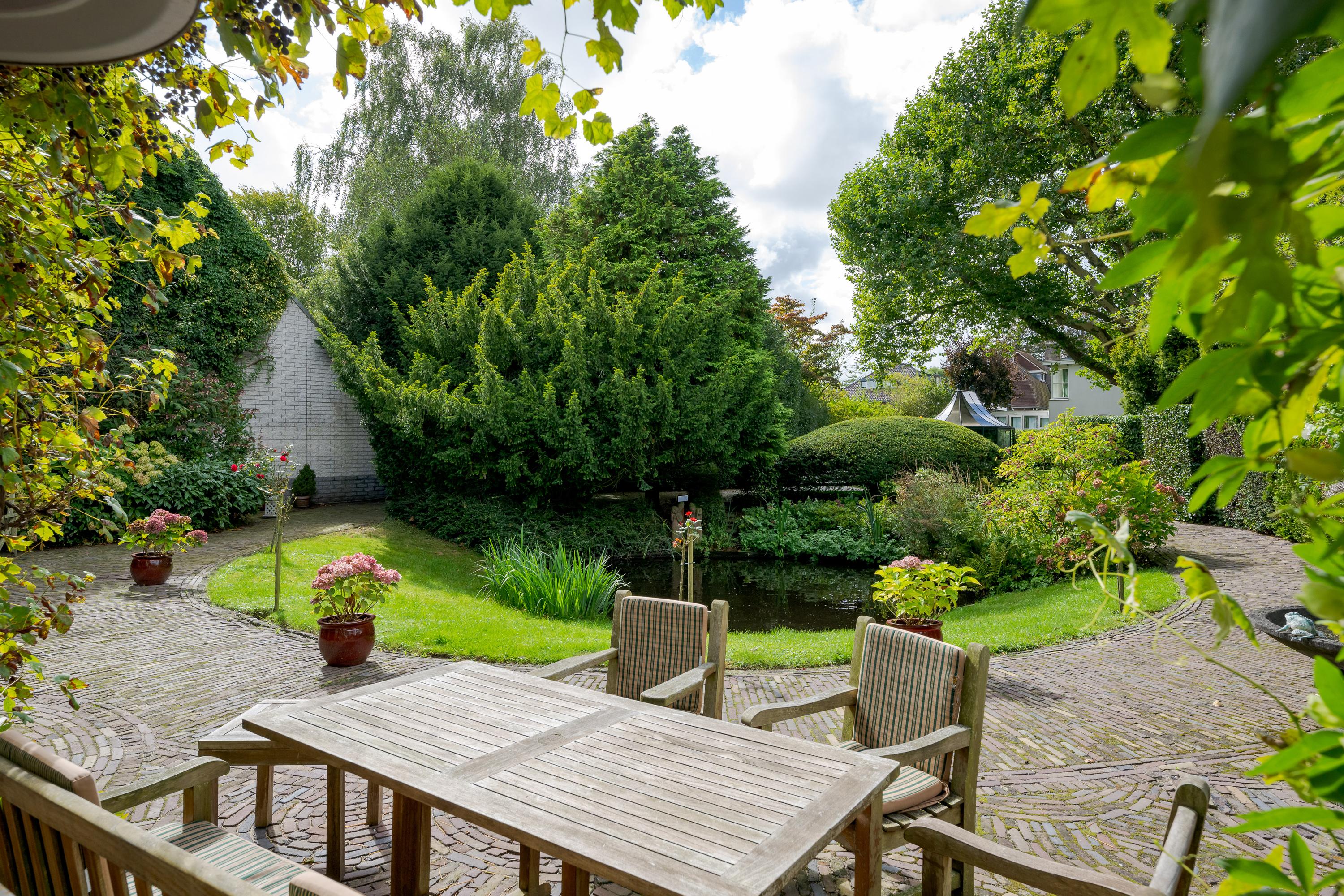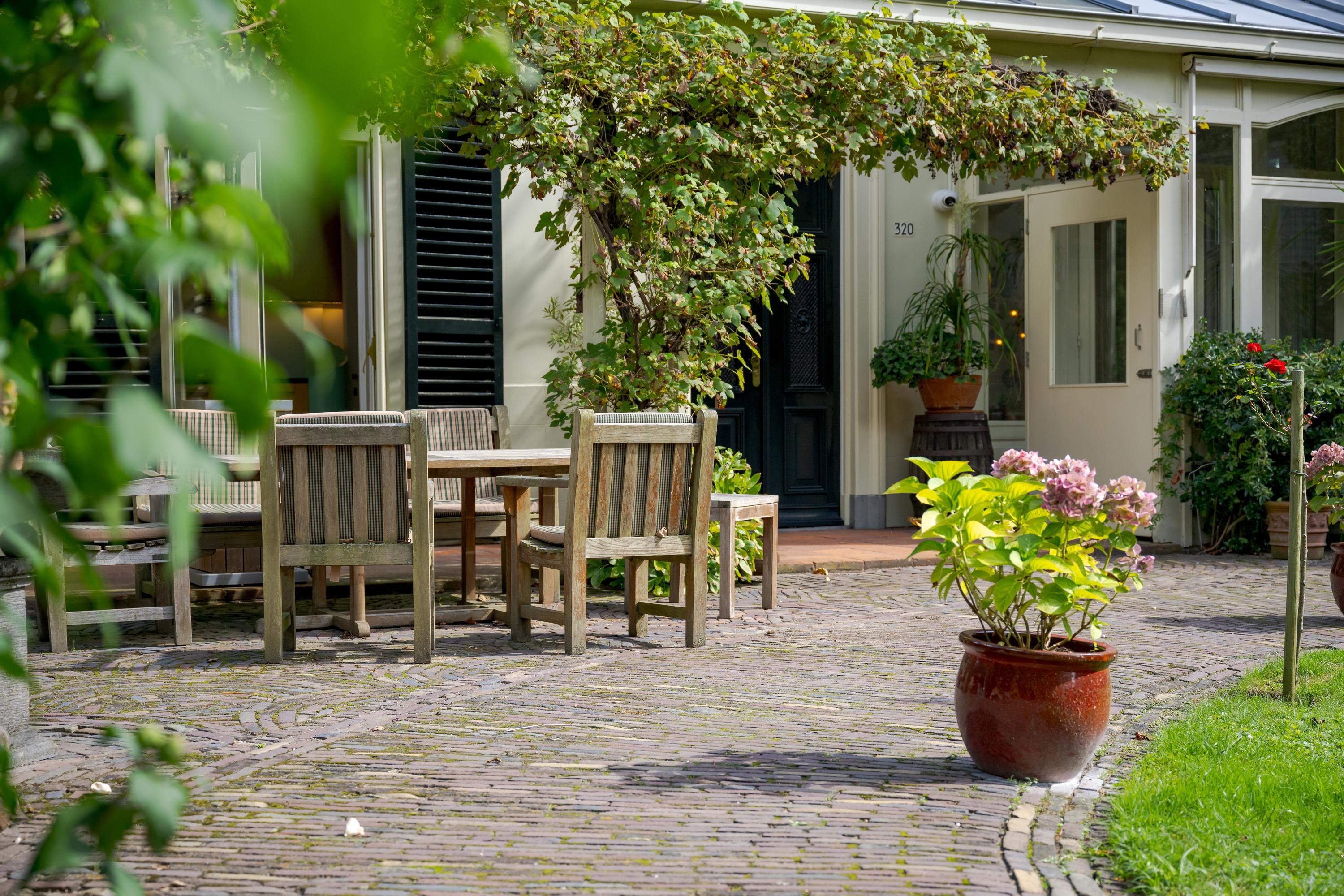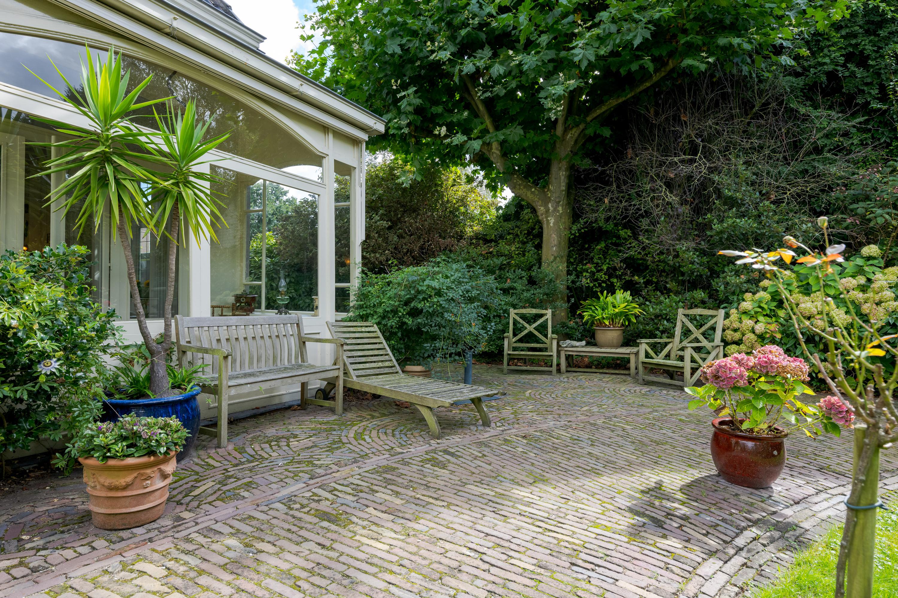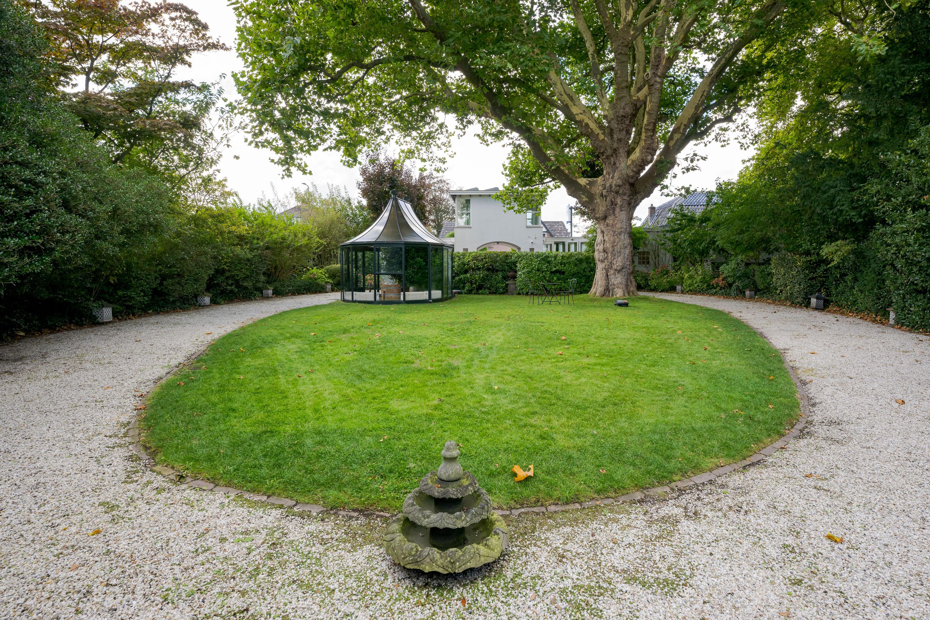 Nadat je het elektrische hek van het poortgebouw achter je hebt gesloten waan je je direct in een andere omgeving en komt de rust over je heen. Een centraal gazon met eeuwenoude plataan (1820) vormt het hart van de binnentuin. Bijzonder is de kas met mandarijnenboom naast de boom, waar je op een zonnige dag in hartje winter nog heerlijk kunt zitten. Zowel links als rechts van het gazon loopt een grindpad, waar je eventueel met de auto direct voor het huis kunt komen. Nu zijn er enkele hoekjes en zitjes waar je op verschillende momenten van de dag kan genieten van zon of schaduw. Iets verderop ligt een vijver die van een waterleidingsysteem met Rijnwater is voorzien, met daarachter de entree van de woning, links geflankeerd door een veranda en rechts een zonrijke serre. Ook hier zijn het alle jaargetijden genieten van deze grote tuin.