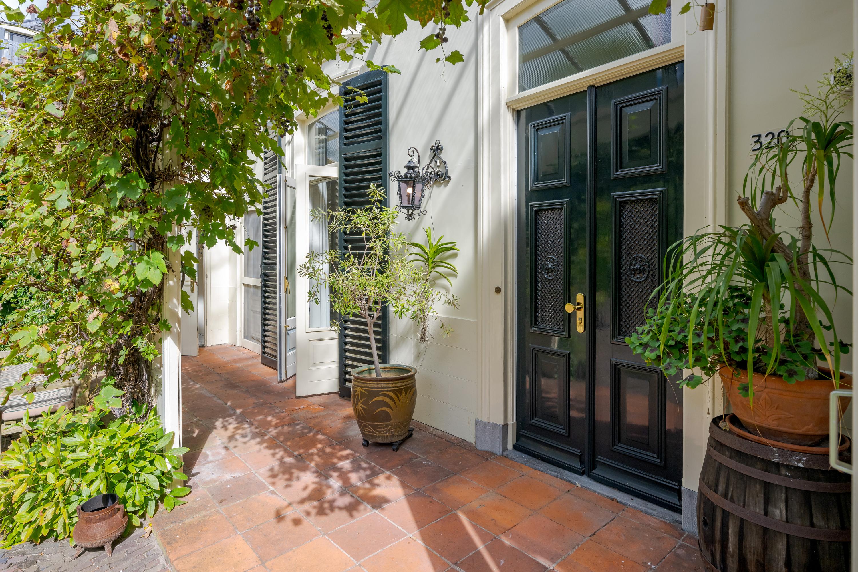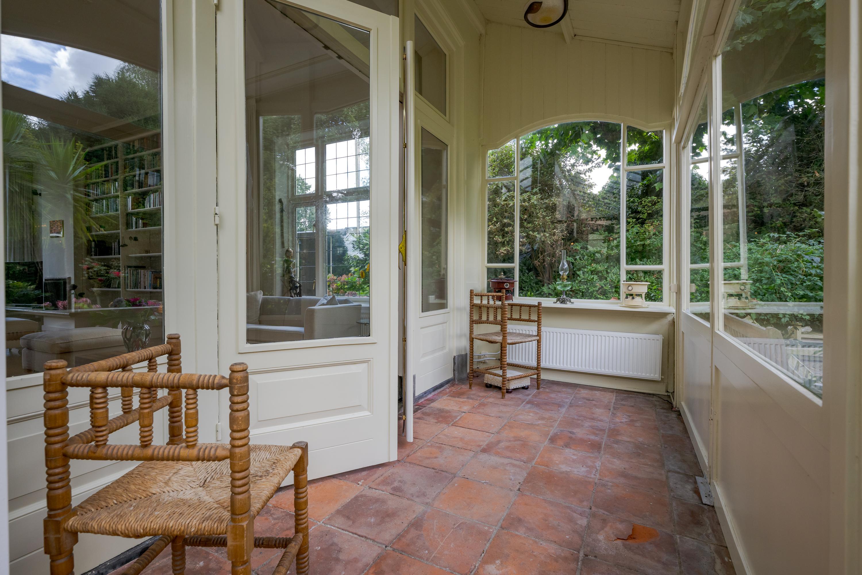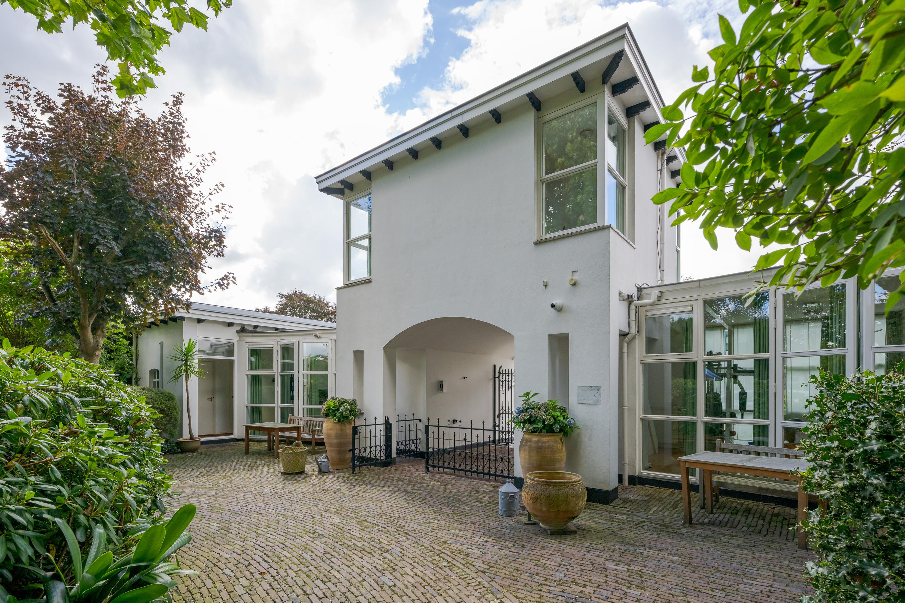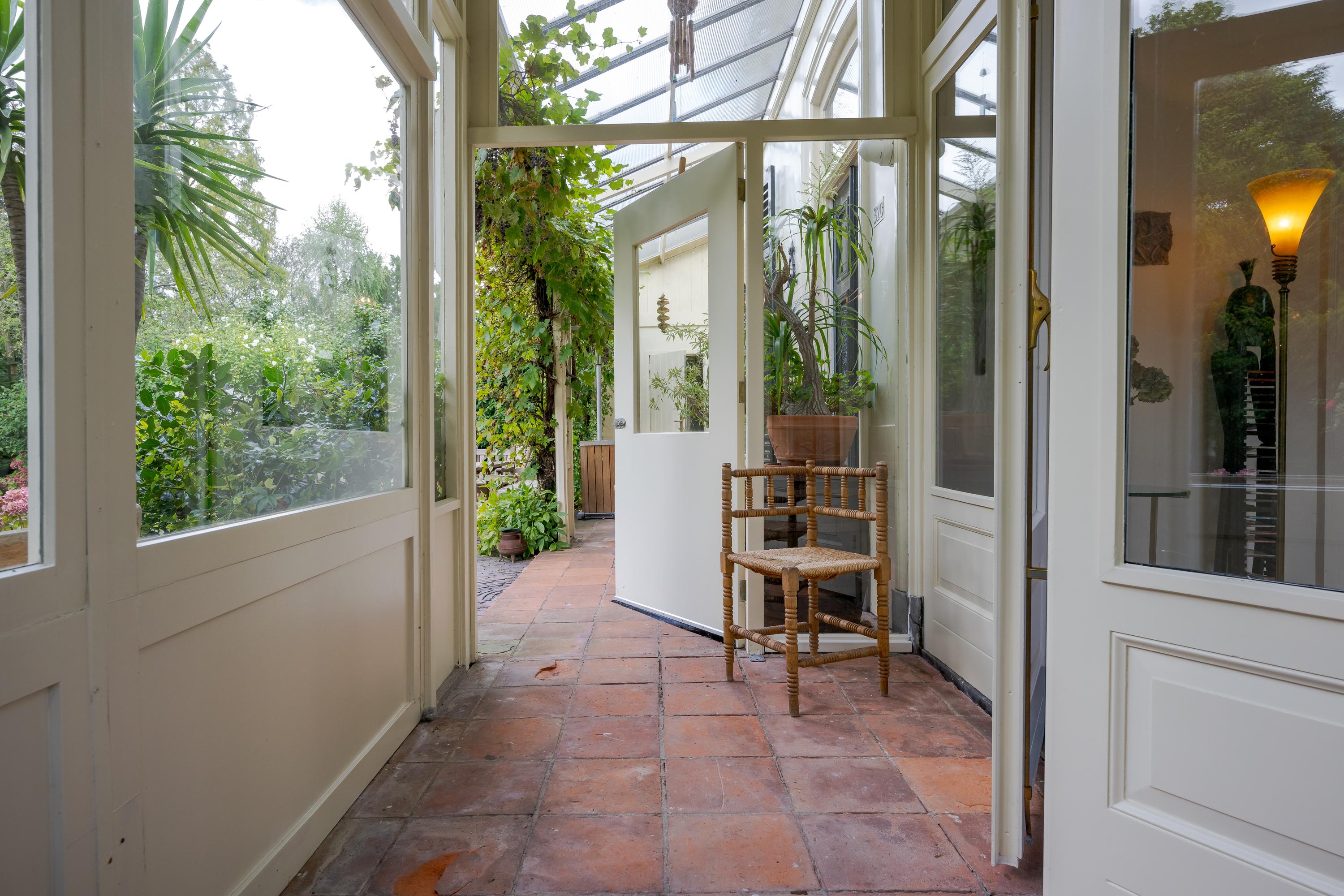 Nadat je het elektrische hek van het poortgebouw achter je hebt gesloten waan je je direct in een andere omgeving en komt de rust over je heen. Een centraal gazon met eeuwenoude plataan (1820) vormt het hart van de binnentuin. Bijzonder is de kas met mandarijnenboom naast de boom, waar je op een zonnige dag in hartje winter nog heerlijk kunt zitten. Zowel links als rechts van het gazon loopt een grindpad, waar je eventueel met de auto direct voor het huis kunt komen. Nu zijn er enkele hoekjes en zitjes waar je op verschillende momenten van de dag kan genieten van zon of schaduw. Iets verderop ligt een vijver die van een waterleidingsysteem met Rijnwater is voorzien, met daarachter de entree van de woning, links geflankeerd door een veranda en rechts een zonrijke serre. Ook hier zijn het alle jaargetijden genieten van deze grote tuin.