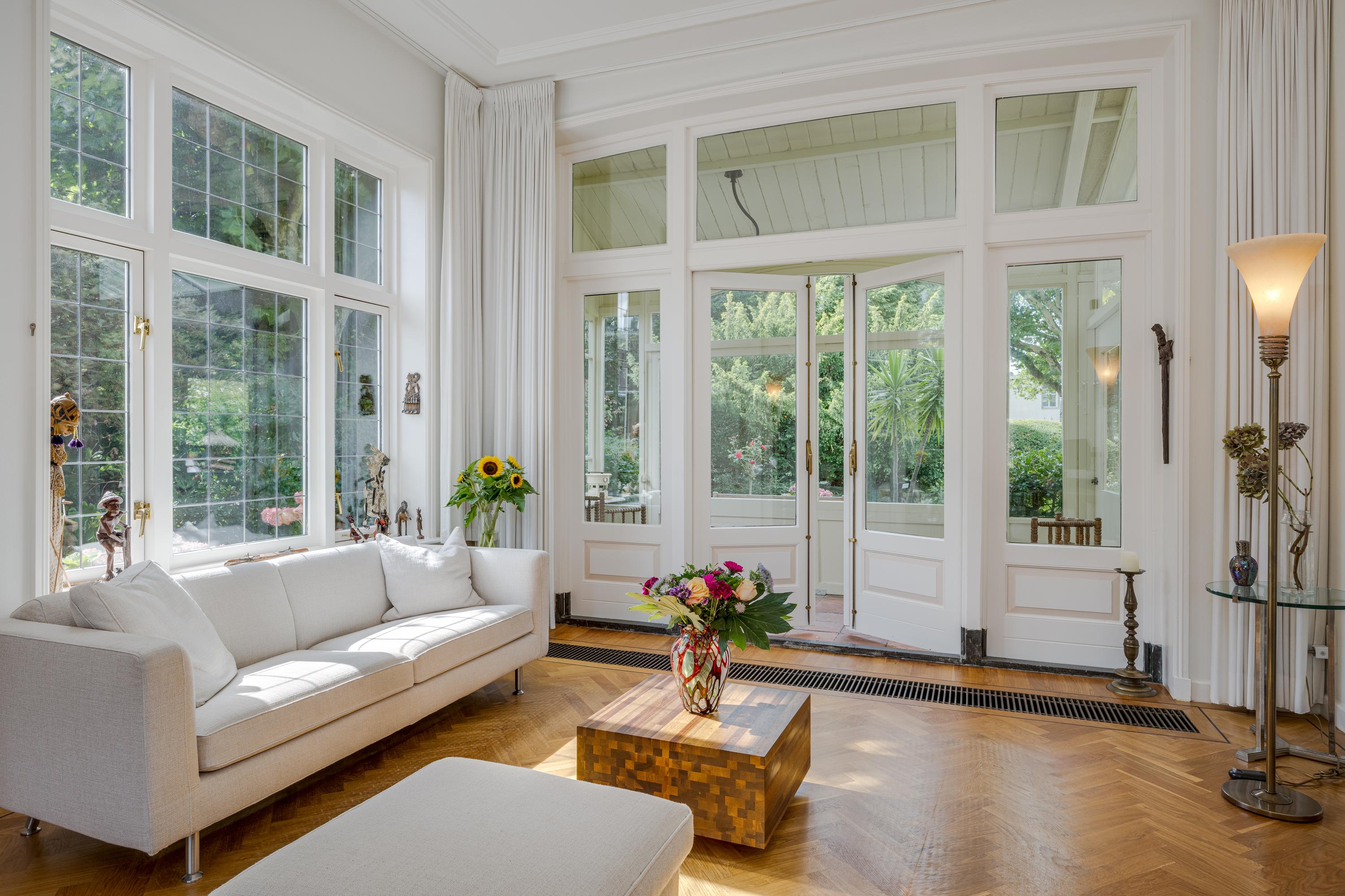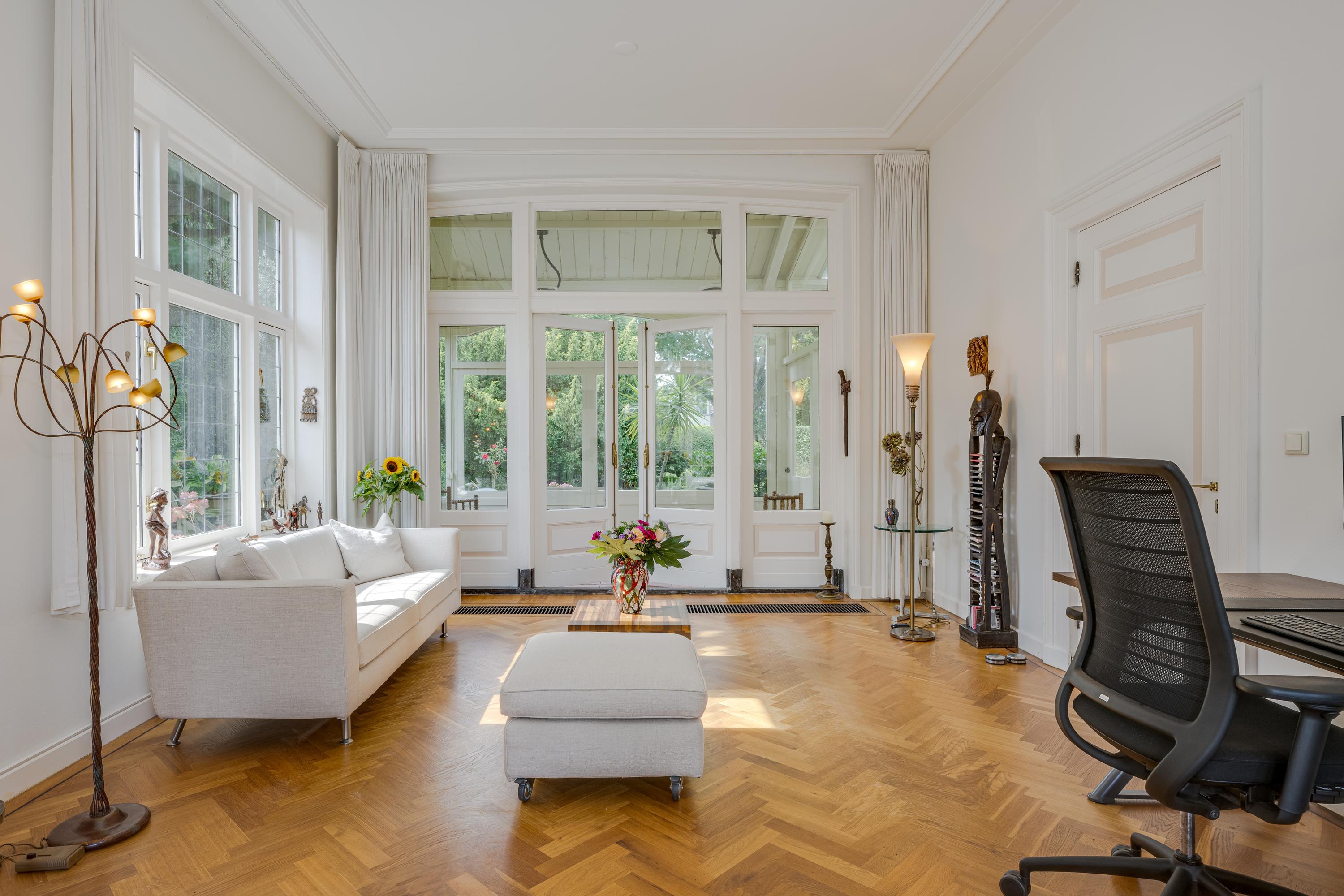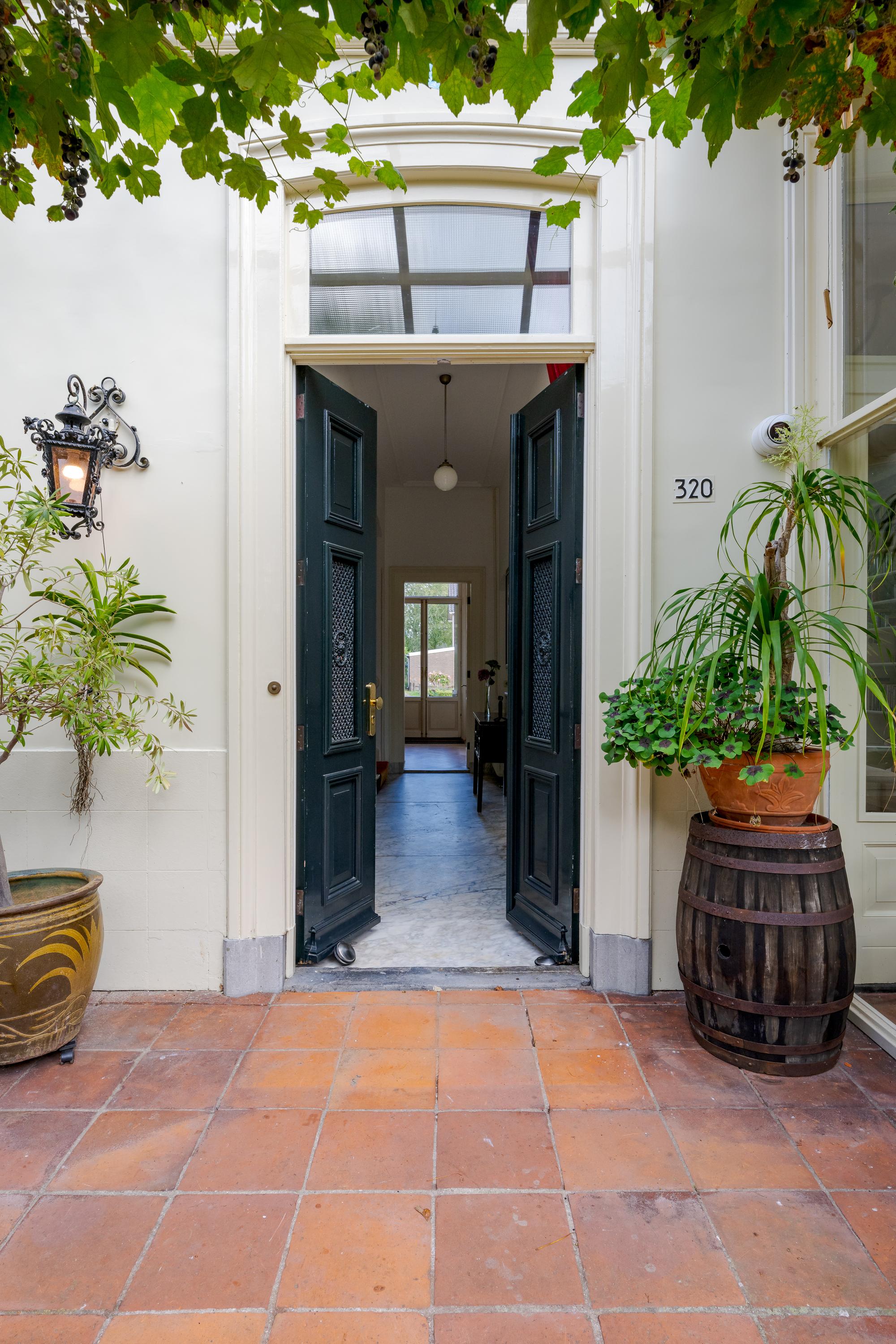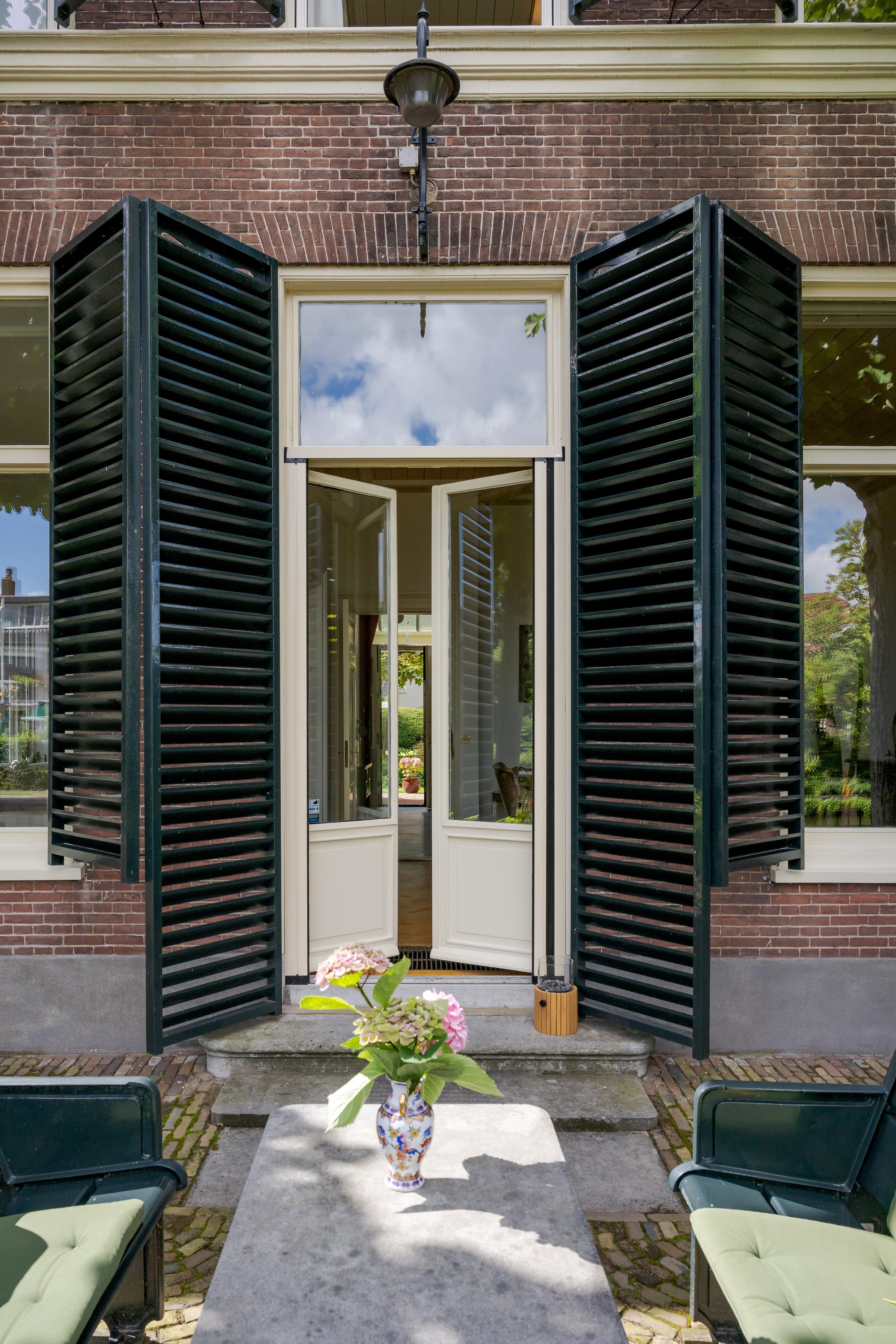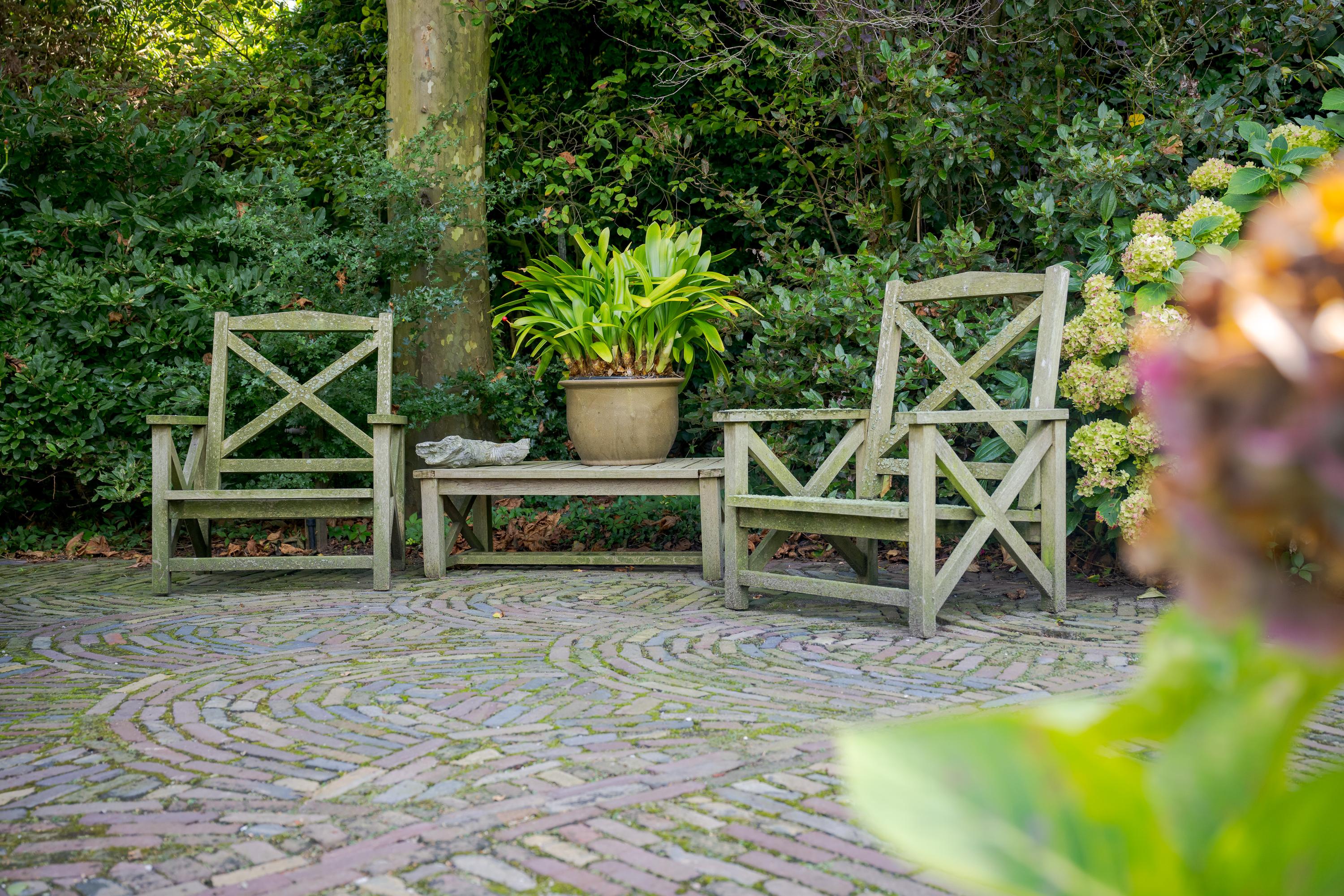 Nadat je het elektrische hek van het poortgebouw achter je hebt gesloten waan je je direct in een andere omgeving en komt de rust over je heen. Een centraal gazon met eeuwenoude plataan (1820) vormt het hart van de binnentuin. Bijzonder is de kas met mandarijnenboom naast de boom, waar je op een zonnige dag in hartje winter nog heerlijk kunt zitten. Zowel links als rechts van het gazon loopt een grindpad, waar je eventueel met de auto direct voor het huis kunt komen. Nu zijn er enkele hoekjes en zitjes waar je op verschillende momenten van de dag kan genieten van zon of schaduw. Iets verderop ligt een vijver die van een waterleidingsysteem met Rijnwater is voorzien, met daarachter de entree van de woning, links geflankeerd door een veranda en rechts een zonrijke serre. Ook hier zijn het alle jaargetijden genieten van deze grote tuin.