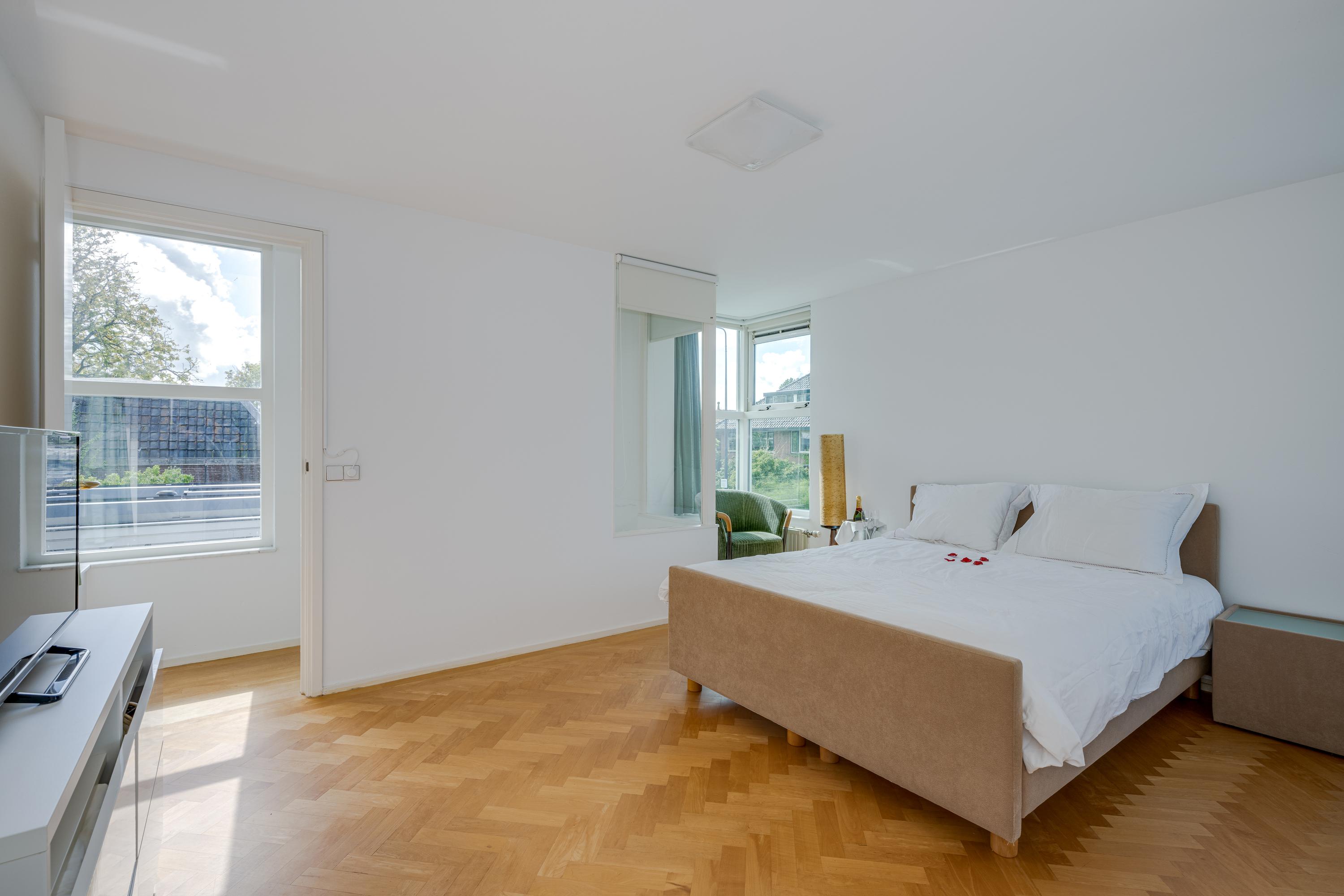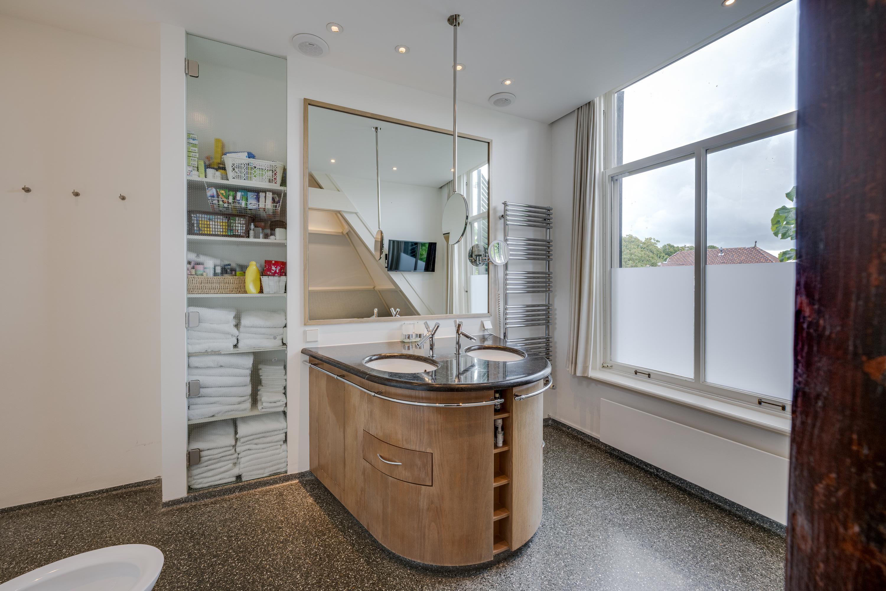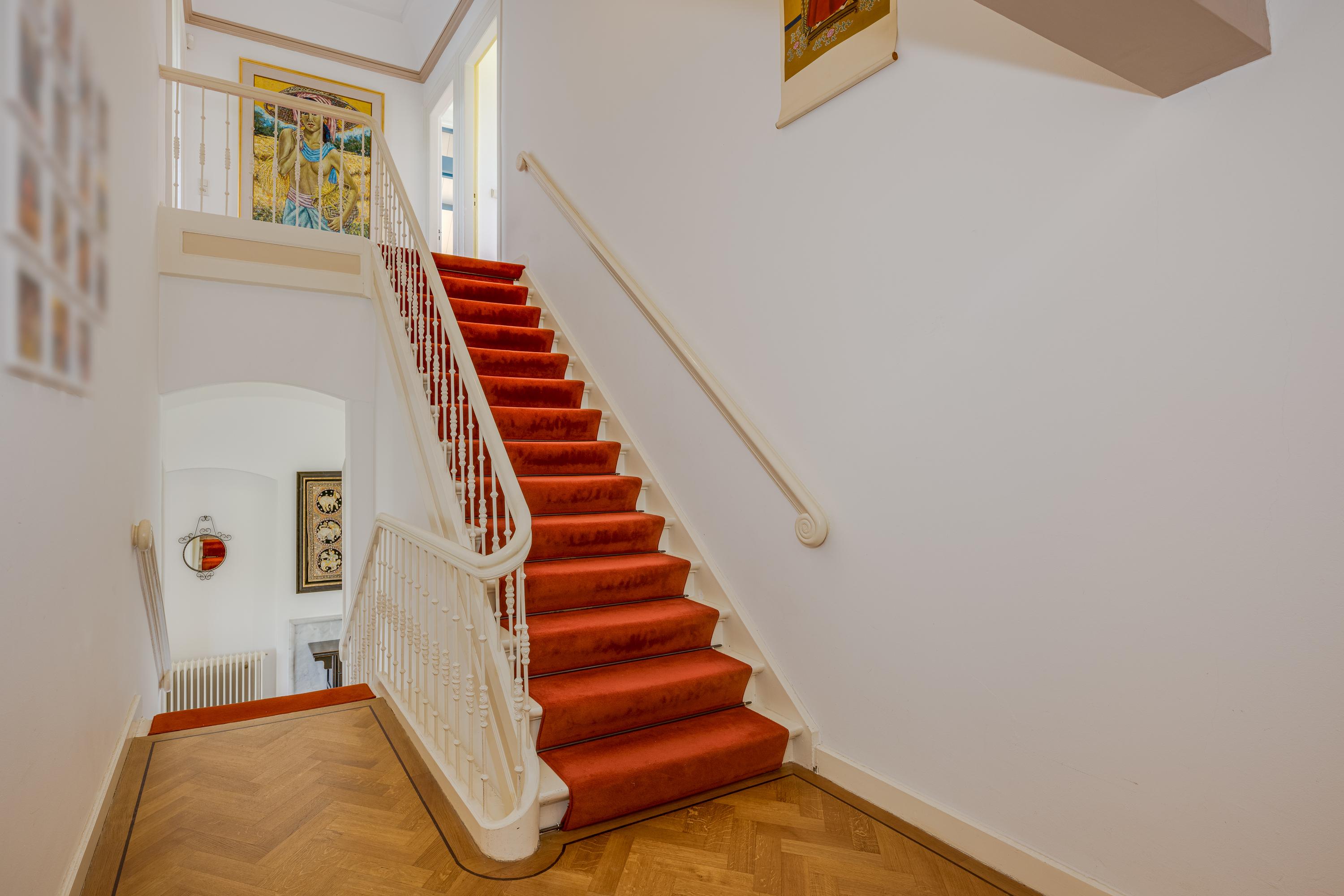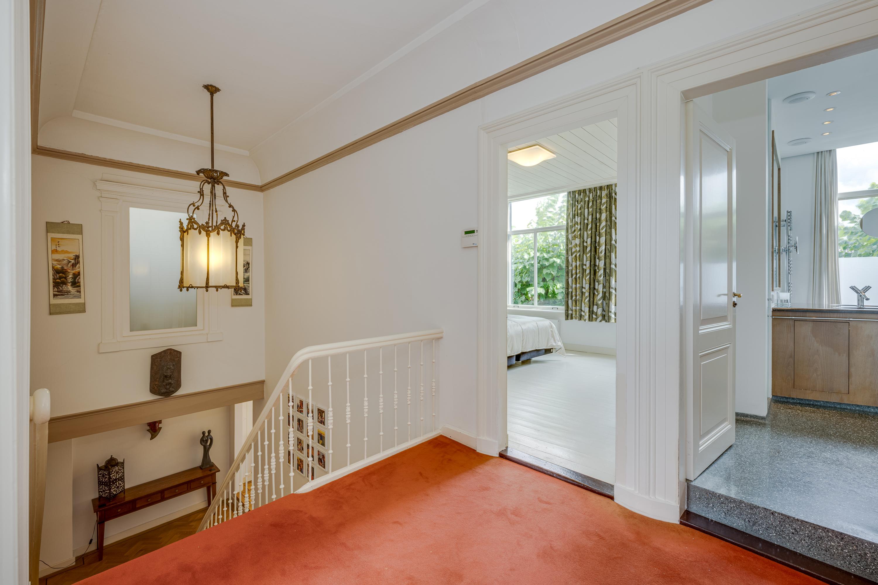 De bordestrap vormt het hart van het huis en de verbinding, met een toegang tot een ruime toiletruimte met wandcloset en fontein, naar de slaapverdieping. Hier zijn drie ruime slaapkamers met de master bedroom aan de waterzijde en inloopkast. De slaapkamers typeren zich door de hoge plafonds en het uitzicht op de tuin en het water, waarbij de master bedroom eruit springt door het formaat. De badkamer is voorzien van alle luxe met een granito-vloer, vloerverwarming en 2 in natuursteen ingebouwde wastafels. Niet alleen de hygiëne, maar ook ontspanning: naast een verzonken duo-bad, een doucheruimte met stortdouche en “Turks bad”, sauna, een wandbidet en een wandcloset.