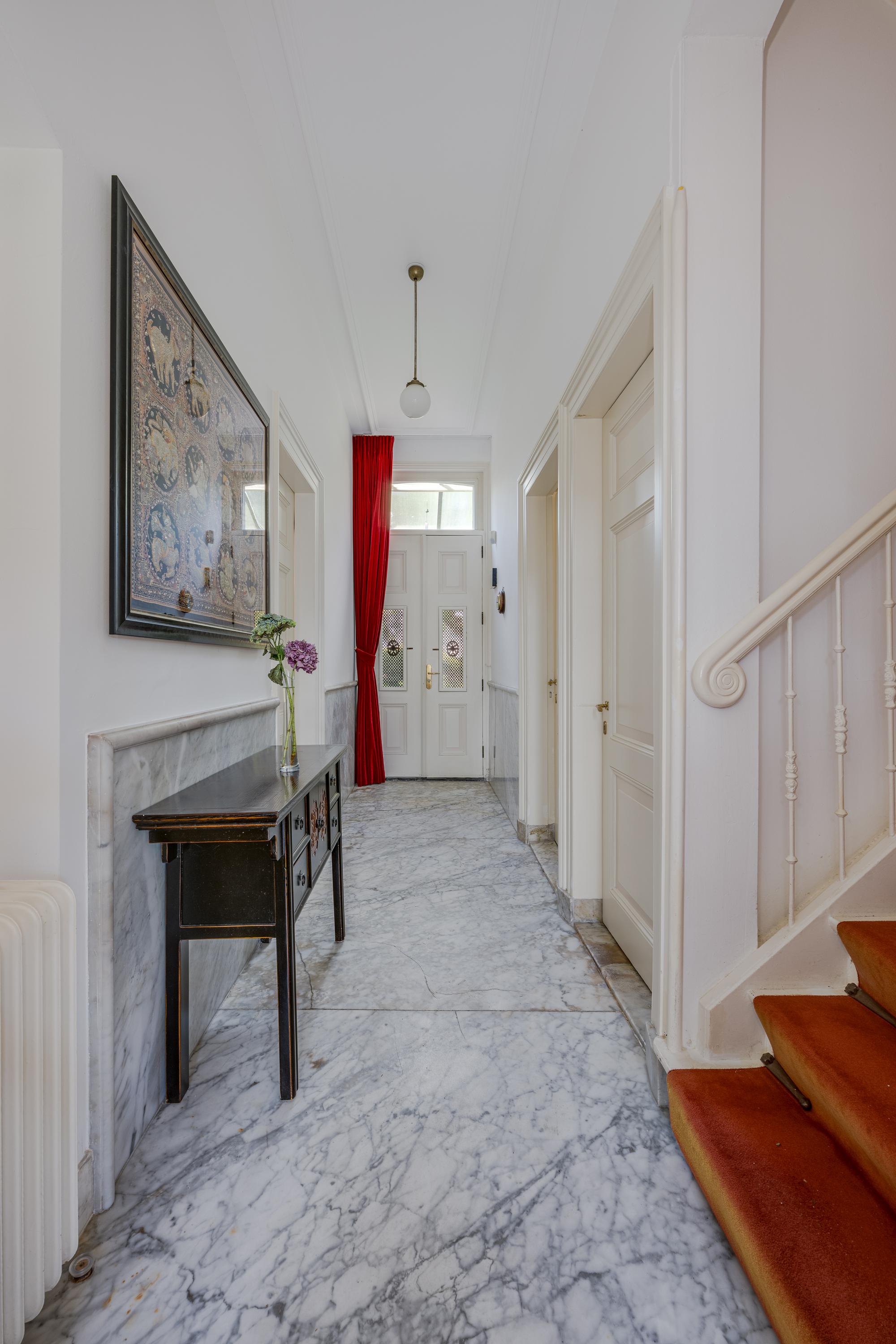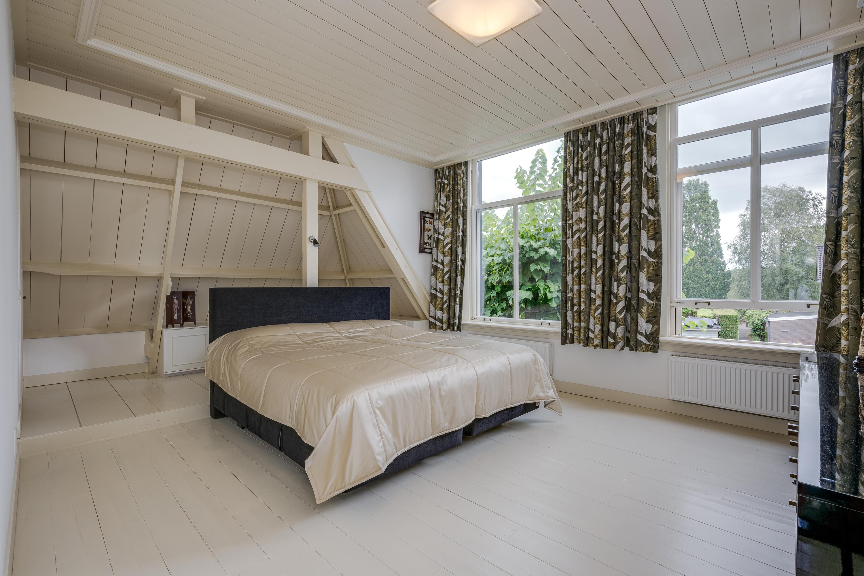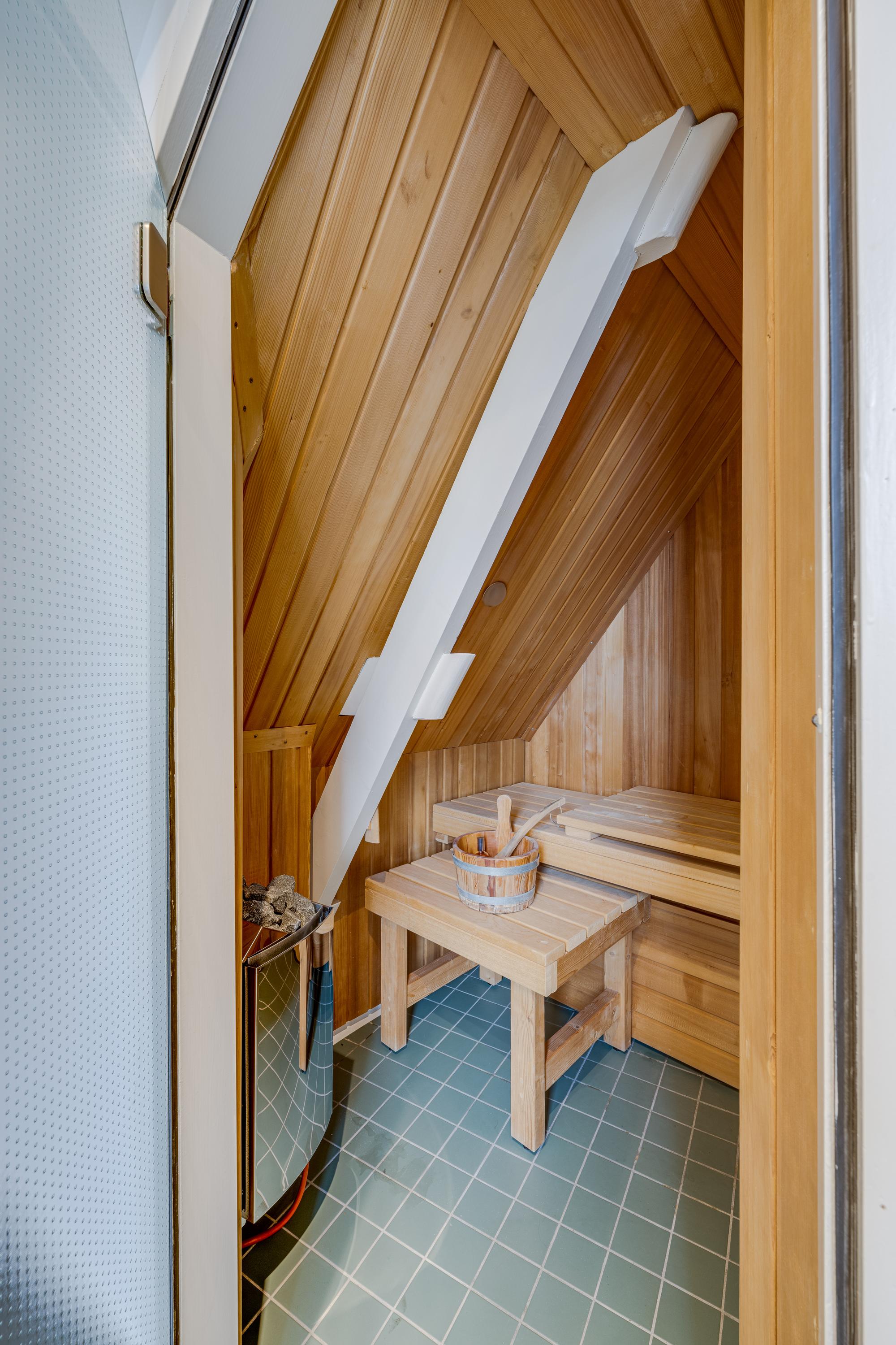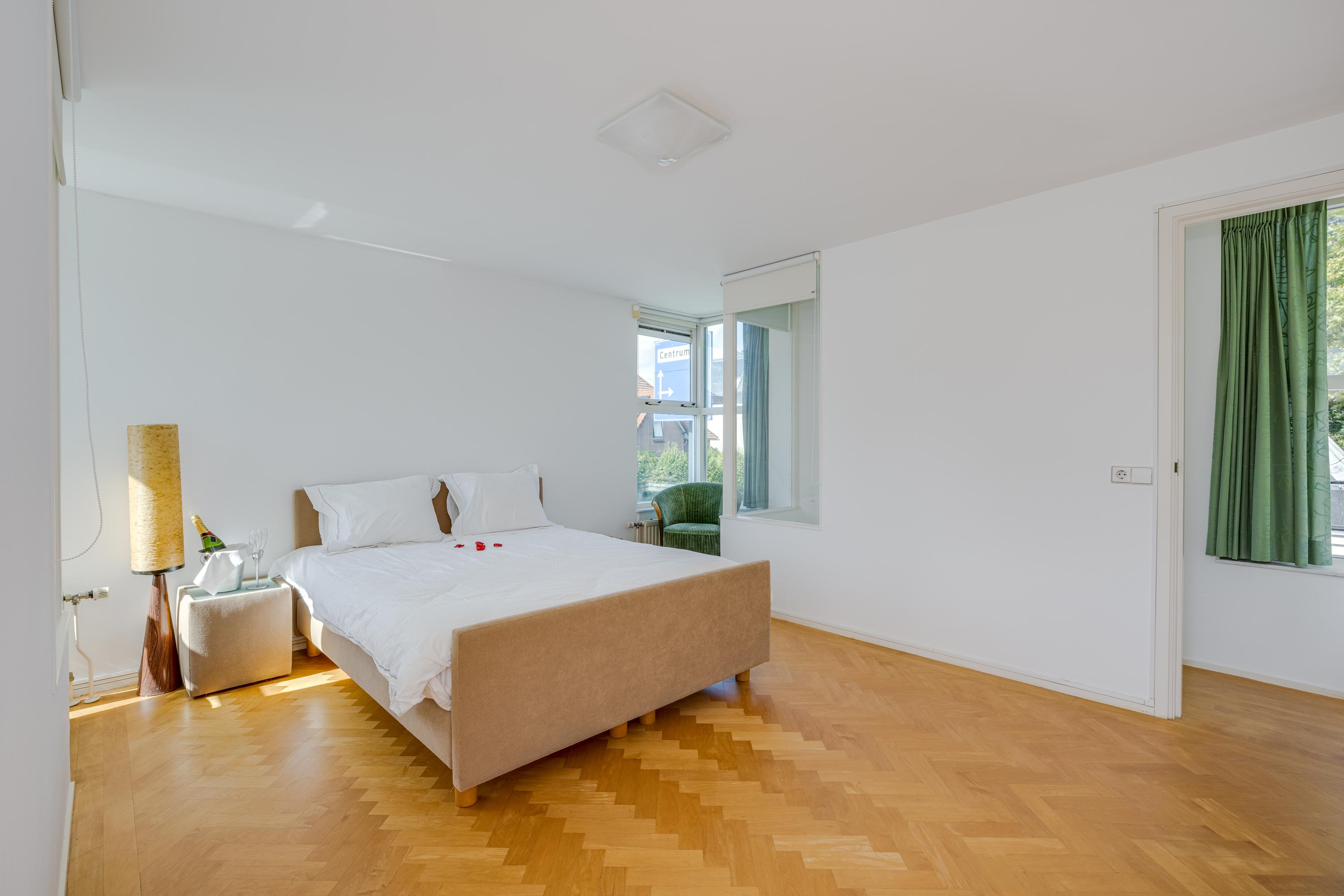 De bordestrap vormt het hart van het huis en de verbinding, met een toegang tot een ruime toiletruimte met wandcloset en fontein, naar de slaapverdieping. Hier zijn drie ruime slaapkamers met de master bedroom aan de waterzijde en inloopkast. De slaapkamers typeren zich door de hoge plafonds en het uitzicht op de tuin en het water, waarbij de master bedroom eruit springt door het formaat. De badkamer is voorzien van alle luxe met een granito-vloer, vloerverwarming en 2 in natuursteen ingebouwde wastafels. Niet alleen de hygiëne, maar ook ontspanning: naast een verzonken duo-bad, een doucheruimte met stortdouche en “Turks bad”, sauna, een wandbidet en een wandcloset.