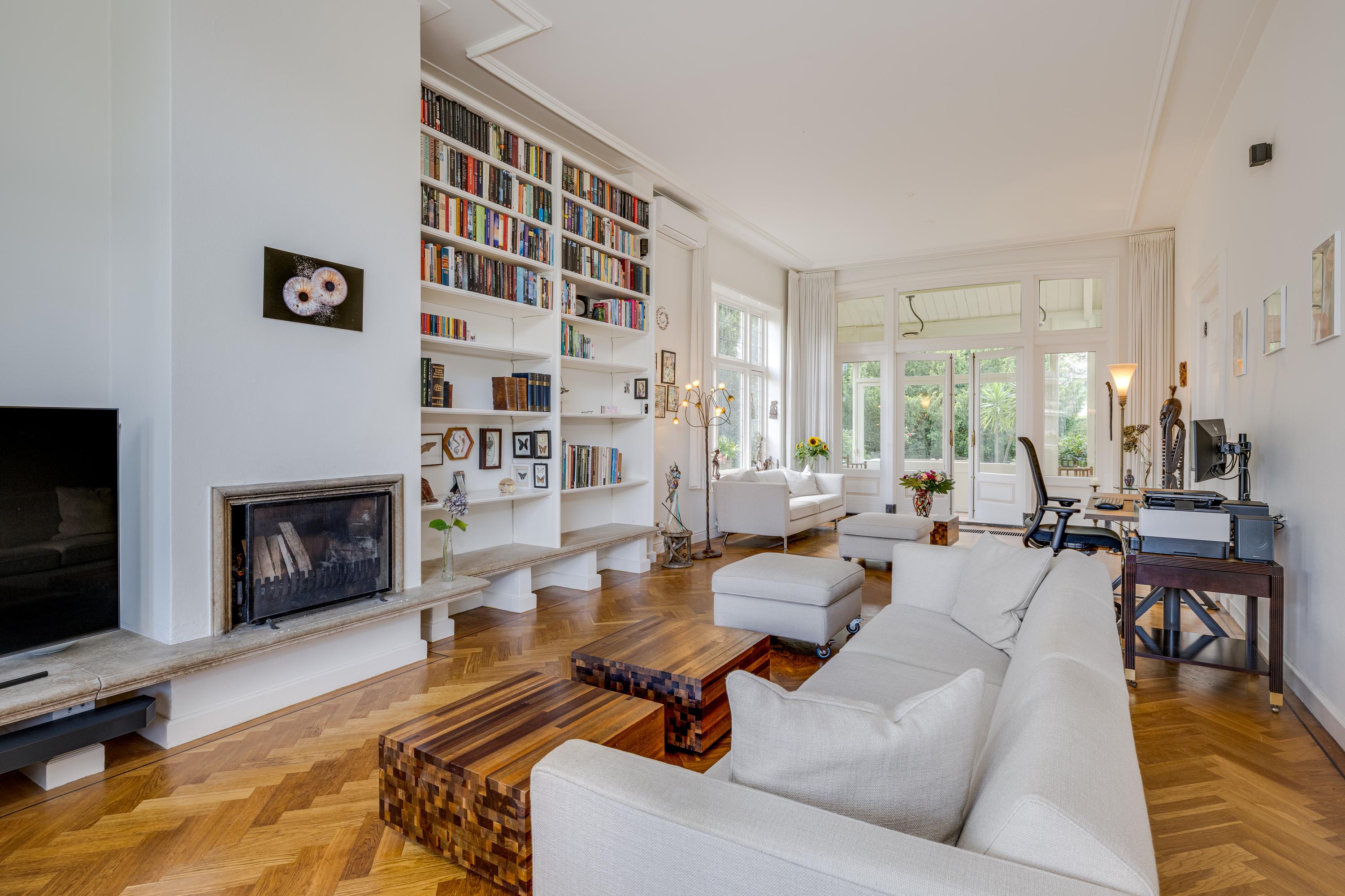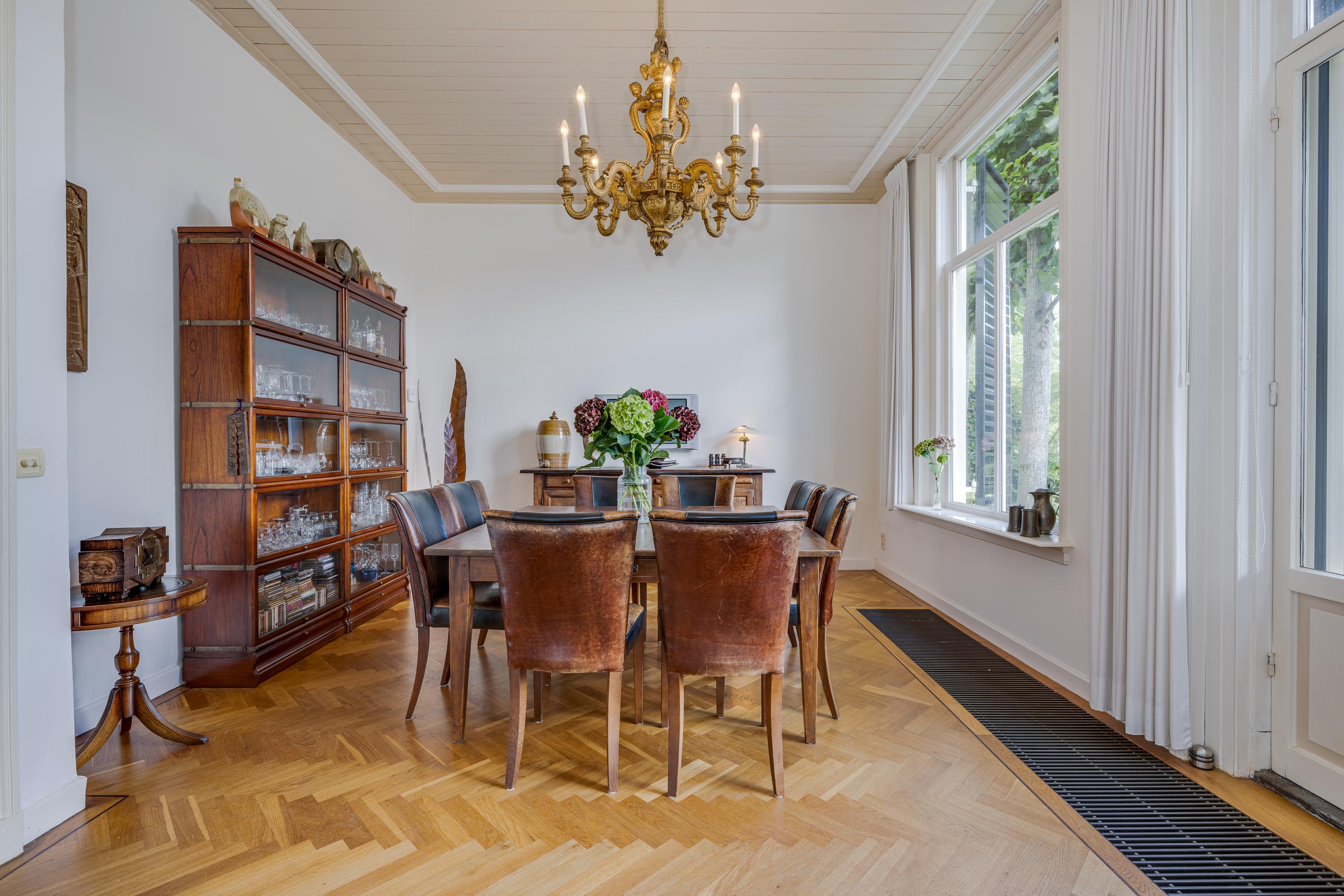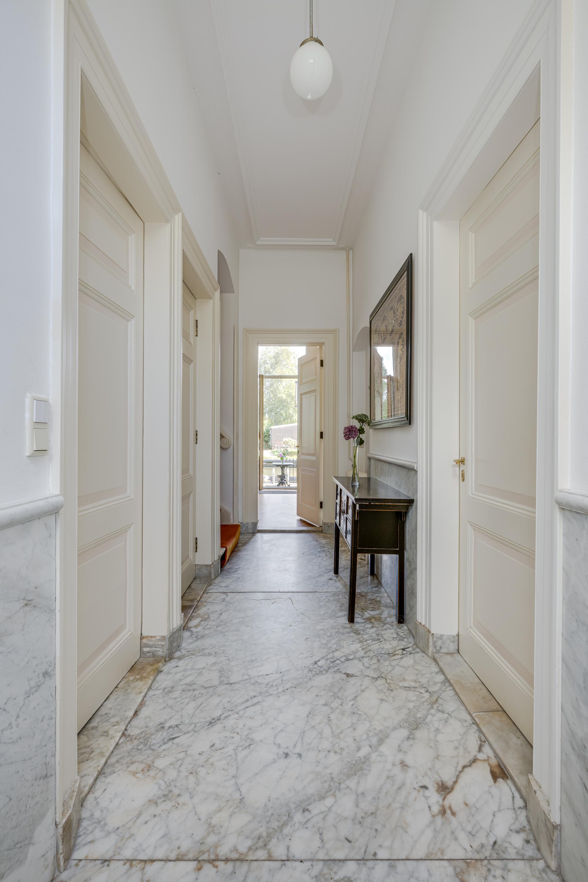 Het hoofdgebouw uit 1820 wordt getypeerd door de klassieke stijlelementen uit die periode: een centrale entree met aan weerszijden twee raampartijen met luiken en op de eerste etage de aanzet van de kap met centraal een gevel met drie raampartijen met luiken. Ook binnen zijn de voor deze bouwperiode kenmerkende eigenschappen aanwezig; hoge statige plafonds en raampartijen aan alle zijden zorgen voor een prachtige lichtinval op elk moment van de dag. Op de begane grond zijn een L-vormige woonkamer en suite, open haard met aan de tuinzijde een serre en aan de waterzijde zicht op de Rijn. De centrale hal loopt van voor- naar achterzijde en heeft openslaande deuren naar de tuin met terras aan de waterkant. Aan de linkerzijde van de hal liggen de keuken met bijkeuken met een doorloop naar de schuur, de ruime kelder en de formele eetkamer met ook weer een prachtig zicht op de Rijn en de voorbijvarende boten.