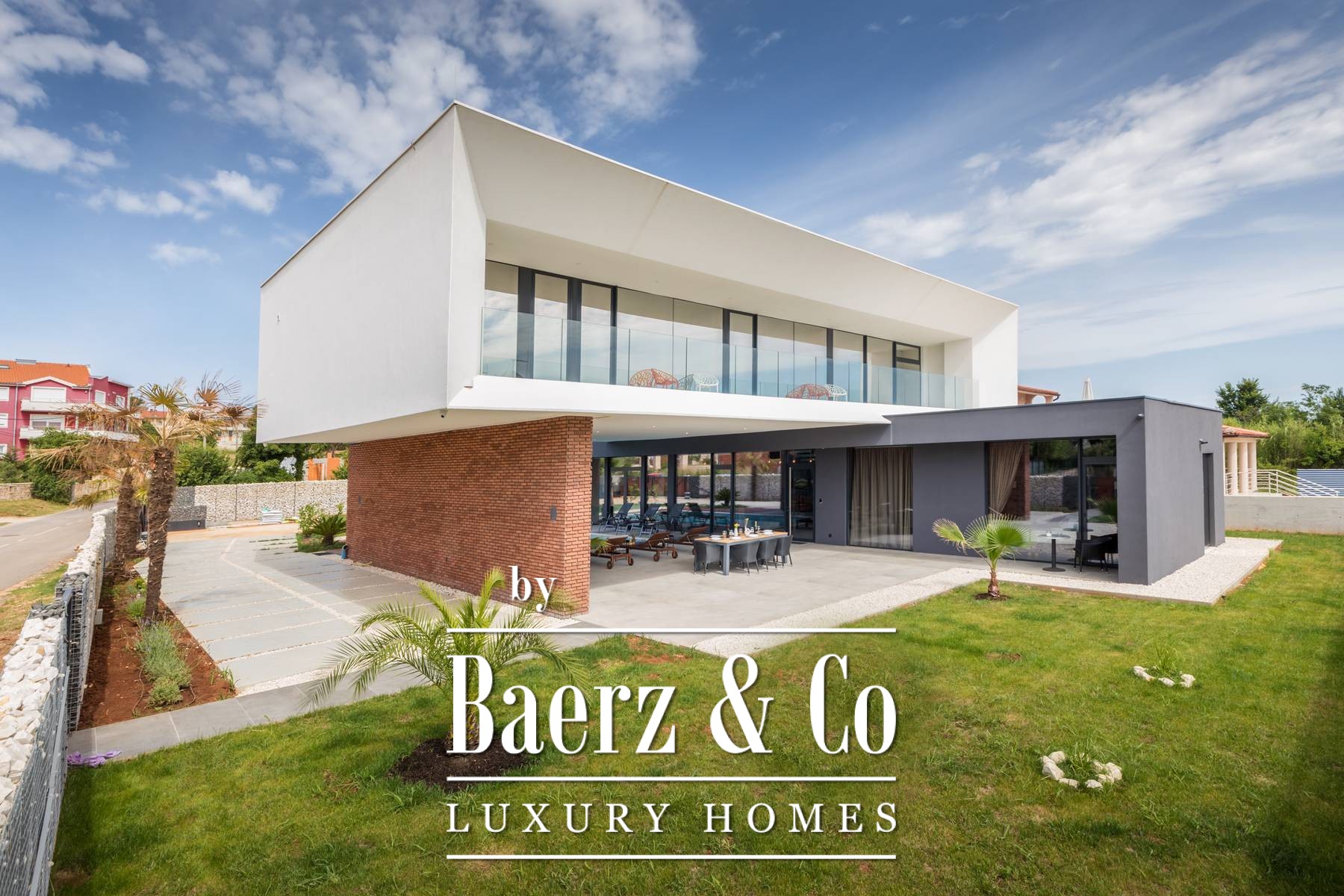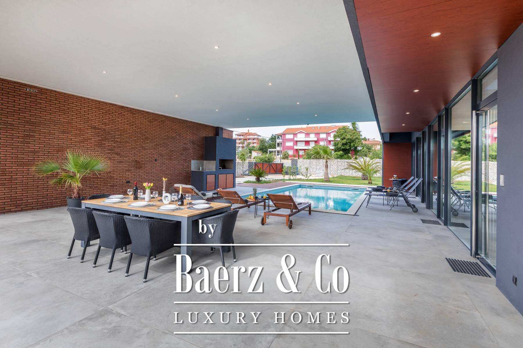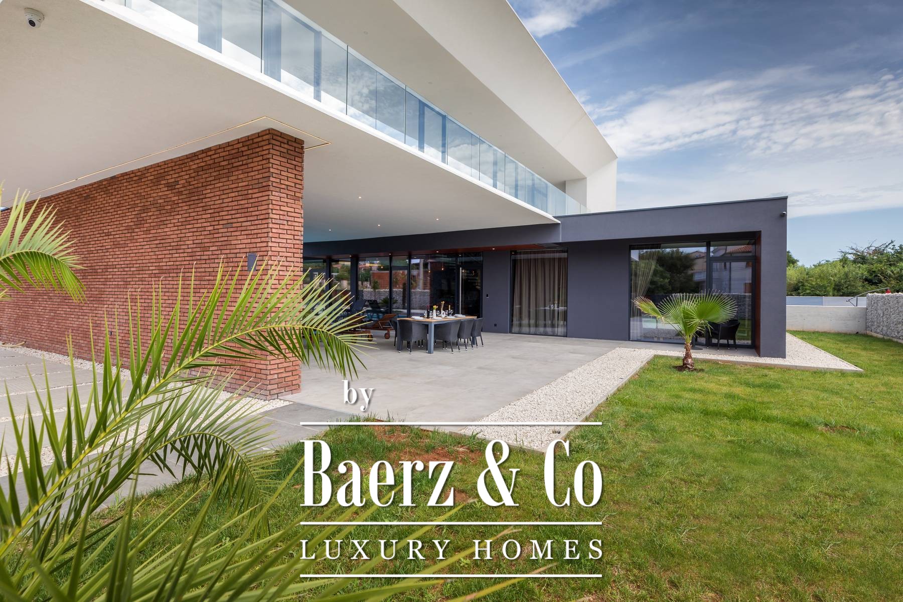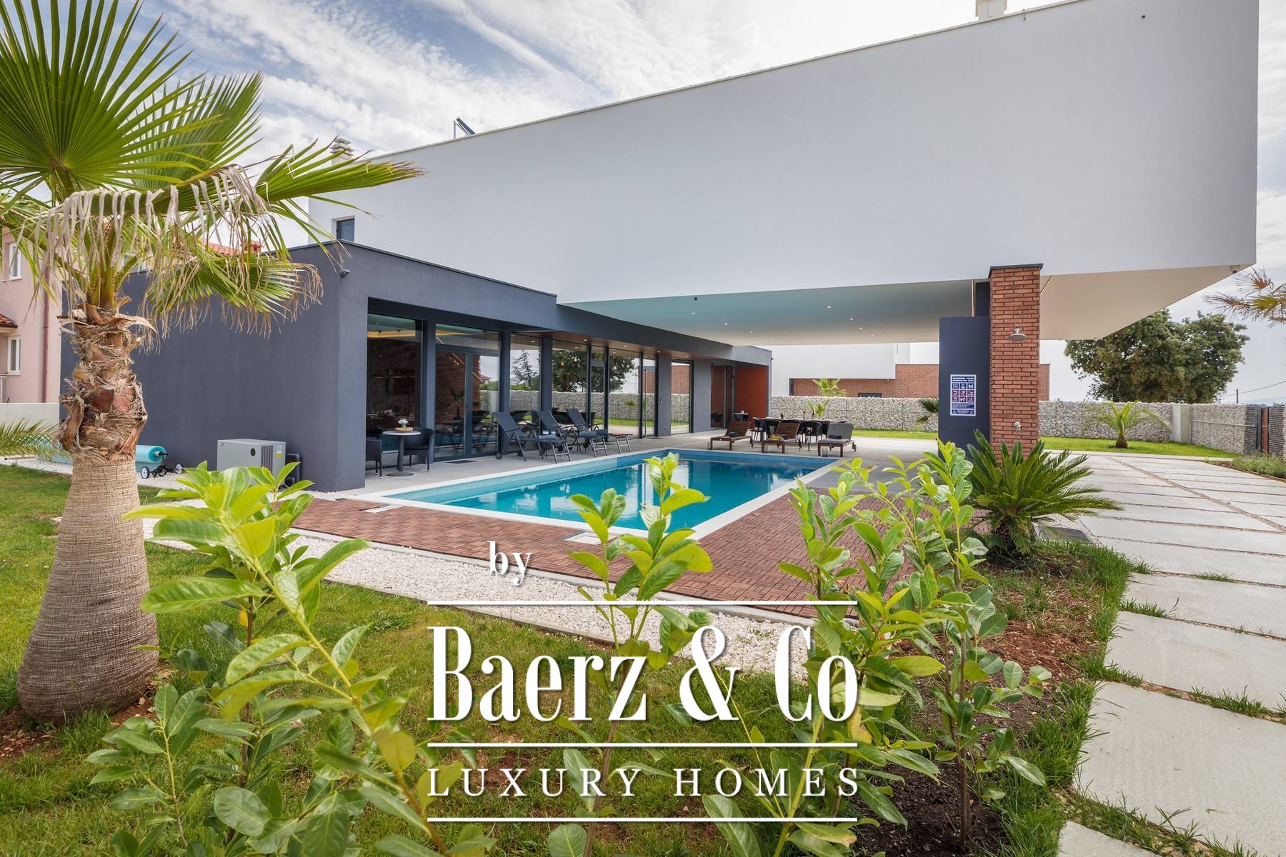 Villa Ližnjan met zeezicht is rustig gelegen in het zuidelijkste puntje van Istrië, slechts 460 meter van de Adriatische kust. De villa beslaat 297 m² verdeeld over twee verdiepingen, op een perceel van 1.113 m², en is gebouwd met een nauwgezette aandacht voor materiaalgebruik en bouwkundige precisie. Hoogwaardige constructie is overal zichtbaar, van de versterkte funderingsplaat van 55 cm tot de gevel met grafiet-styropor en een Rofix siliconen afwerking. Licht speelt een hoofdrol: 3,4 meter hoge glazen wanden in de leefruimte geven uitzicht op het zwembad, waardoor buiten en binnen naadloos in elkaar overlopen en het interieur ruimtelijk en licht aanvoelt.