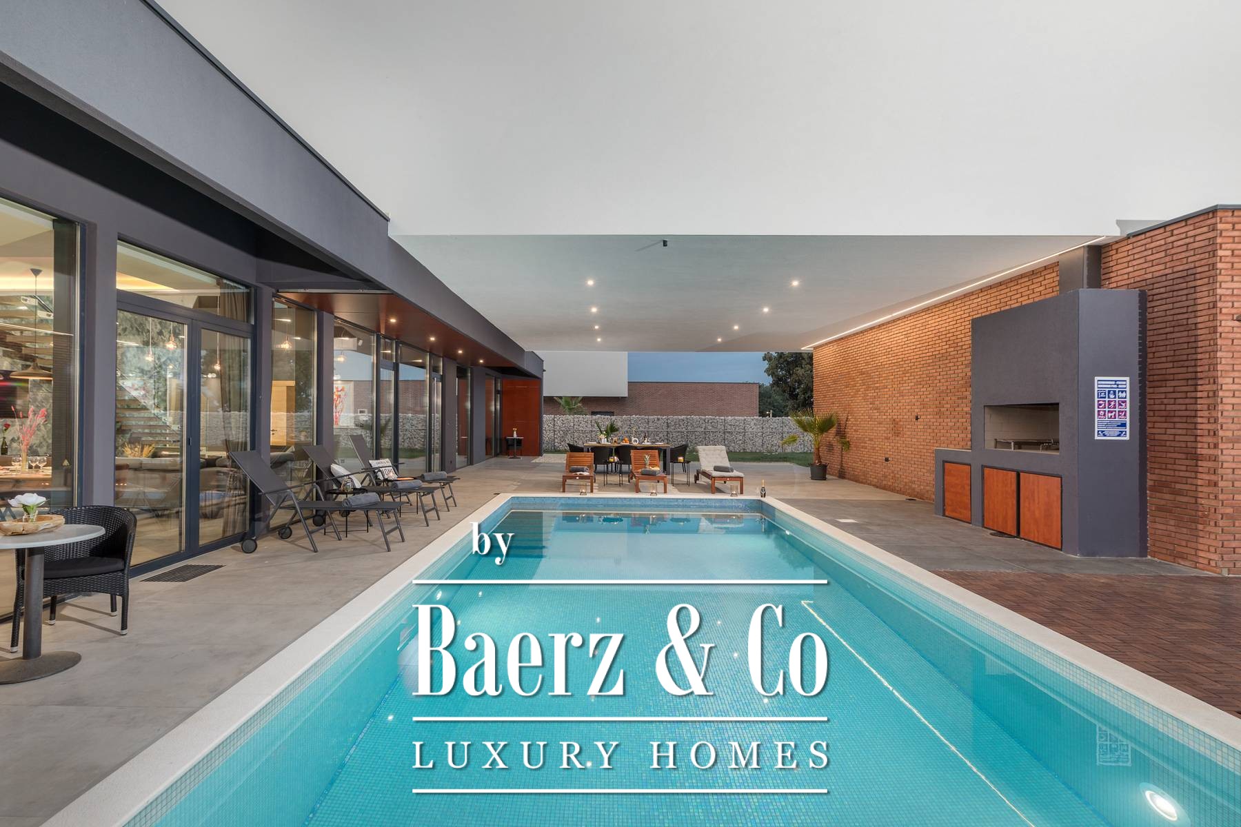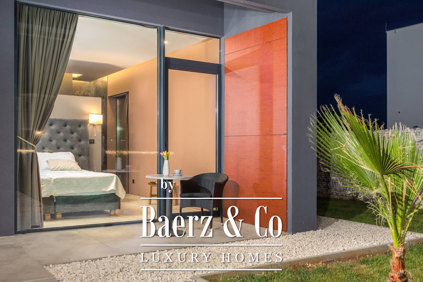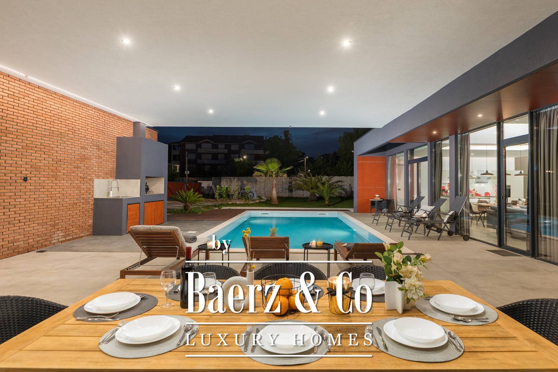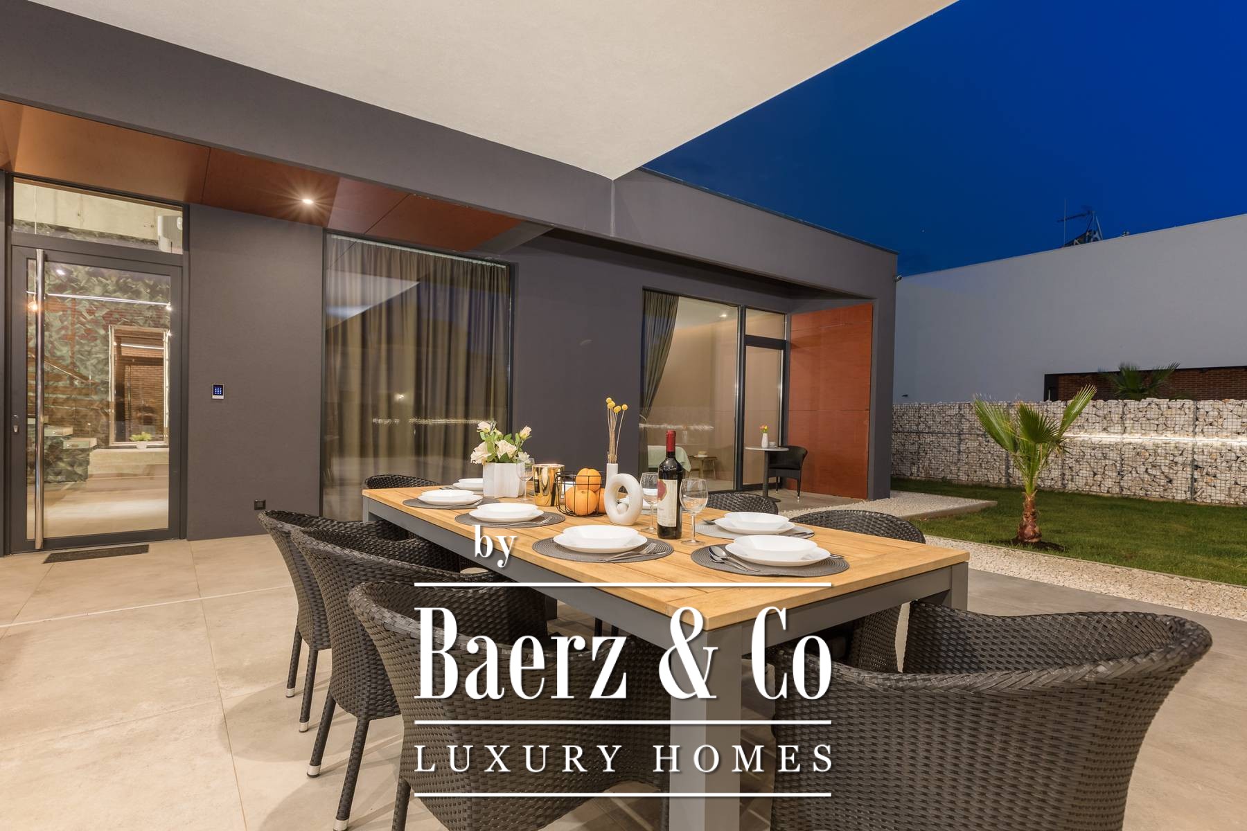 Villa Ližnjan met zeezicht is rustig gelegen in het zuidelijkste puntje van Istrië, slechts 460 meter van de Adriatische kust. De villa beslaat 297 m² verdeeld over twee verdiepingen, op een perceel van 1.113 m², en is gebouwd met een nauwgezette aandacht voor materiaalgebruik en bouwkundige precisie. Hoogwaardige constructie is overal zichtbaar, van de versterkte funderingsplaat van 55 cm tot de gevel met grafiet-styropor en een Rofix siliconen afwerking. Licht speelt een hoofdrol: 3,4 meter hoge glazen wanden in de leefruimte geven uitzicht op het zwembad, waardoor buiten en binnen naadloos in elkaar overlopen en het interieur ruimtelijk en licht aanvoelt.