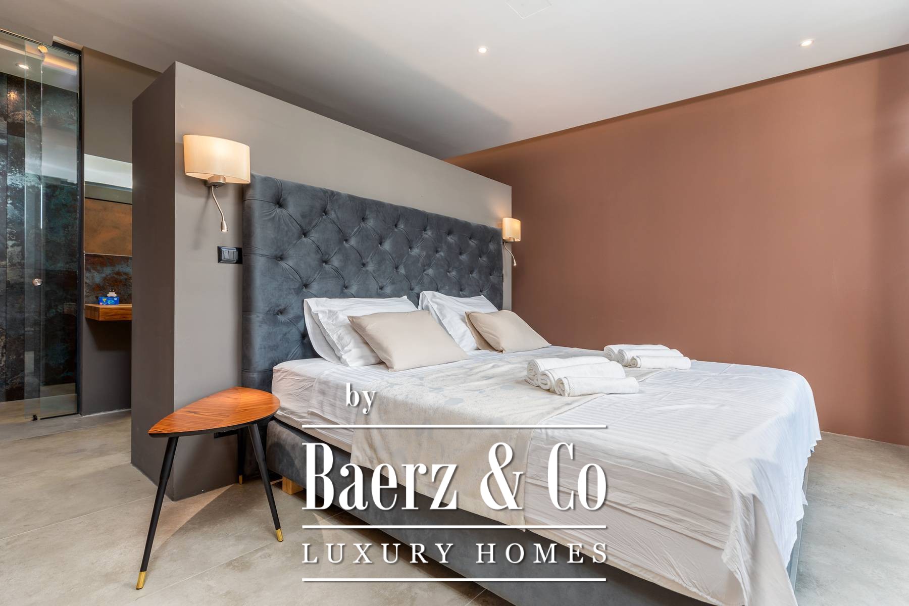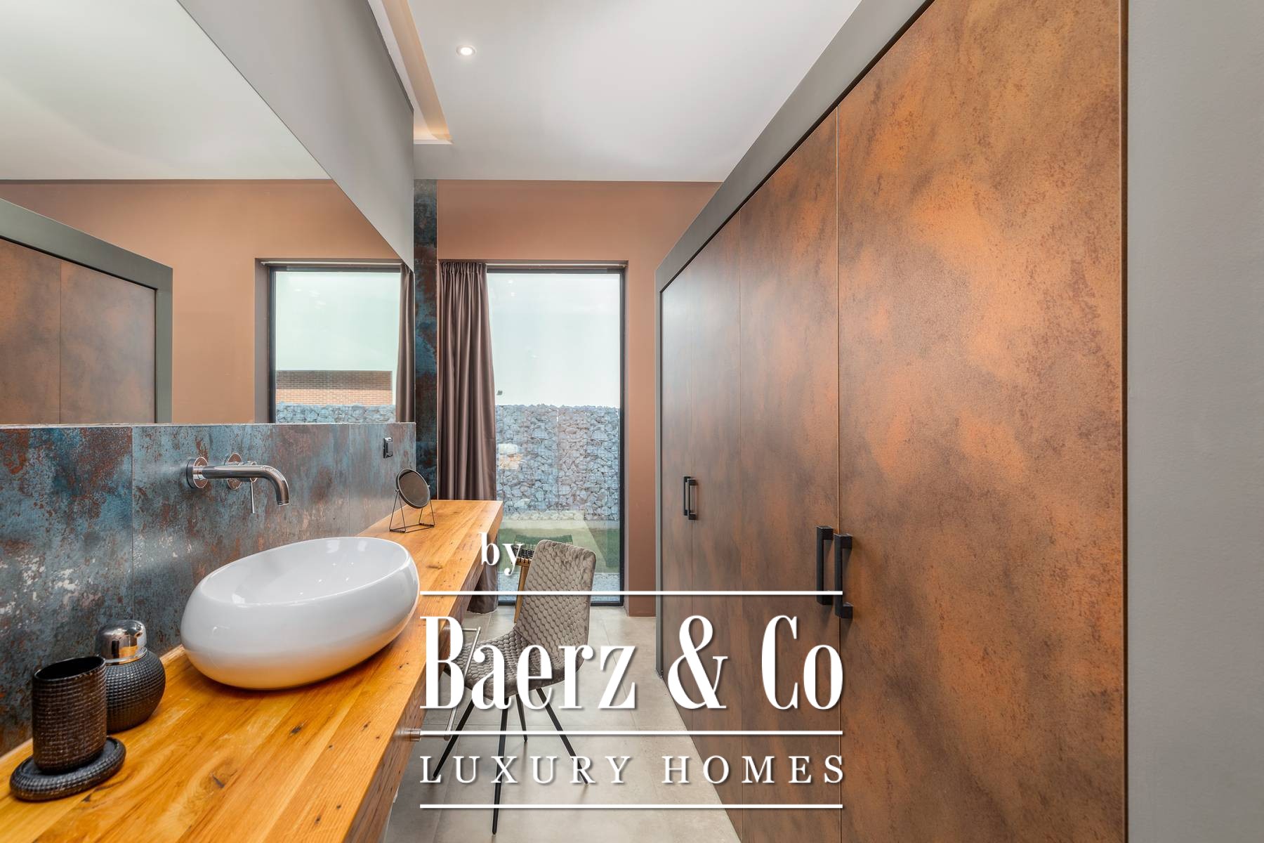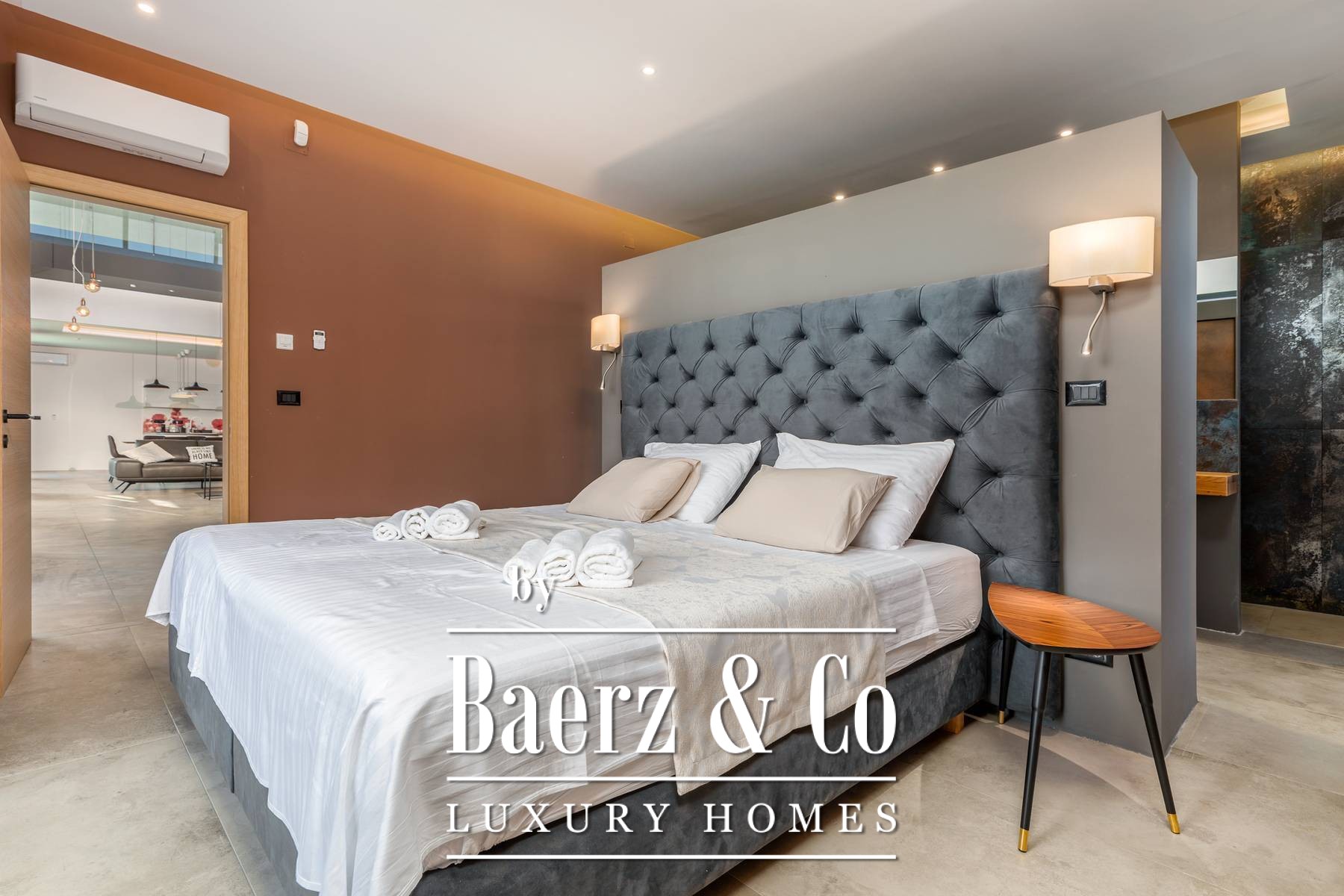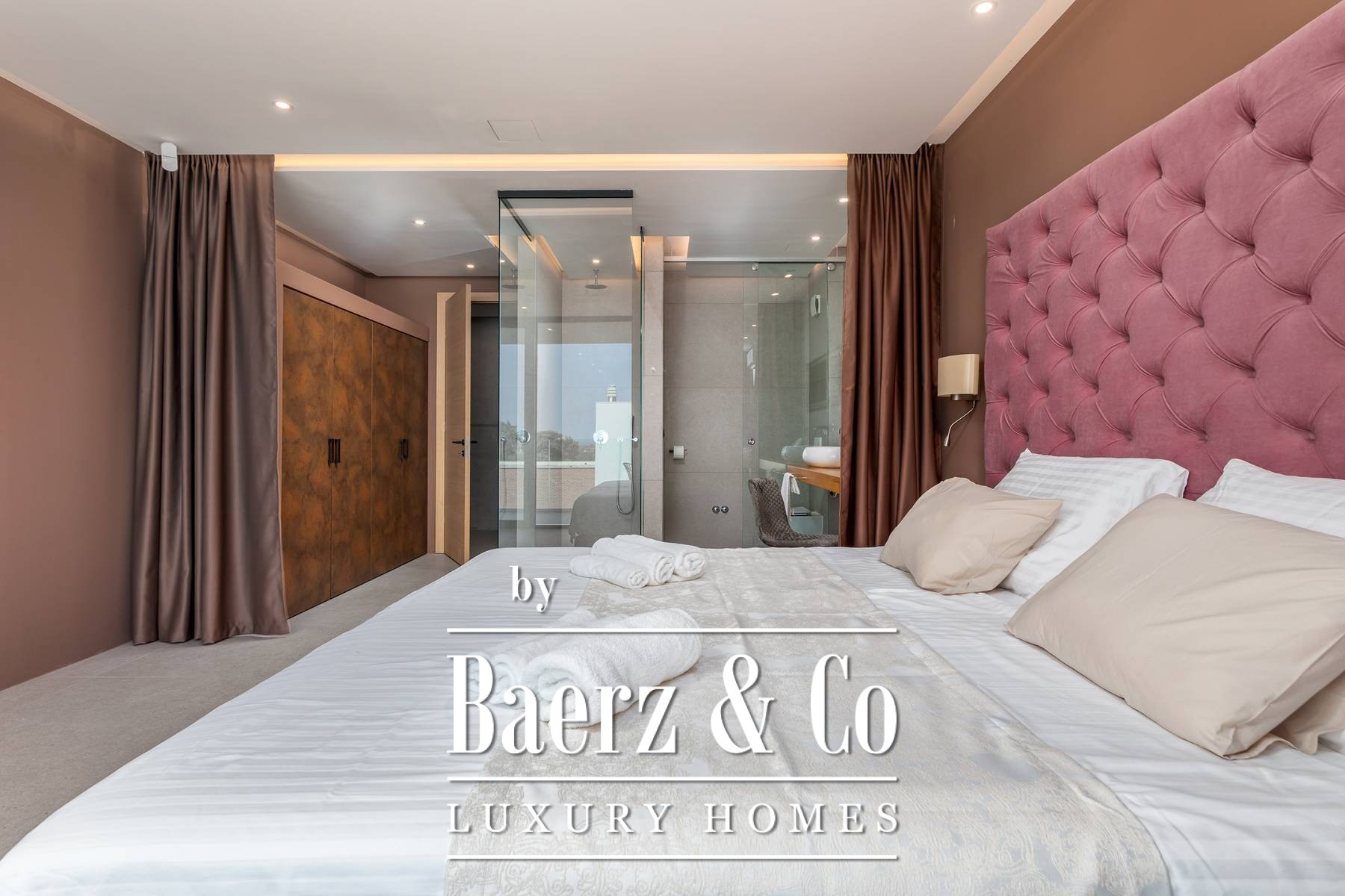 Op de begane grond vloeien de open woonkamer en keuken samen, zonder traditionele afscheidingen, terwijl één slaapkamer privacy biedt. Een sculpturale zwevende trap leidt naar drie slaapkamers op de bovenverdieping, elk met privébadkamer voorzien van moderne Optishower glazen wanden en panoramisch zeezicht door royale raampartijen. Door de hele villa zorgen vloerverwarming, airconditioning en een open haard voor comfort in elk seizoen. Alle systemen, van videobewaking tot alarm, zijn te bedienen met een mobiele app en bieden veiligheid en discretie.