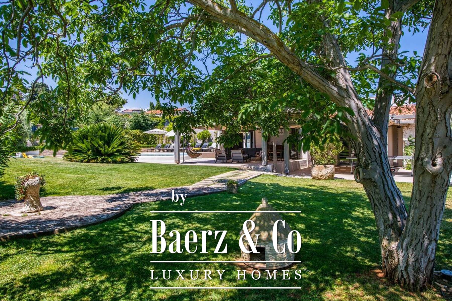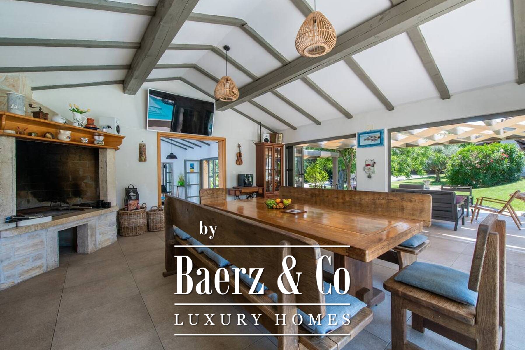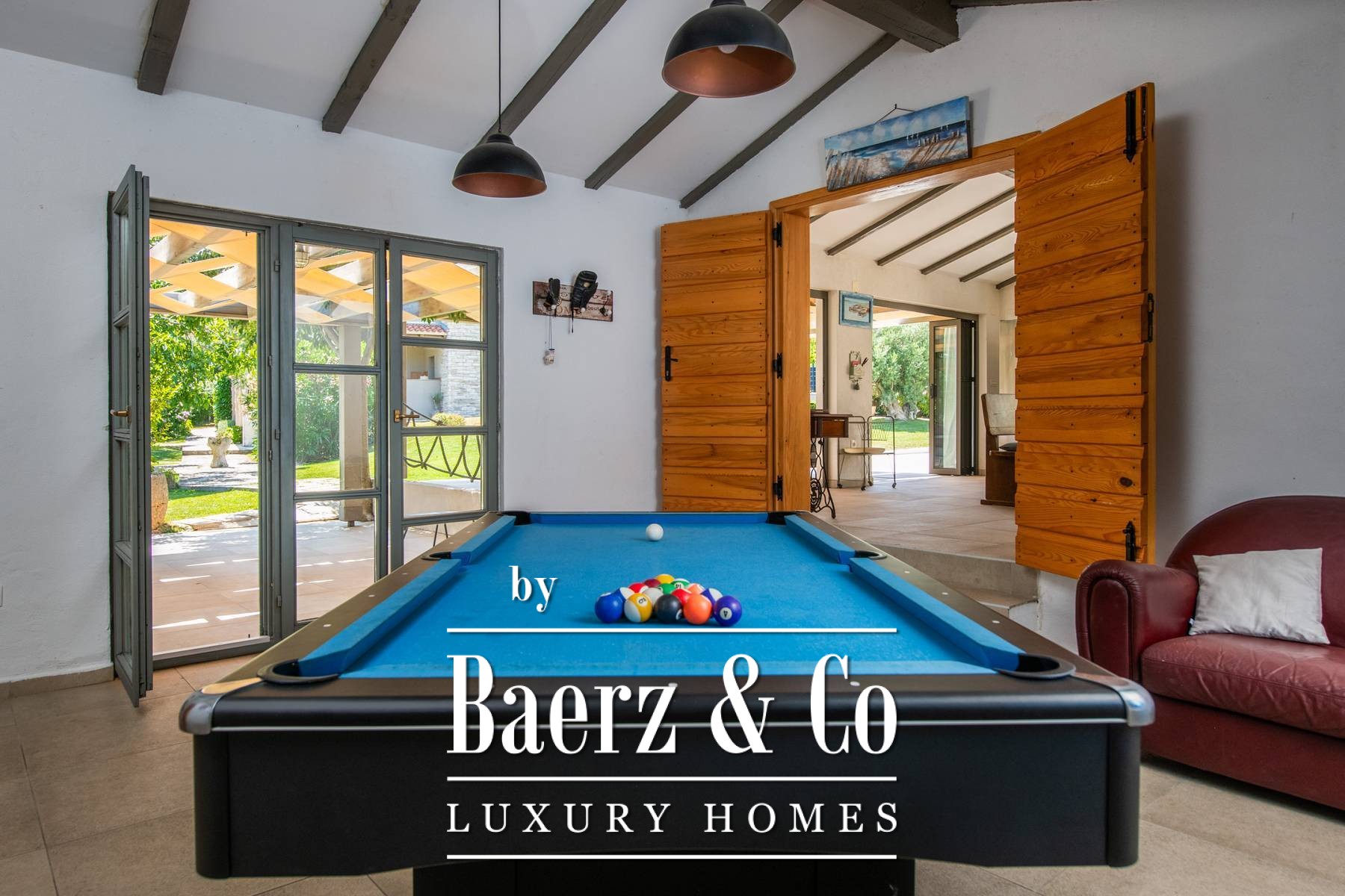 Zes slaapkamers en zes badkamers bevinden zich op de verdiepingen, ontworpen met aandacht voor licht en ventilatie. De villa combineert robuust traditioneel metselwerk — wat zorgt voor verkoeling in de zomer — met moderne, naadloze airconditioning. Op het terrein staat een zelfstandig gastenverblijf van 165 m² met een terras over twee niveaus, een buitenkeuken, open haard en een ontspanningsruimte met biljart, dartbord en tafelvoetbal, ideaal voor zowel rust als levendige bijeenkomsten. Een ommuurde, overdekte parkeerplaats biedt discreet ruimte aan vijf auto's.