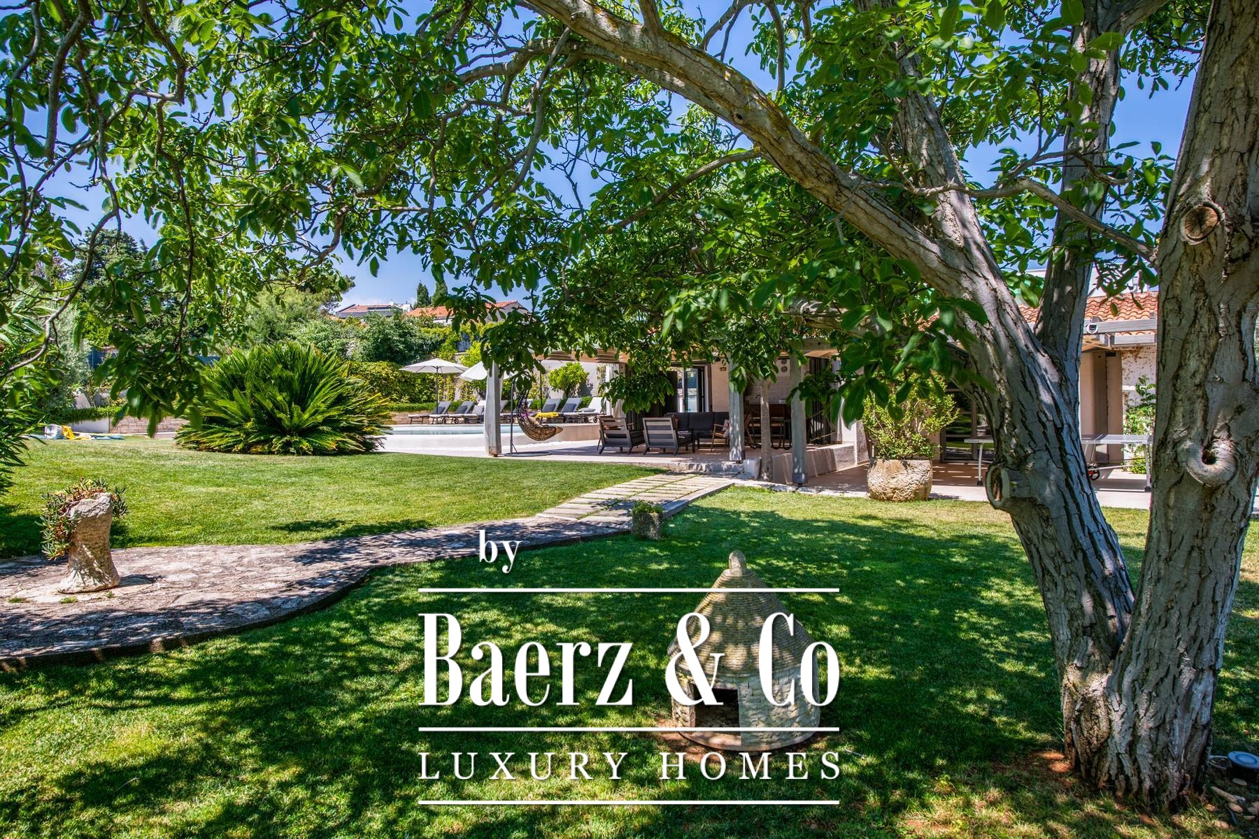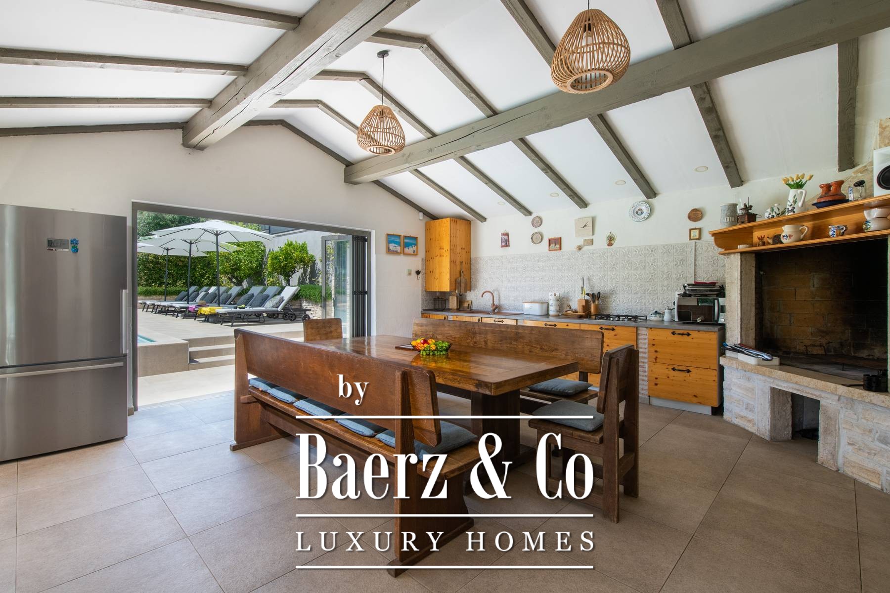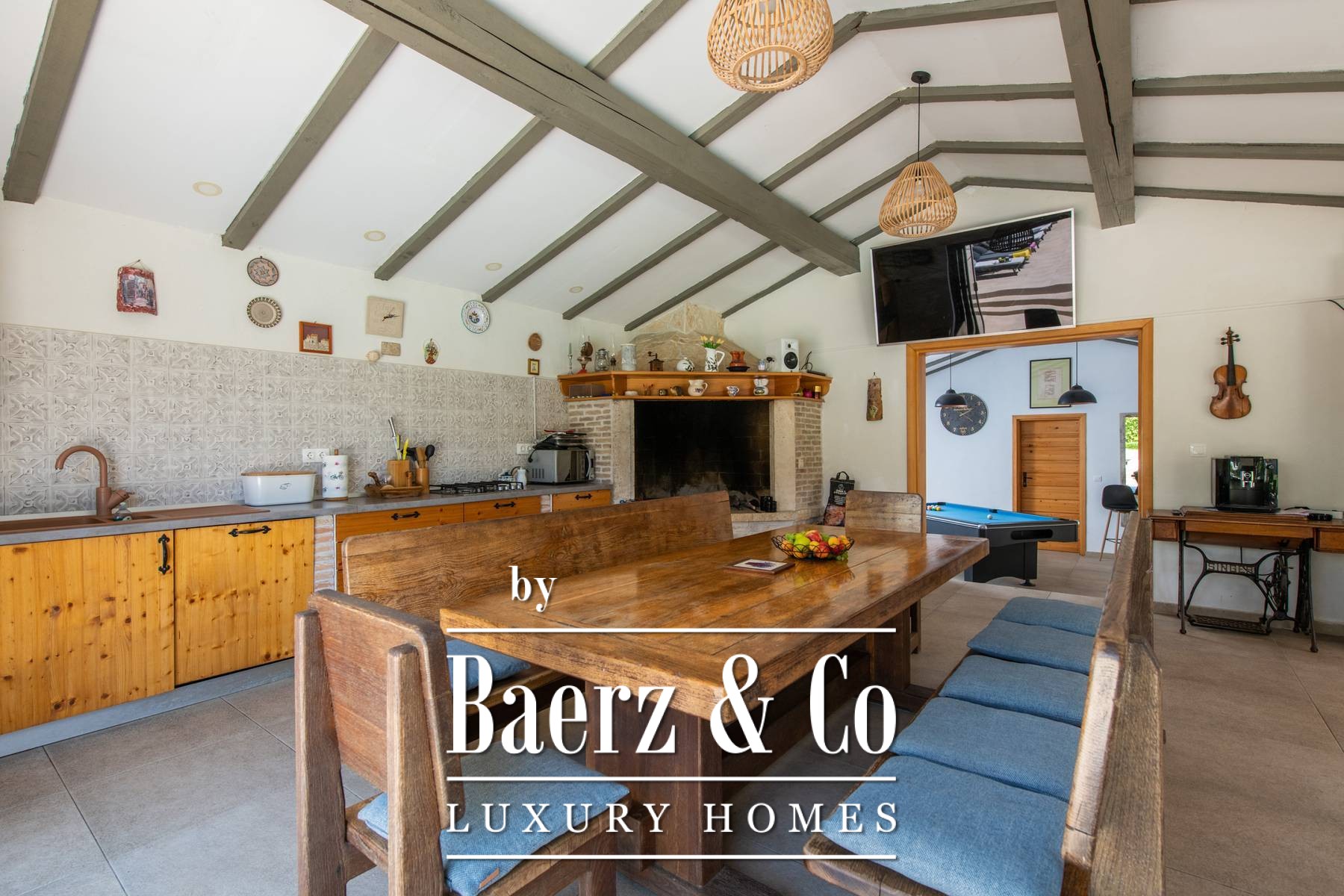 Zes slaapkamers en zes badkamers bevinden zich op de verdiepingen, ontworpen met aandacht voor licht en ventilatie. De villa combineert robuust traditioneel metselwerk — wat zorgt voor verkoeling in de zomer — met moderne, naadloze airconditioning. Op het terrein staat een zelfstandig gastenverblijf van 165 m² met een terras over twee niveaus, een buitenkeuken, open haard en een ontspanningsruimte met biljart, dartbord en tafelvoetbal, ideaal voor zowel rust als levendige bijeenkomsten. Een ommuurde, overdekte parkeerplaats biedt discreet ruimte aan vijf auto's.