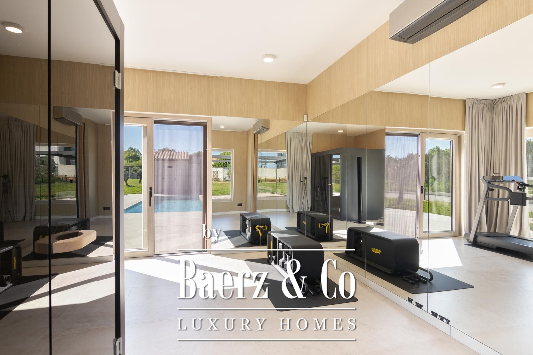 Bij binnenkomst treft u een lichte, open leefruimte waar keuken en eetkamer naadloos in elkaar overlopen, omlijst door royale glazen wanden en zes meter brede schuifdeuren die een onbelemmerd zicht op het verwarmde zwembad en het terras bieden. De master suite beschikt over een eigen badkamer met inloopdouche en ligbad, een fitnessruimte en een sauna. Drie extra slaapkamers zijn elk voorzien van en suite badkamers met glazen wanden die uitkijken op de rustige tuin.