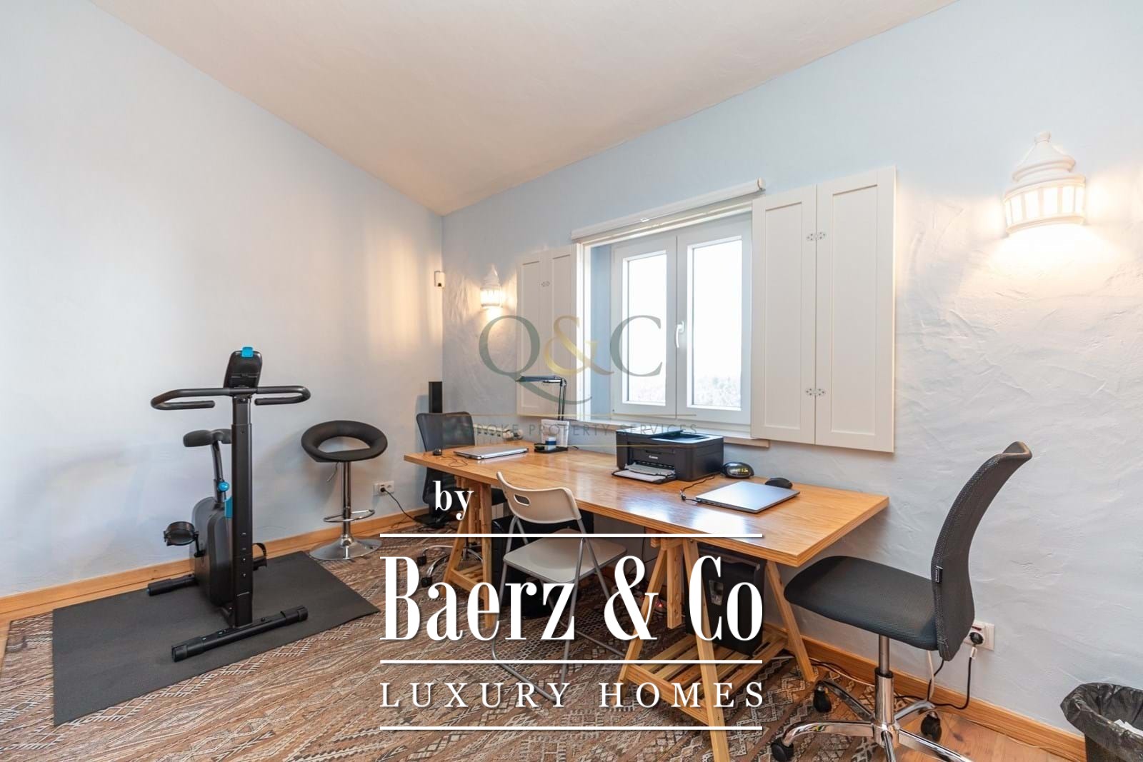 De gelijkvloerse villa beschikt over 232 m² woonoppervlakte en onderscheidt zich door Santa Catarina tegelvloeren, hoge plafonds en een sfeervolle open haard als centraal element. De ruime woonkamer loopt elegant over in de eetkamer. Een aparte gang met zuidgerichte ramen verbindt de centrale hal met de volledig uitgeruste keuken, wasruimte en royale voorraadkast, en biedt directe toegang aan de noordzijde van de tuin. Vier slaapkamers liggen aan het woonvertrek: de mastersuite en een vierde kamer (nu ingericht als kantoor) openen beide naar de tuin, terwijl de andere twee slaapkamers beschikken over ingebouwde kasten en een eigen badkamer of gastenbadkamer.