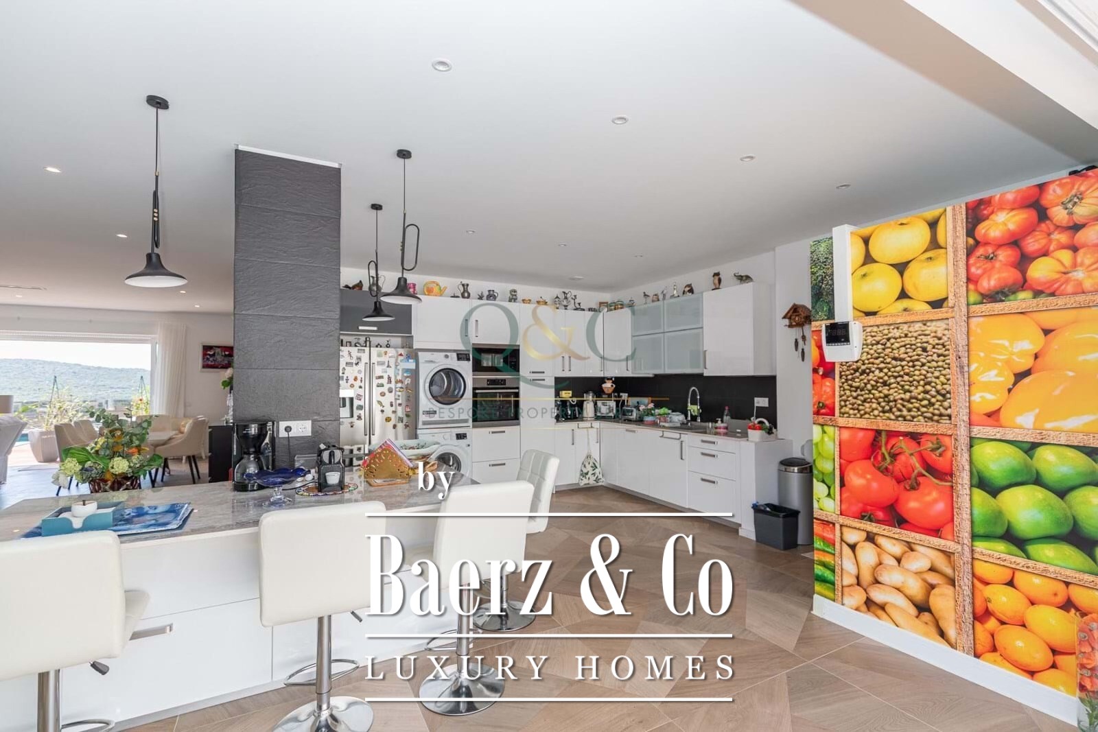 Binnen is de lichte woonkamer voorzien van brede, schuivende deuren die volledig geopend kunnen worden, waardoor de hoofdlounge aansluit op het terras met zwembad. Een houtkachel zorgt voor behaaglijke warmte tijdens koelere avonden. De open keuken is ingericht rondom een centraal eiland, voorzien van een geïntegreerde afzuigkap, en biedt toegang tot een tweede terras en directe doorgang naar de garage. De ruimtes zijn subtiel ingedeeld met twee slaapkamers ensuite, beide voorzien van inbouwkasten, en een veelzijdige derde kamer die nu dienstdoet als kantoor of extra slaapkamer. Een aparte kleedkamer biedt mogelijkheden voor een privéwerkplek.