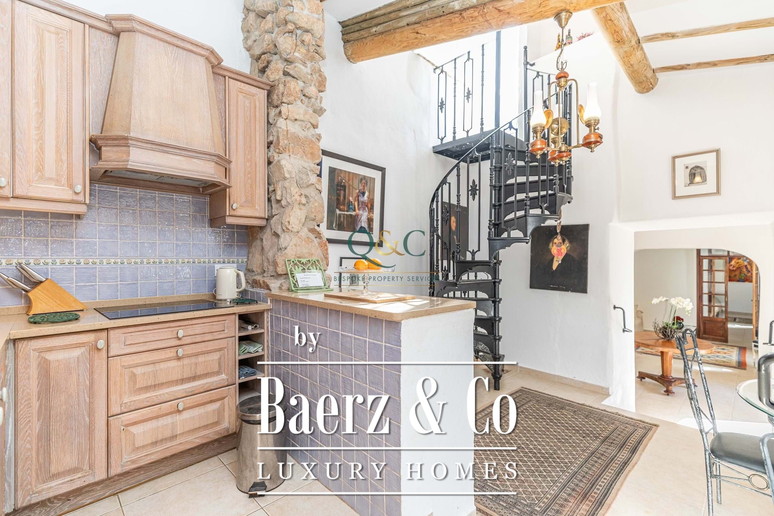Een smeedijzeren wenteltrap leidt naar het dakterras, waar panoramisch uitzicht op bergen en omringend landschap een serene sfeer creëert. Buitenruimtes nodigen uit tot slow living met een zwembad, douche, BBQ, eet- en zithoeken, alles omgeven door volgroeide tuinen en de beslotenheid van oude bomen. Privéparkeergelegenheid is aanwezig bij de entree en praktische voorzieningen zoals een voorraadkamer, geboorde waterput, septic tank en waterreservoir vergroten de zekerheid en zelfstandigheid.