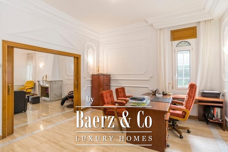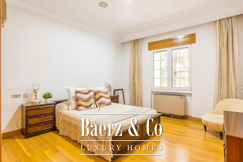 Deze uitzonderlijke vrijstaande villa ligt in El Plantío, een van de meest prestigieuze woonwijken aan de westkant van Madrid, op slechts 13 km van het stadscentrum met uitstekende verbindingen. De woning staat op een royaal privéperceel van 3.105 m² en biedt circa 952 m² bebouwde oppervlakte verdeeld over meerdere niveaus. Het ontwerp combineert klassieke elegantie met hoogwaardige afwerkingen zoals wit Macael-marmer en massief hout. De villa beschikt over zes ruime slaapkamers en acht badkamers, evenals zorgvuldig ingedeelde woonruimtes, waaronder een indrukwekkende hoofdwoonkamer met open haard, een bibliotheek, wijnkelder, privéfitnessruimte en een master suite met inloopkast en jacuzzi. Buiten vindt u prachtig aangelegde tuinen met volwassen bomen, een groot zwembad, een overdekt terras met barbecue en houtoven, en professionele tennis- en frontonbanen. Daarnaast beschikt de woning over een zelfstandig gastenappartement, ruime garagefaciliteiten en geavanceerde beveiligings- en klimaatsystemen, waardoor dit object ideaal is als luxe gezinswoning of hoogwaardige investering in een elitewijk van Madrid.