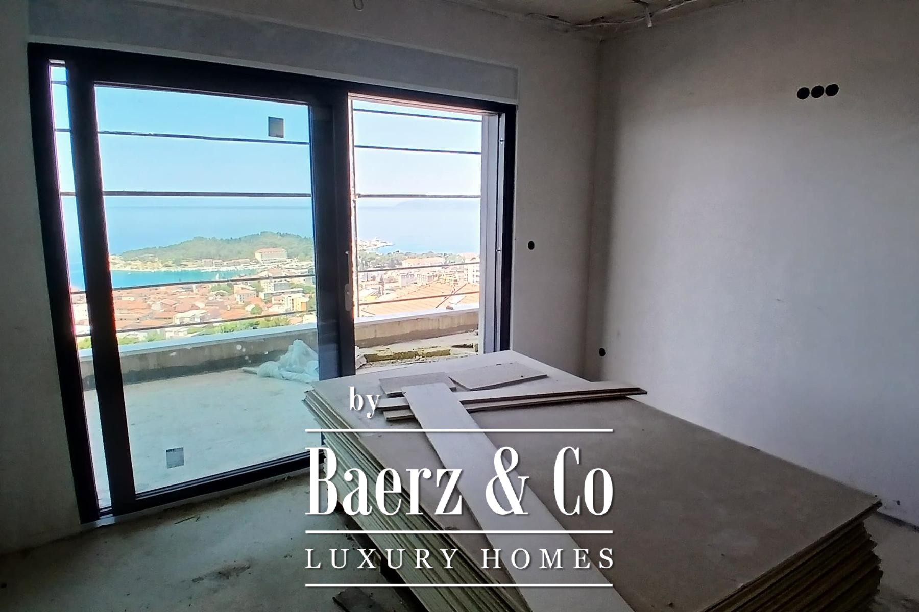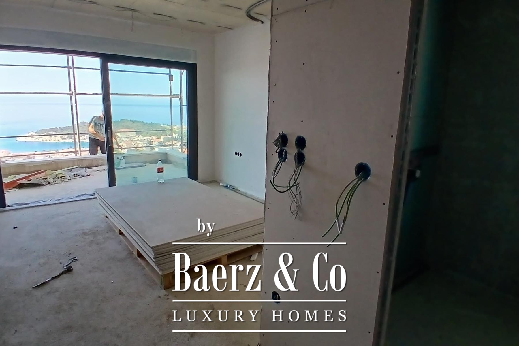 Appartement Makarska biedt 173 m² zorgvuldig samengestelde leefruimte over de volledige tweede verdieping van een moderne residentie in aanbouw. Deze driekamerappartement met drie badkamers ademt rust en privacy, versterkt door het onbelemmerde uitzicht over de Adriatische Zee. De living loopt over in een zuidelijk gelegen terras van 39,3 m² en een noordelijke patio met een privézwembad van 15,4 m², waardoor het licht overvloedig binnenvalt en het mediterrane panorama perfect wordt omlijst.