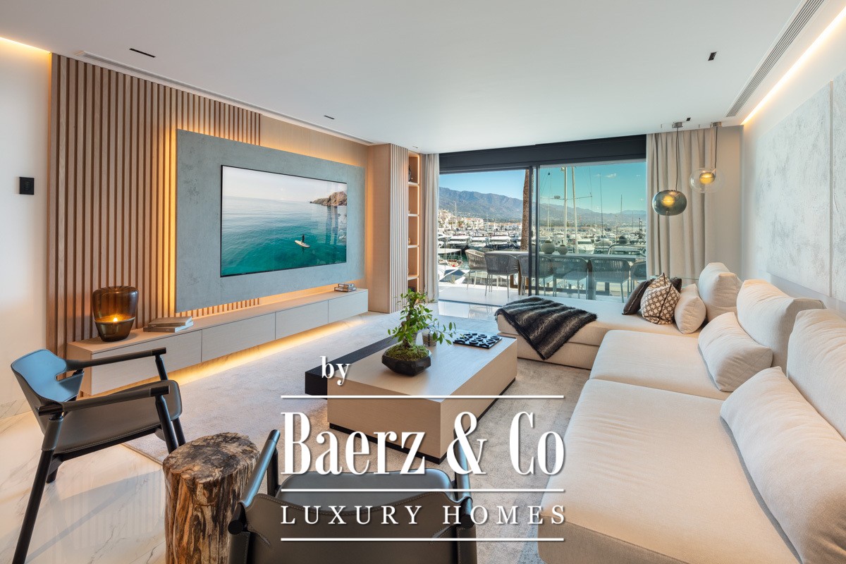 De open leefruimte heeft stijlvolle amandelhouten wandafwerking en verfijnde LED-verlichting en sluit naadloos aan op een privéterras met een unieke frontliniepositie aan de haven. De keuken is uitgevoerd met hoogwaardige Gaggenau-apparatuur en straalt precisie en moderniteit uit. Elk van de drie slaapkamers beschikt over een en-suite badkamer, zodat privacy en comfort gewaarborgd blijven. Klimaatbeheersing, doordachte afwerking en een compleet afwerkingsniveau maken een moeiteloze overgang mogelijk tussen privé-ontspanning en het bruisende Puerto Banús.