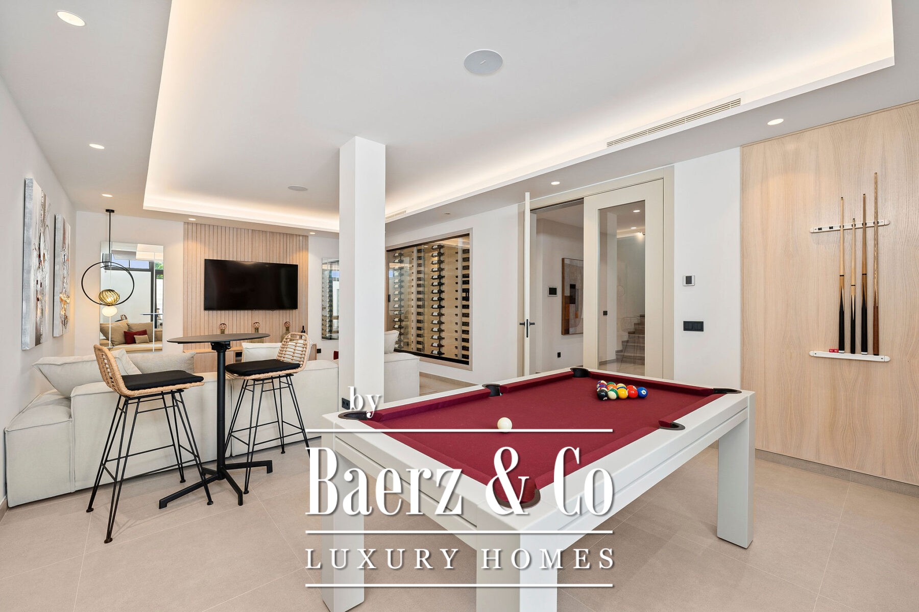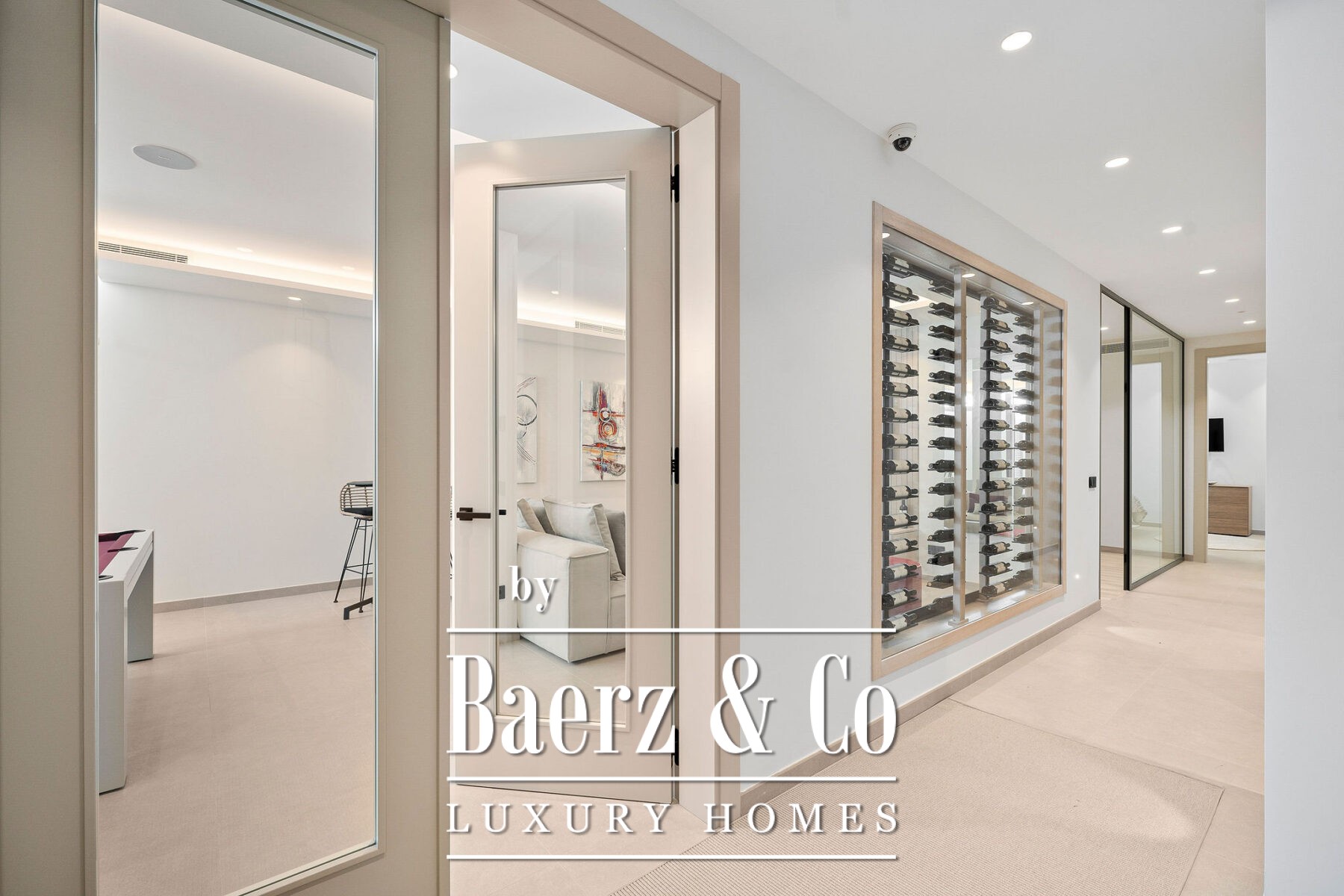 Elke ruimte is ontworpen voor comfort en flexibiliteit. De begane grond verwelkomt gasten met royale woon- en eetgedeelten, terwijl de bovenverdieping rustgevende ochtenden belooft vanaf twee privéterrassen grenzend aan de mastersuite. In het souterrain bevinden zich een privébioscoop, speelkamer, fitnessruimte en wijnbodega die ontspanning tot een dagelijkse belevenis maken. Elektrische vloerverwarming in de badkamers van het souterrain en de garage bieden functionele luxe.