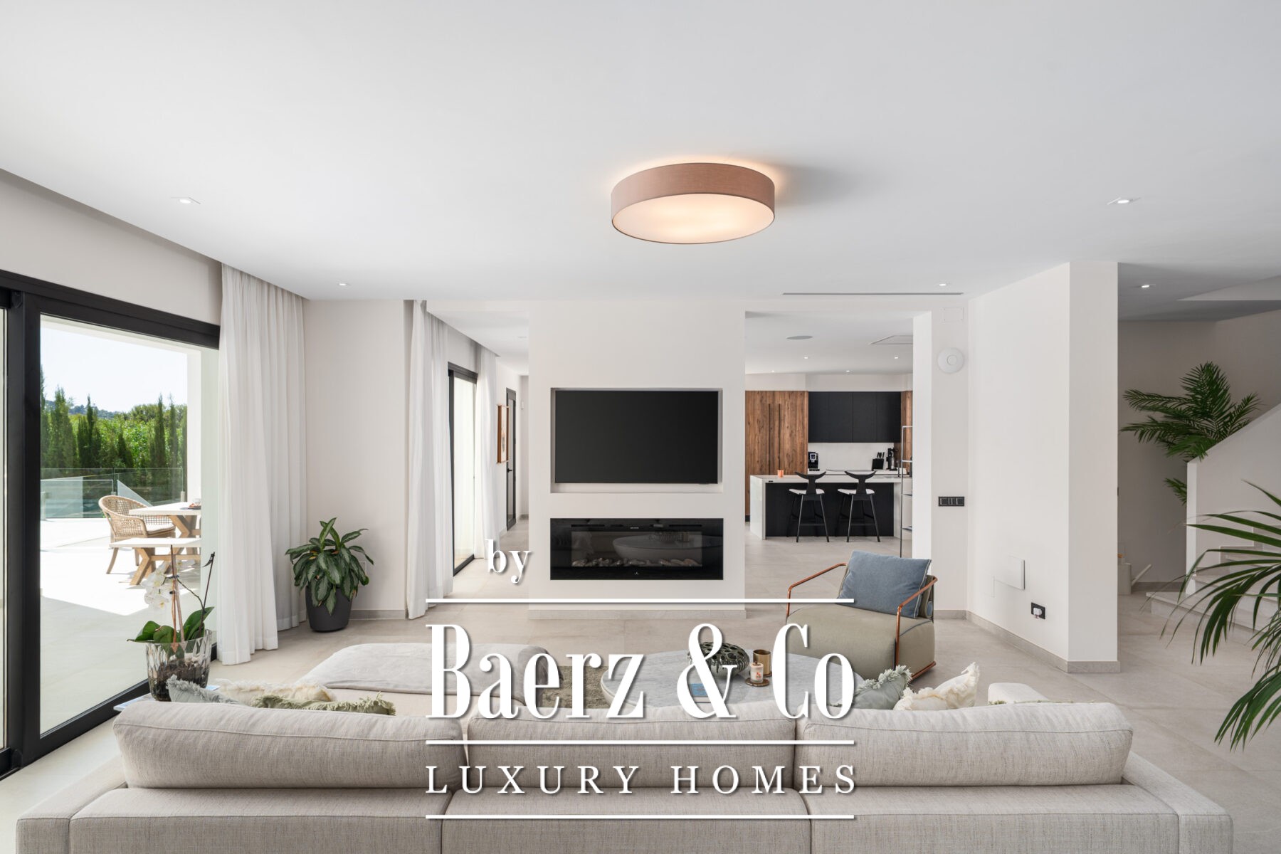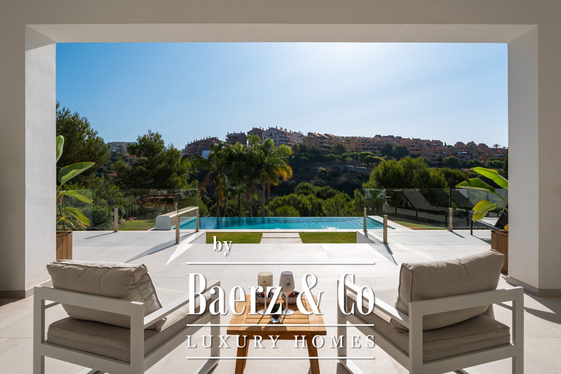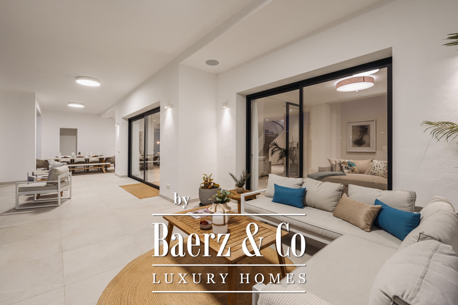 De architectuur van de residentie verenigt hedendaagse helderheid met warmte: keramische steen en houtafwerking zorgen voor een verfijnde sfeer. Miele-apparatuur, zonnepanelen, elektrische rolluiken en een geavanceerd irrigatiesysteem onderstrepen de duurzame details. Vanuit alle slaapkamers en leefruimtes openen terrassen naar het overdekte zwembad, de buitenbarbecue en de sauna, terwijl het panoramisch uitzicht op de golfbaan en de Middellandse Zee steeds het decor vormt.