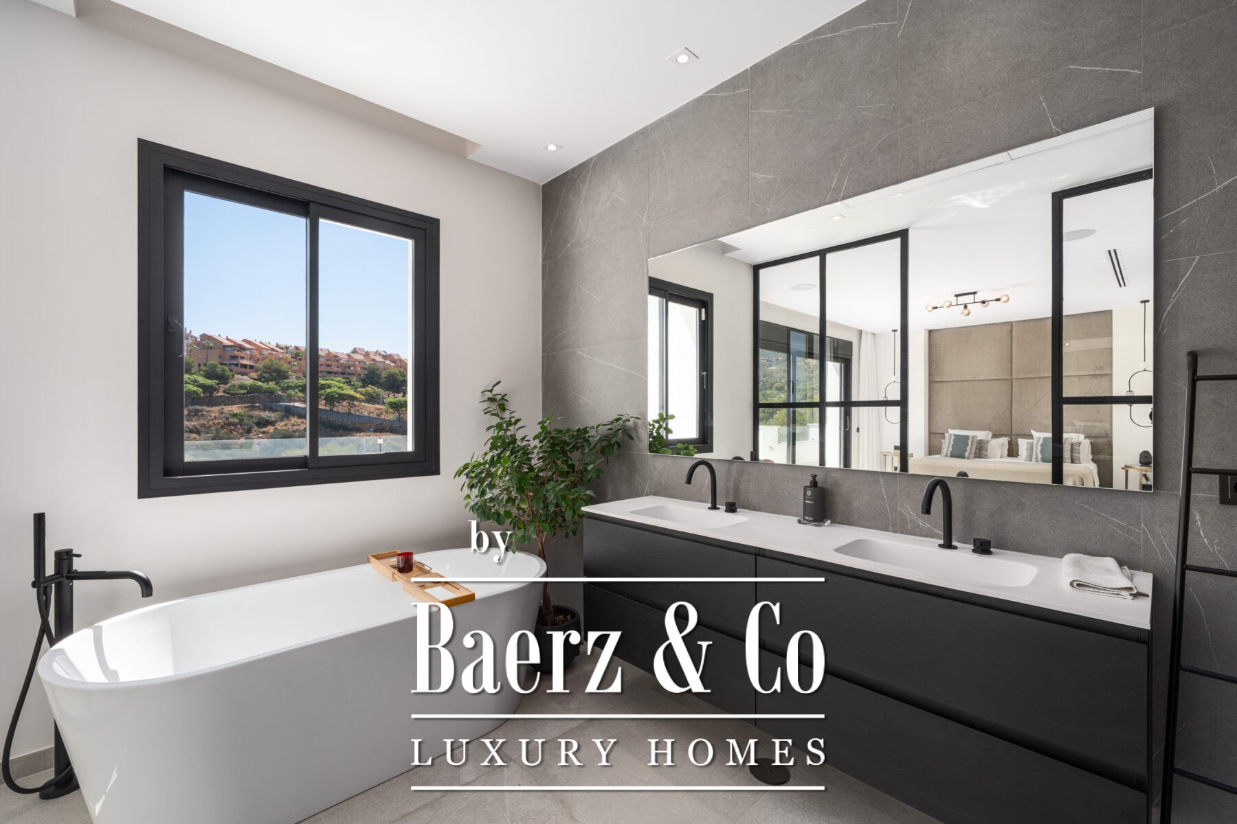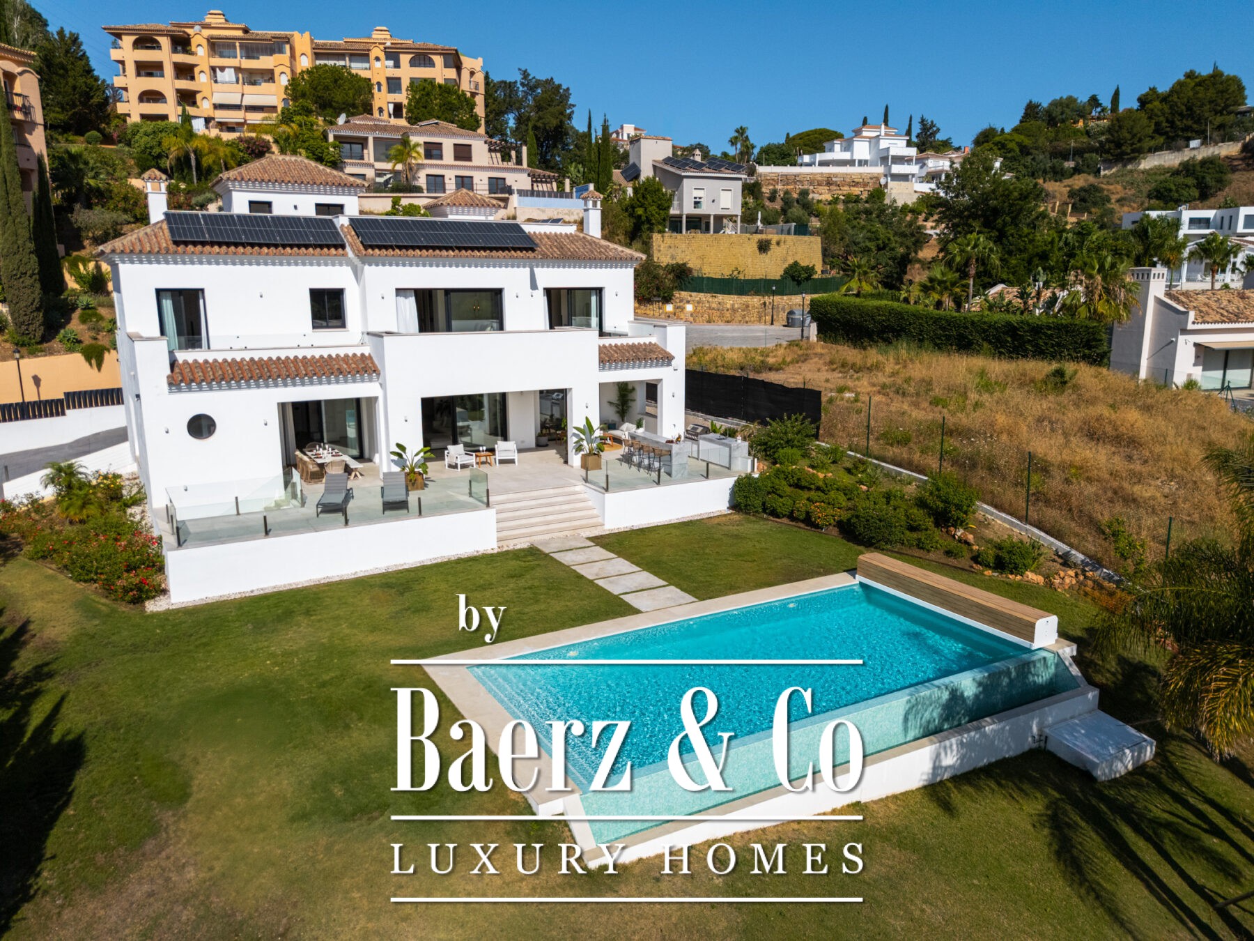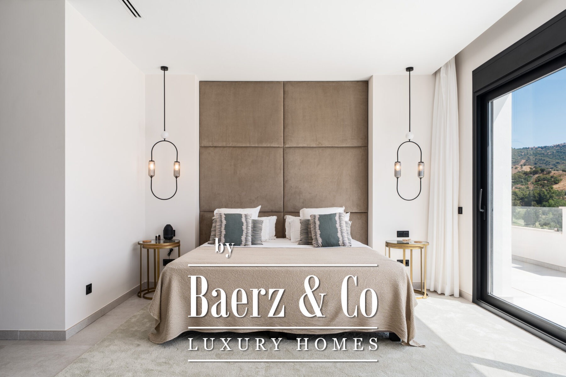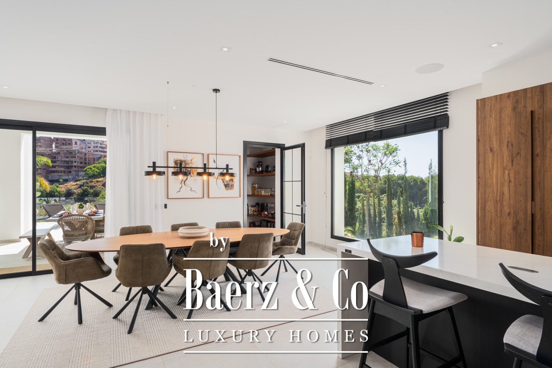 De architectuur van de residentie verenigt hedendaagse helderheid met warmte: keramische steen en houtafwerking zorgen voor een verfijnde sfeer. Miele-apparatuur, zonnepanelen, elektrische rolluiken en een geavanceerd irrigatiesysteem onderstrepen de duurzame details. Vanuit alle slaapkamers en leefruimtes openen terrassen naar het overdekte zwembad, de buitenbarbecue en de sauna, terwijl het panoramisch uitzicht op de golfbaan en de Middellandse Zee steeds het decor vormt.