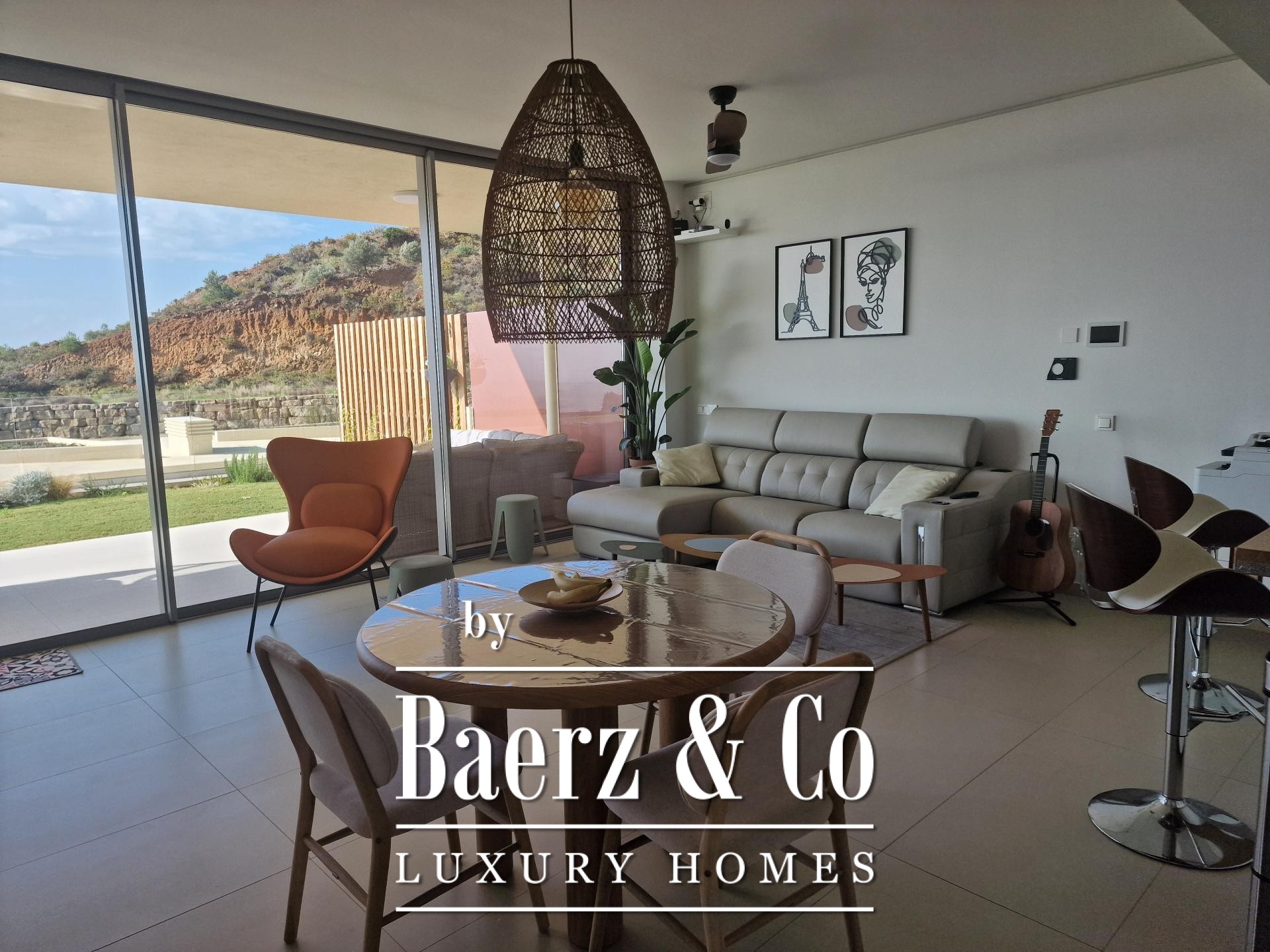Een overdekt terras van 60 m² loopt naadloos over in een privé tuin van gelijke omvang. Hier vormt zich een serene setting om op elk moment van het dagdeel te genieten van het onbelemmerde vergezicht. Binnen worden strakke architectonische lijnen samengebracht in een royale woonkamer die elegant overgaat in een volledig uitgeruste open keuken. Hoogwaardige afwerkingen en materialen bepalen het ingetogen luxegevoel.