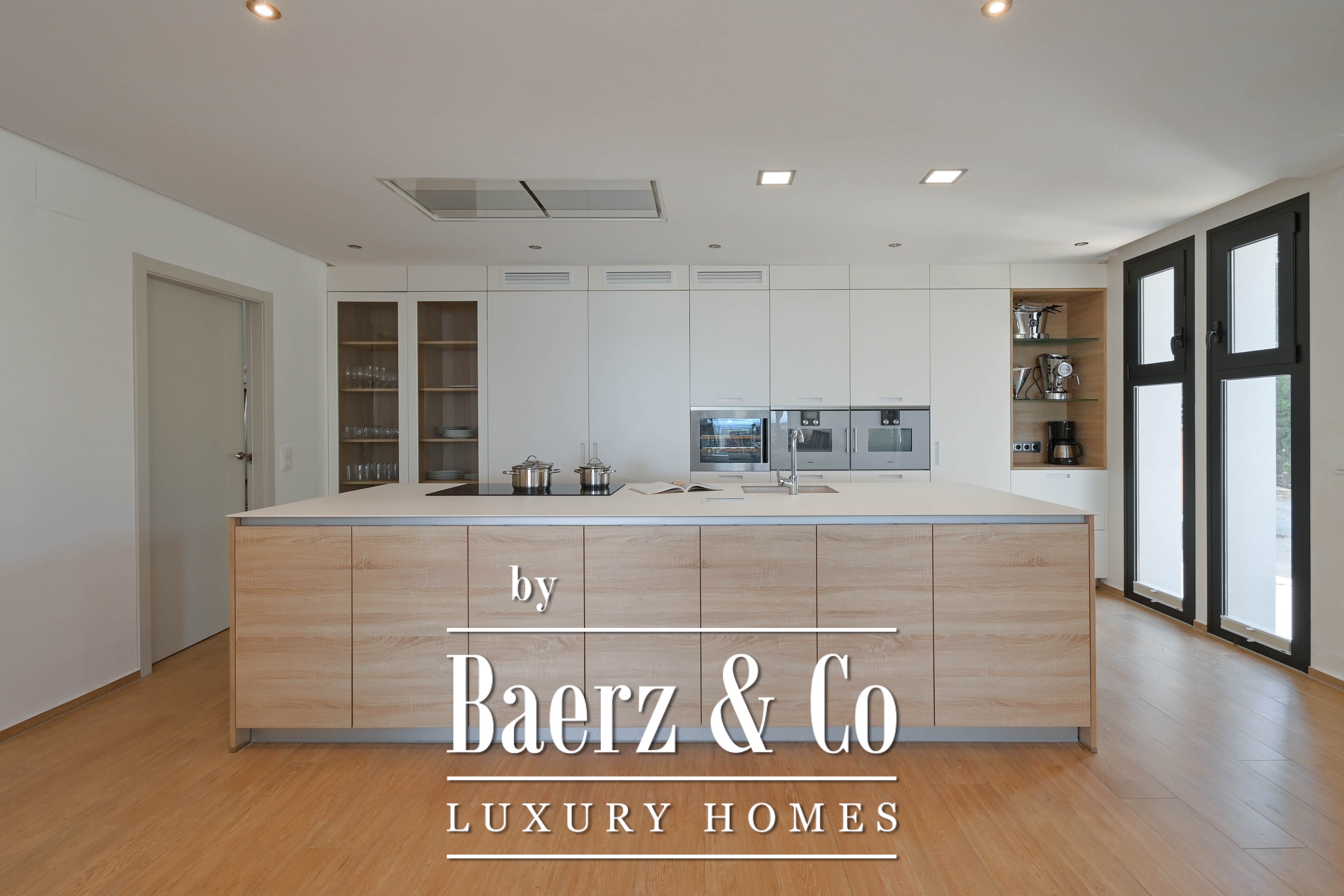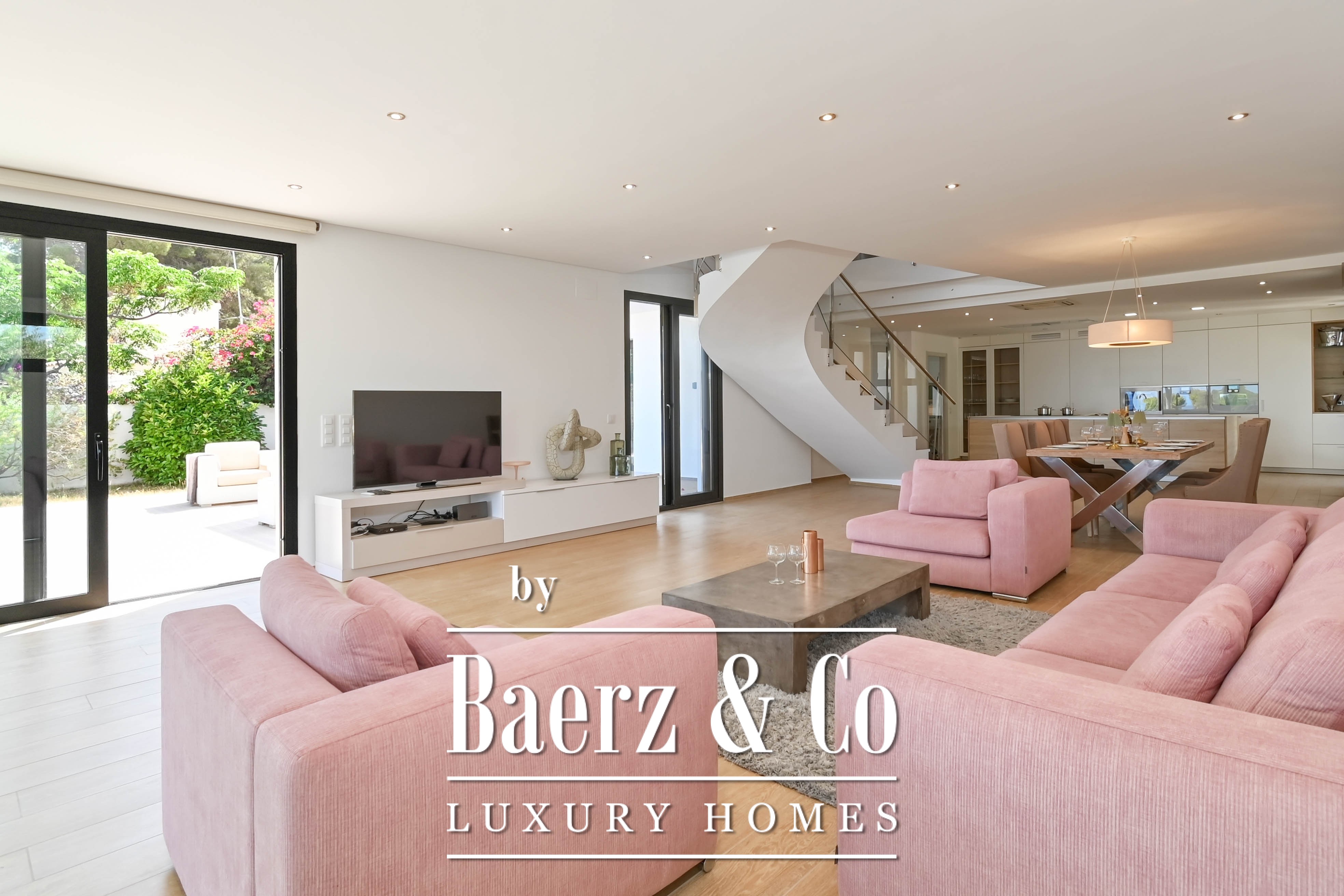 De villa beschikt over een open keuken die naadloos overgaat in de lichtrijke leefruimte. Grote raampartijen zorgen voor een natuurlijke verbinding tussen binnen en buiten, en laten het mediterrane licht royaal binnenstromen.